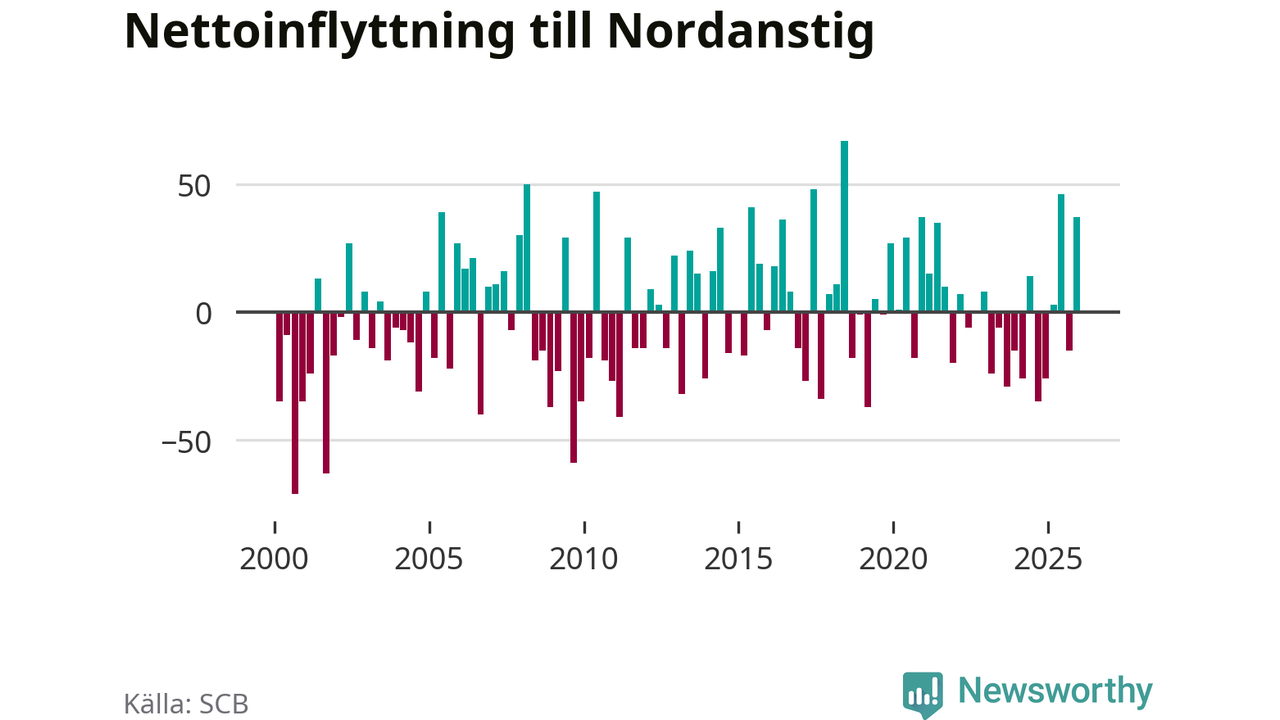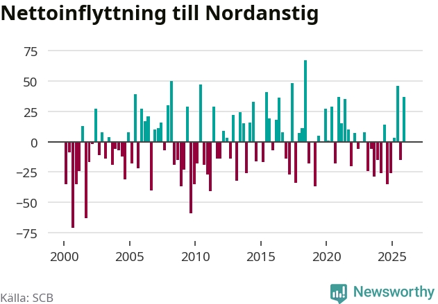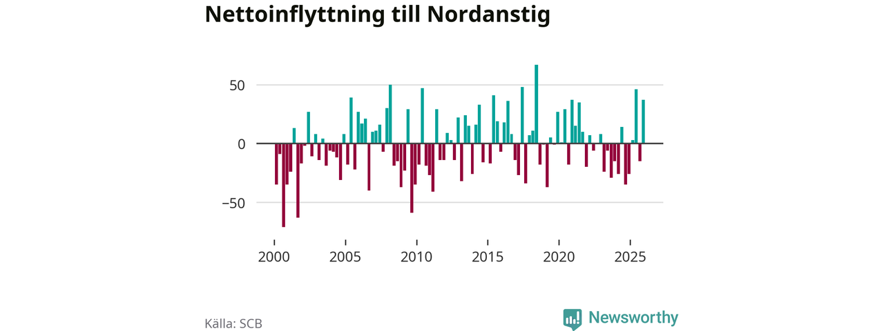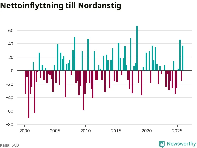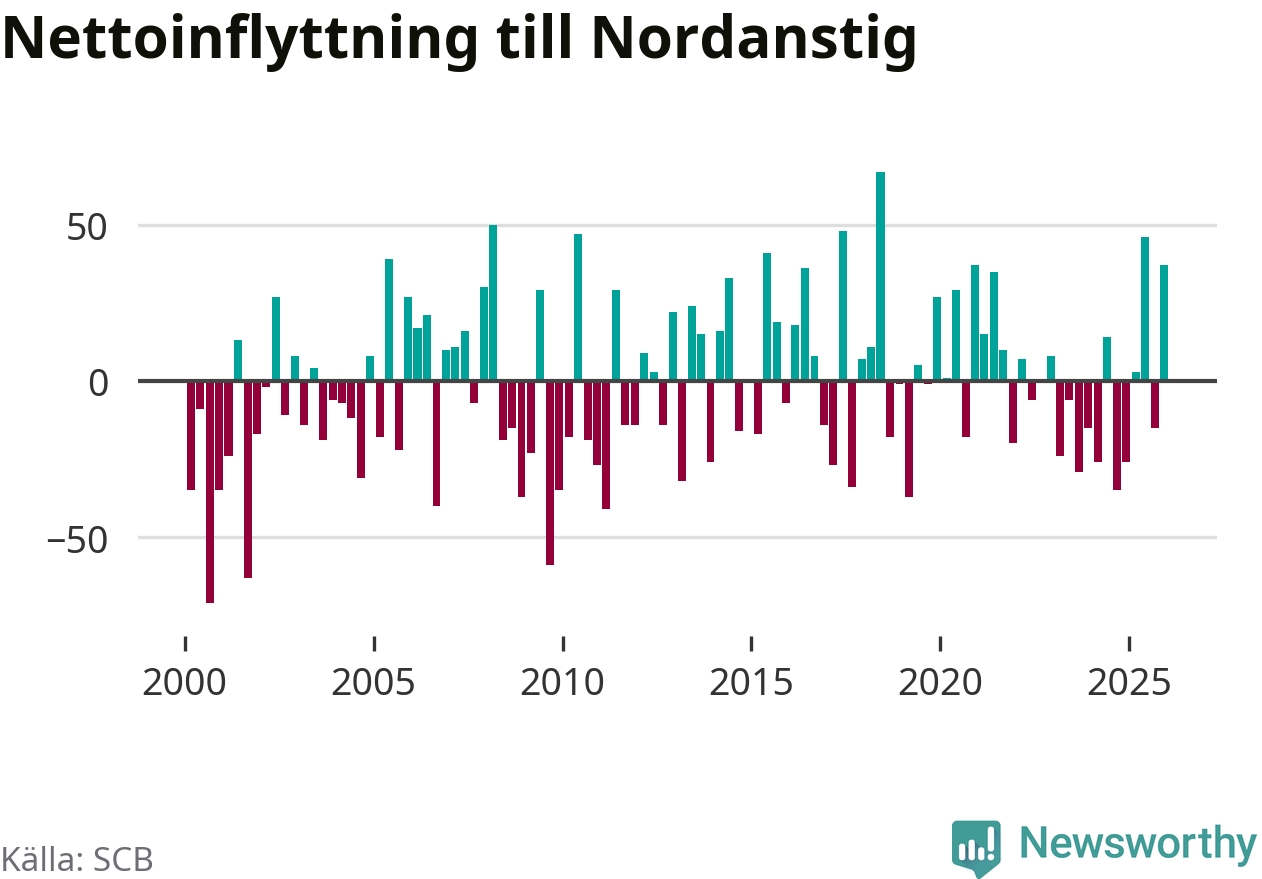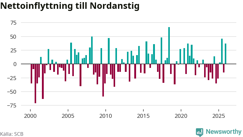 Under fjärde kvartalet 2025 flyttade 149 personer till kommunen medan 112 personer flyttade därifrån. Sedan seklets början har Nordanstig haft ungefär lika många kvartal med positivt flyttnetto som negativt, inklusive det senaste kvartalet.