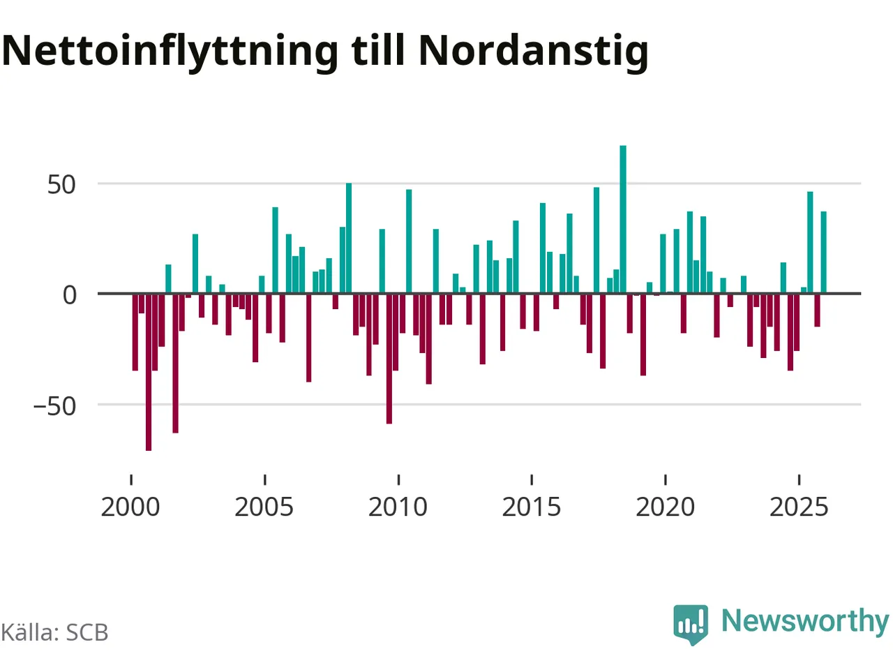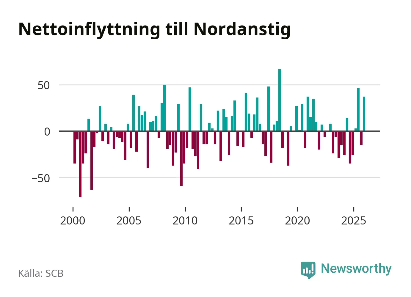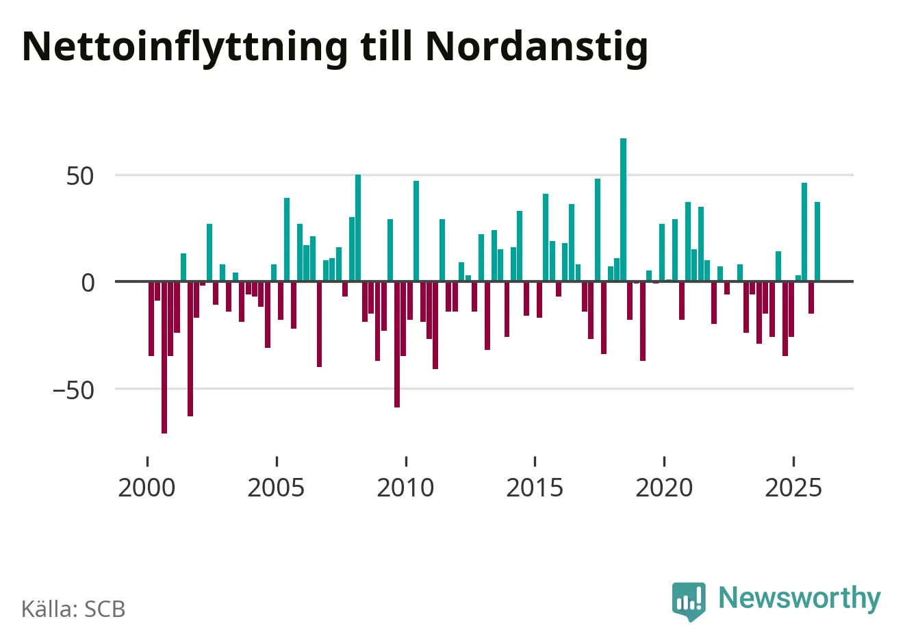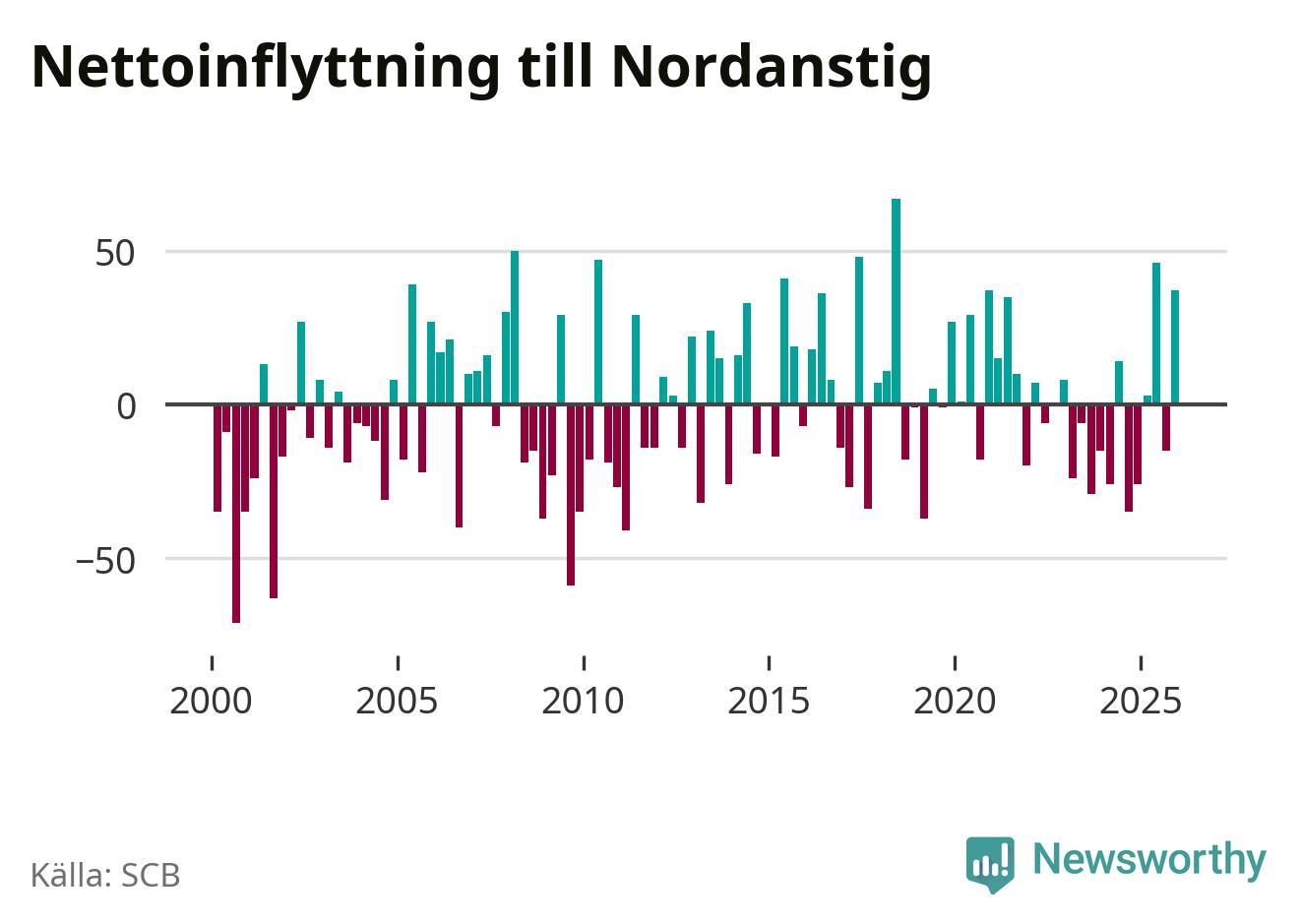 Under fjärde kvartalet 2025 flyttade 149 personer till kommunen medan 112 personer flyttade därifrån. Sedan seklets början har Nordanstig haft ungefär lika många kvartal med positivt flyttnetto som negativt, inklusive det senaste kvartalet.