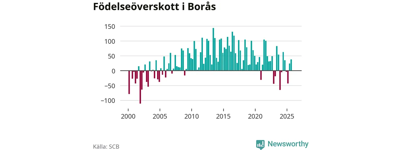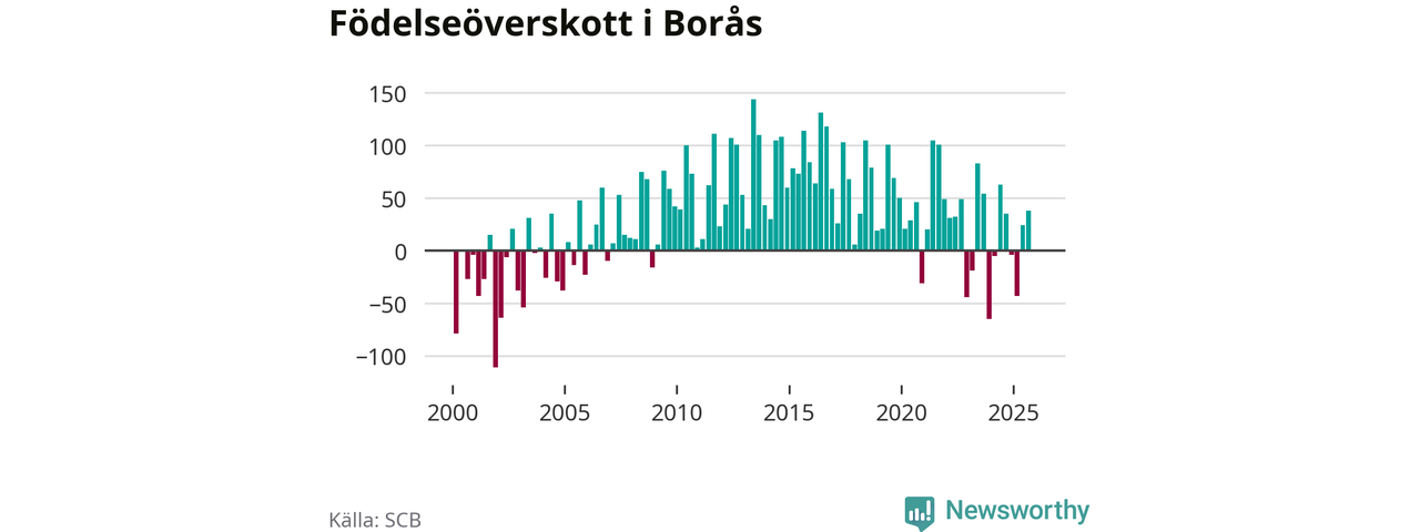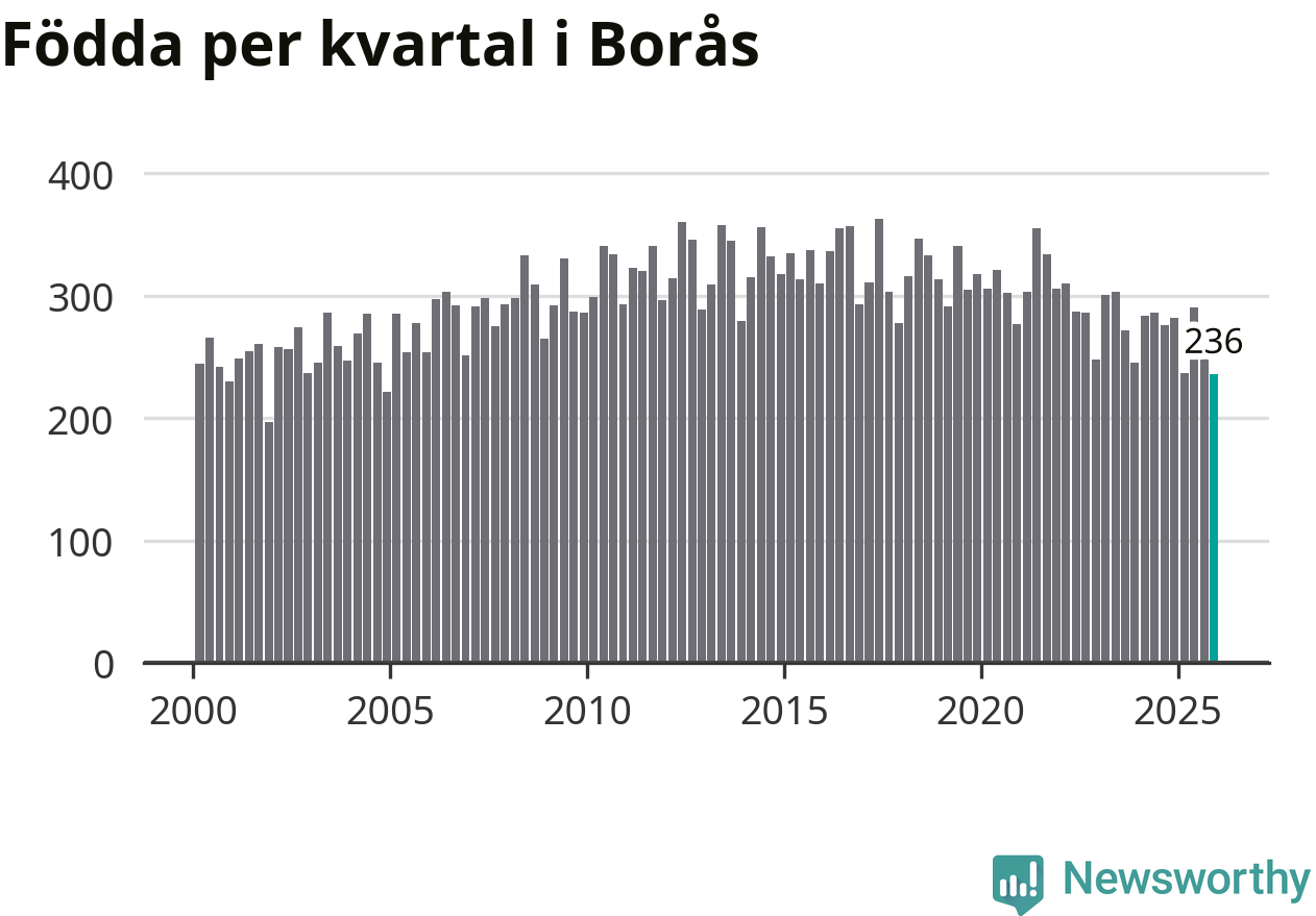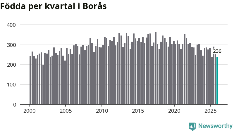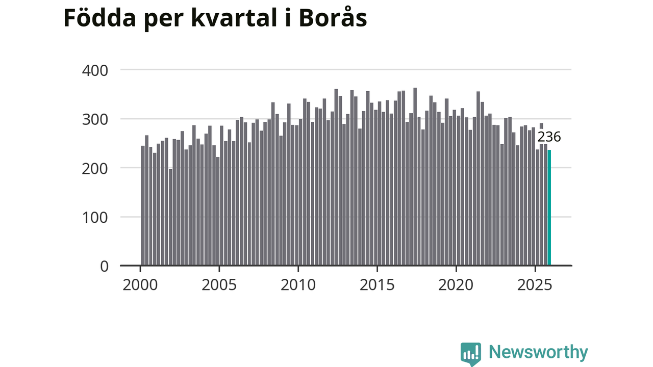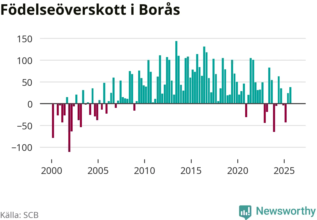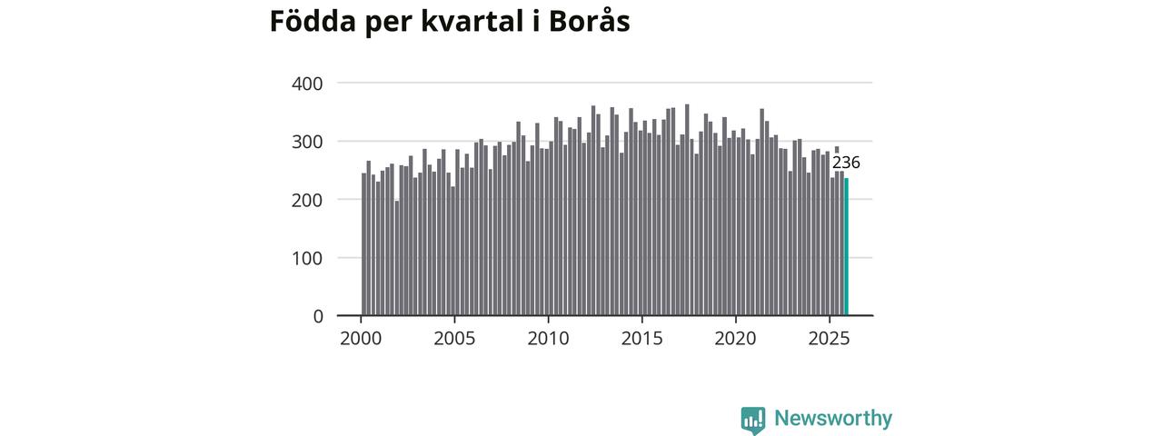 Enligt SCB:s siffror föddes 236 barn i Borås under det senaste kvartalet. Samtidigt avled 237 personer. Skillnaden mellan antal födda och döda är så liten att det inte går att säga om det beror på något annat än SCB:s röjandeskydd. Kommunen har nästan alltid haft positivt födelsenetto tidigare.