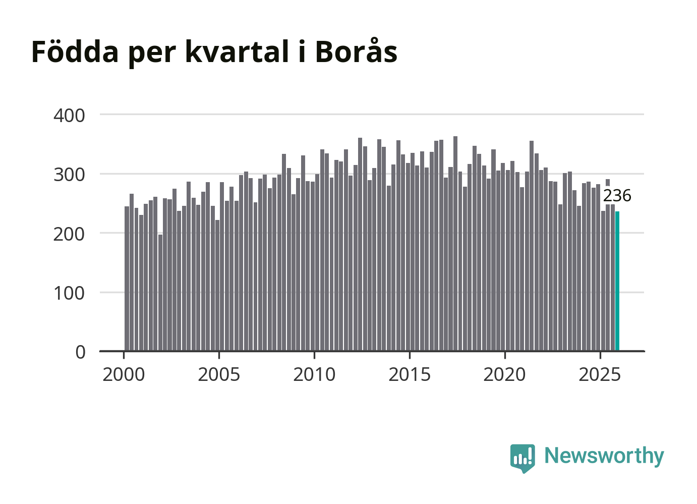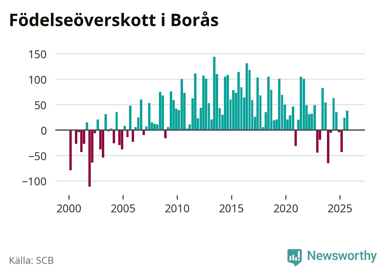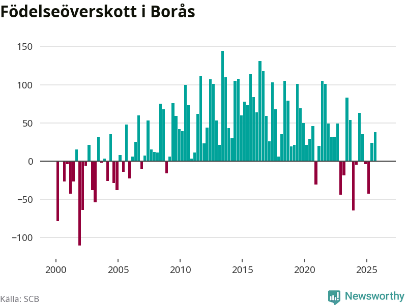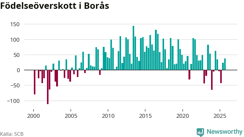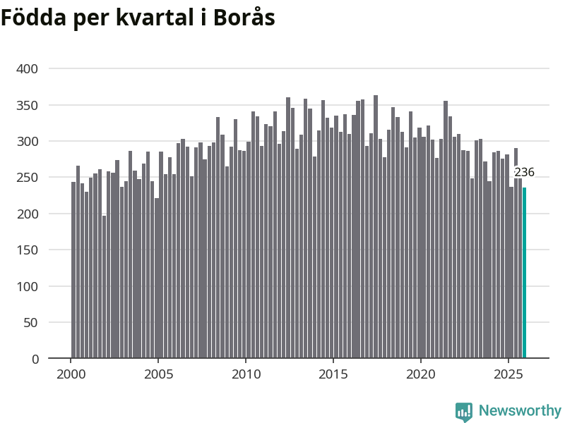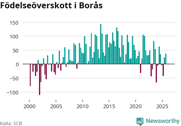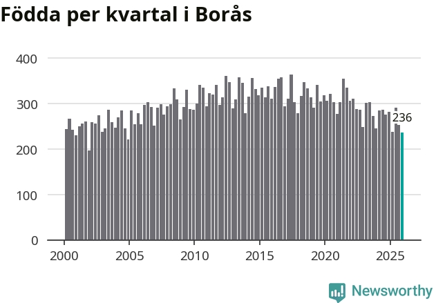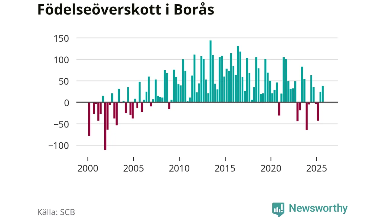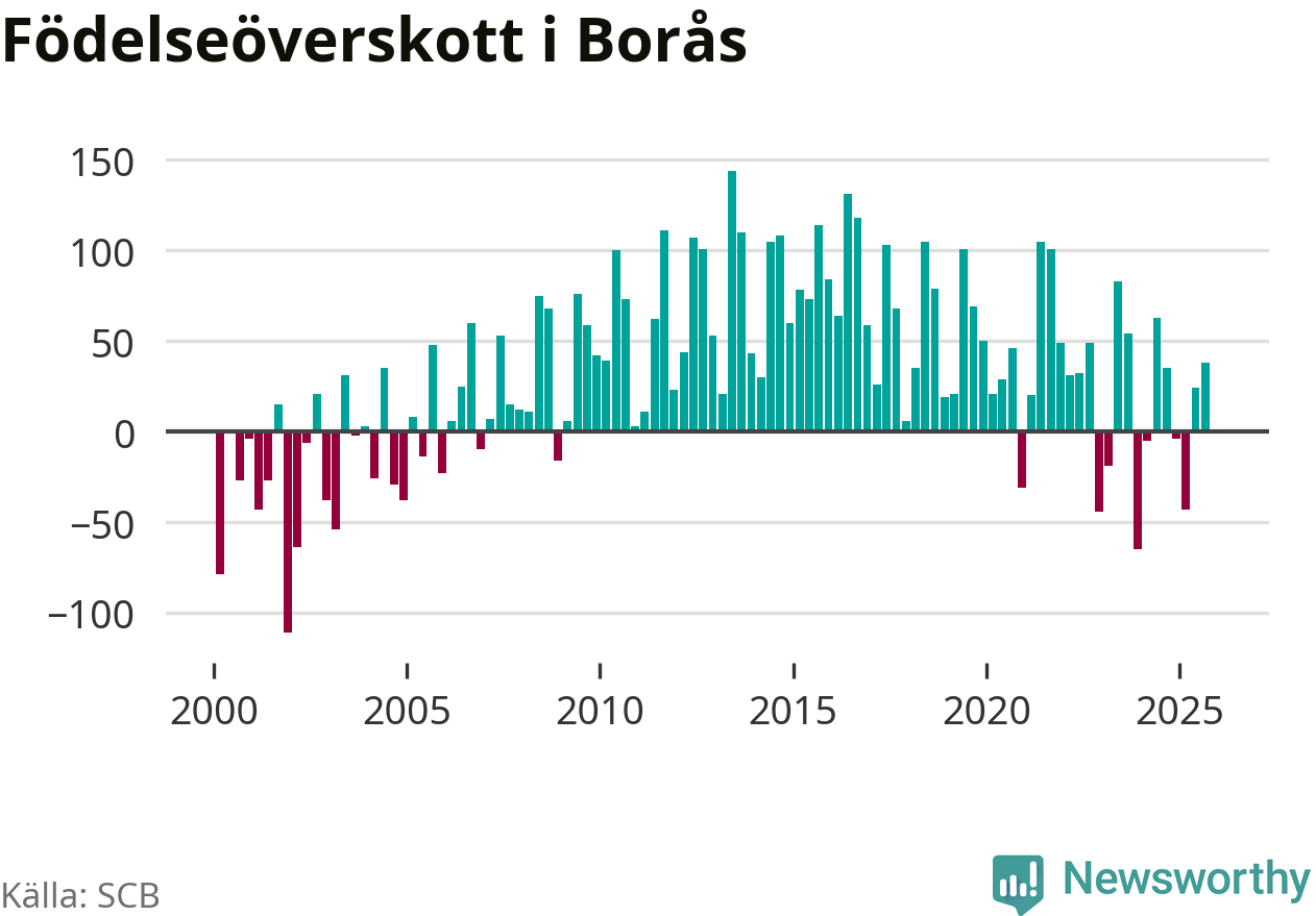 Enligt SCB:s siffror föddes 236 barn i Borås under det senaste kvartalet. Samtidigt avled 237 personer. Skillnaden mellan antal födda och döda är så liten att det inte går att säga om det beror på något annat än SCB:s röjandeskydd. Kommunen har nästan alltid haft positivt födelsenetto tidigare.