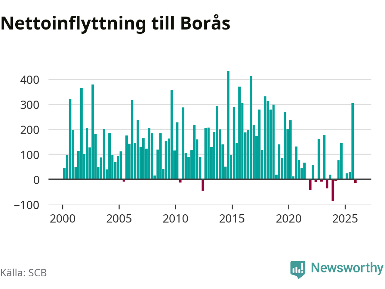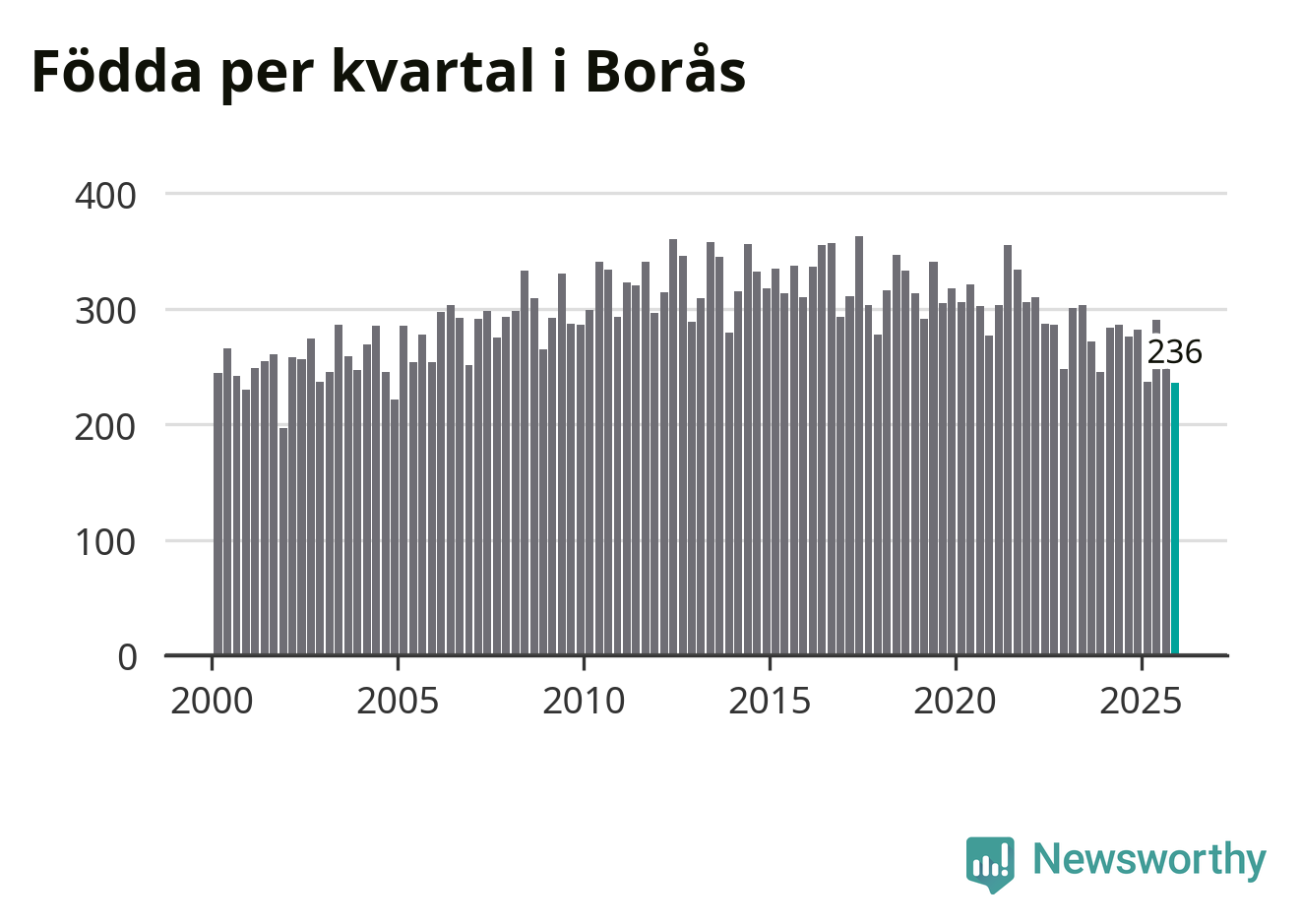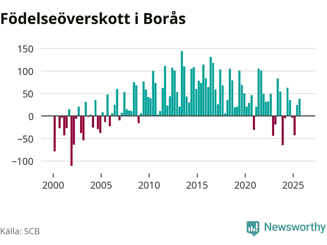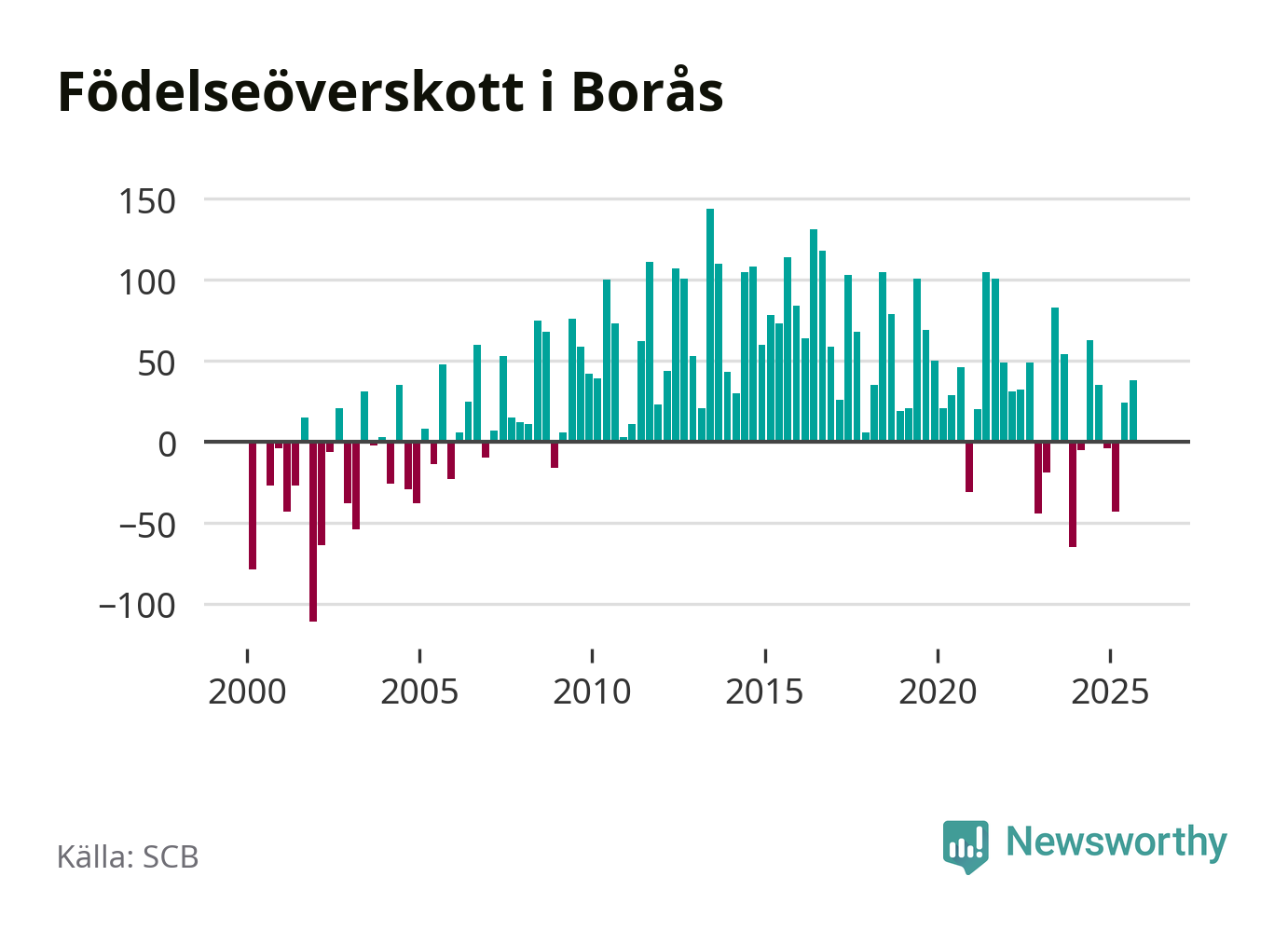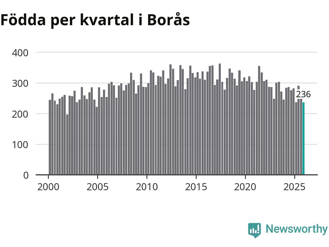 Enligt SCB:s siffror föddes 236 barn i Borås under det senaste kvartalet. Samtidigt avled 237 personer. Skillnaden mellan antal födda och döda är så liten att det inte går att säga om det beror på något annat än SCB:s röjandeskydd. Kommunen har nästan alltid haft positivt födelsenetto tidigare.