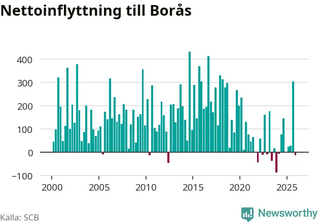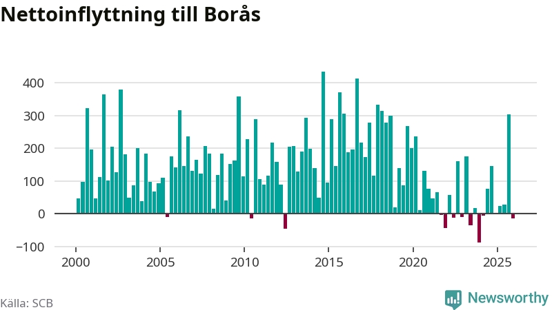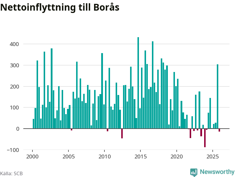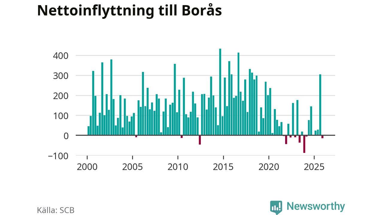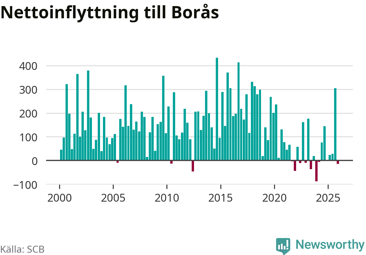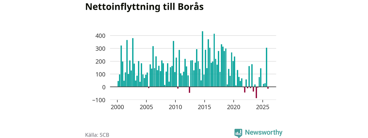 Under fjärde kvartalet 2025 flyttade 1 230 personer till kommunen medan 1 244 personer flyttade därifrån. Sedan seklets början har Borås haft ett positivt flyttnetto under nästan alla kvartal.