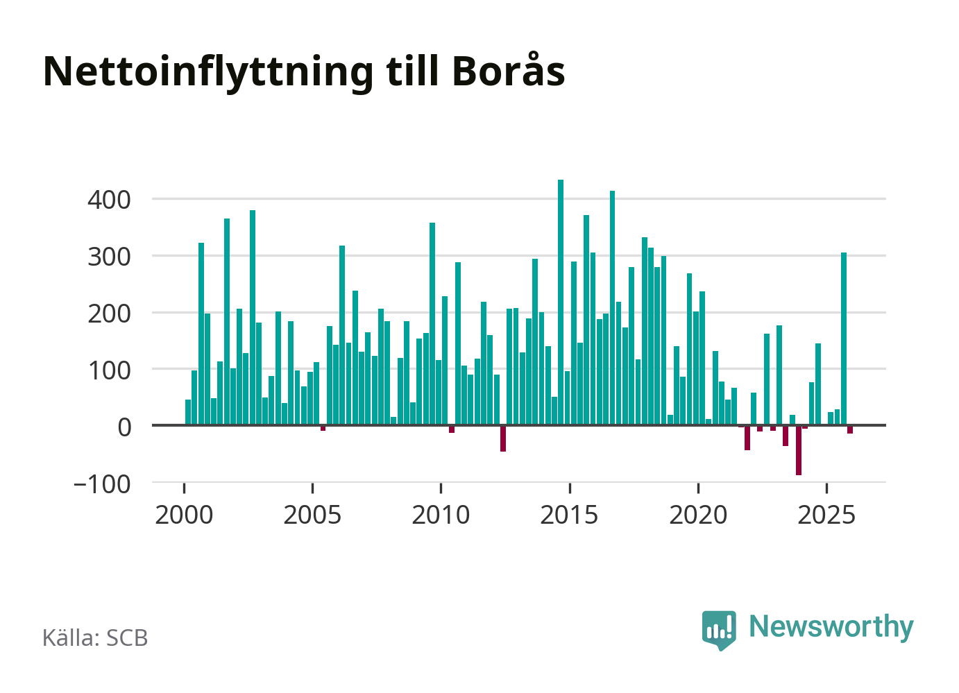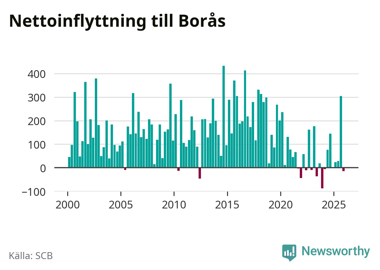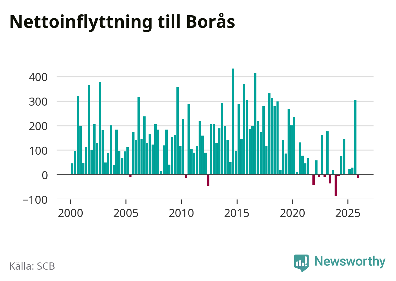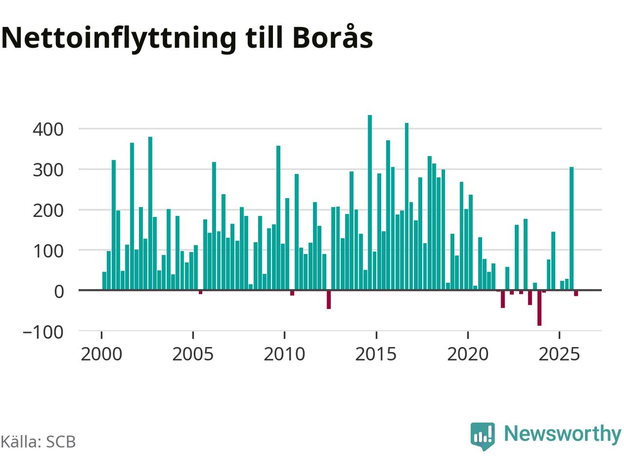 Under fjärde kvartalet 2025 flyttade 1 230 personer till kommunen medan 1 244 personer flyttade därifrån. Sedan seklets början har Borås haft ett positivt flyttnetto under nästan alla kvartal.