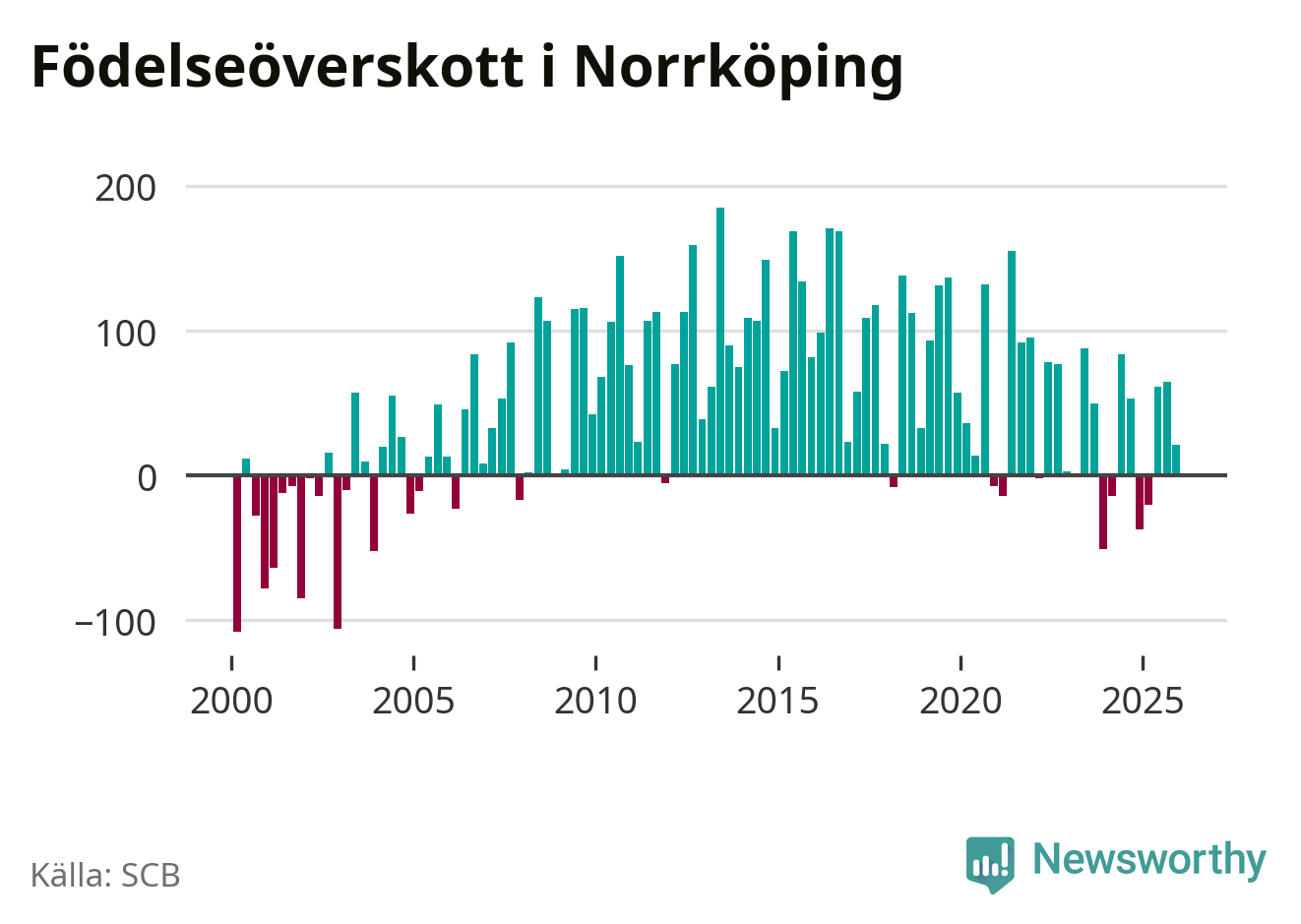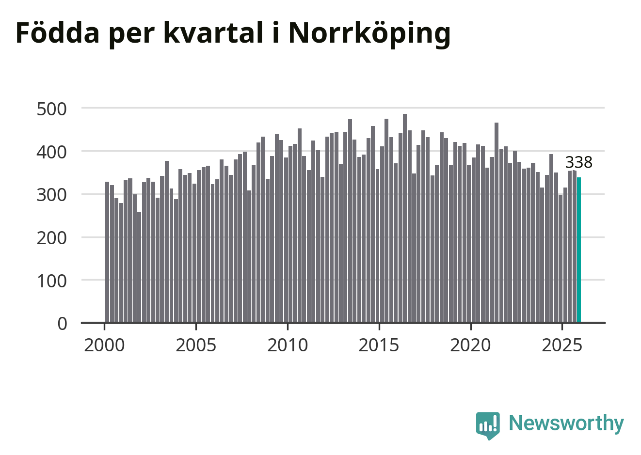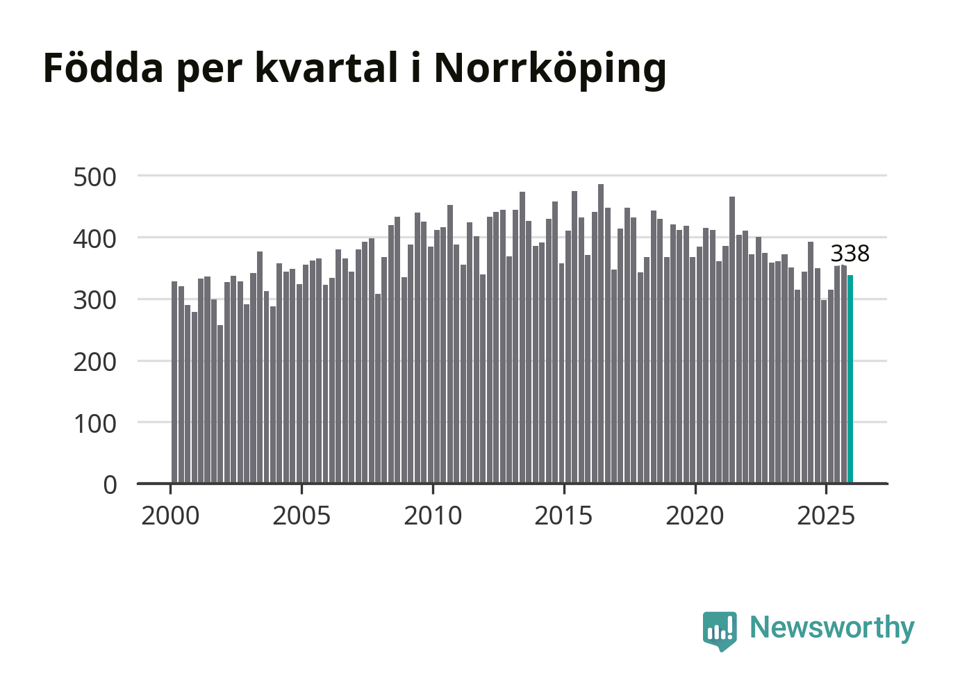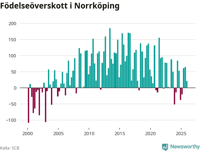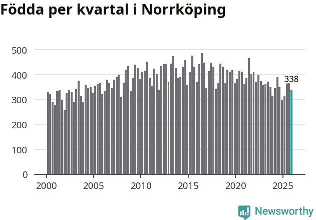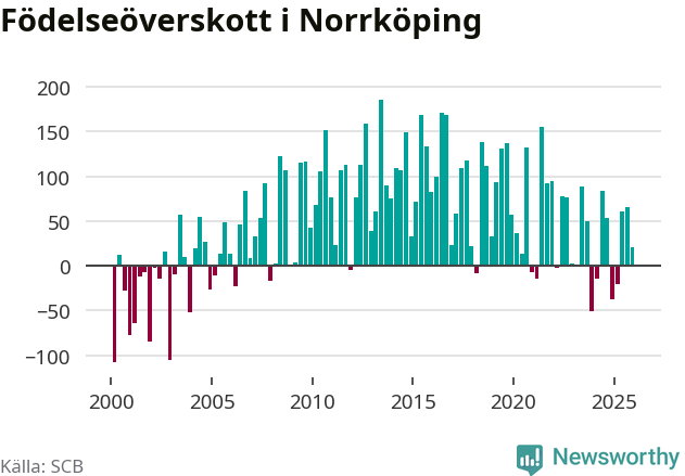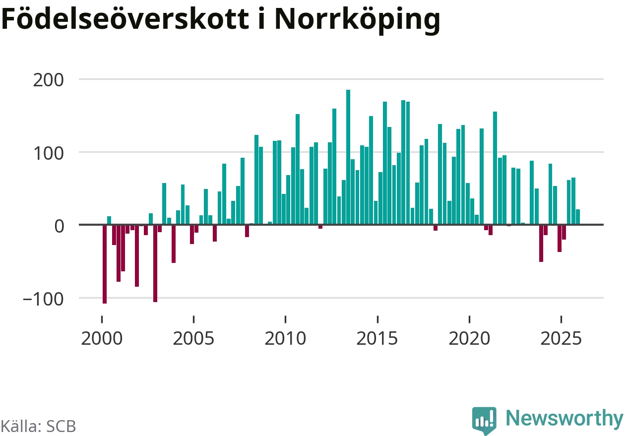 Enligt SCB:s siffror föddes 338 barn i Norrköping under det senaste kvartalet. Samtidigt avled 317 personer. Norrköping hade alltså ett positivt födelsenetto, vilket kommunen historiskt sett nästan alltid har haft.