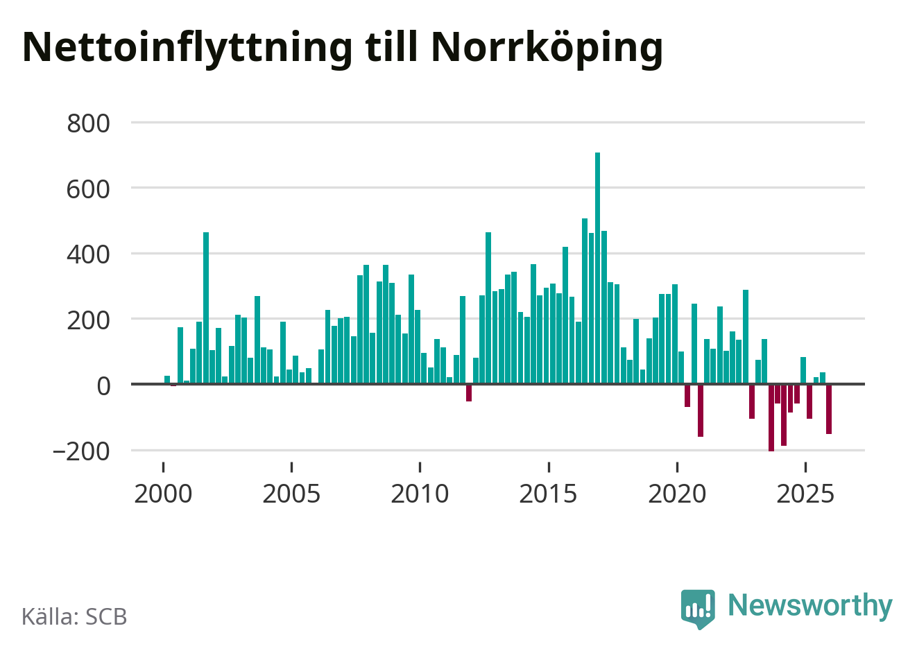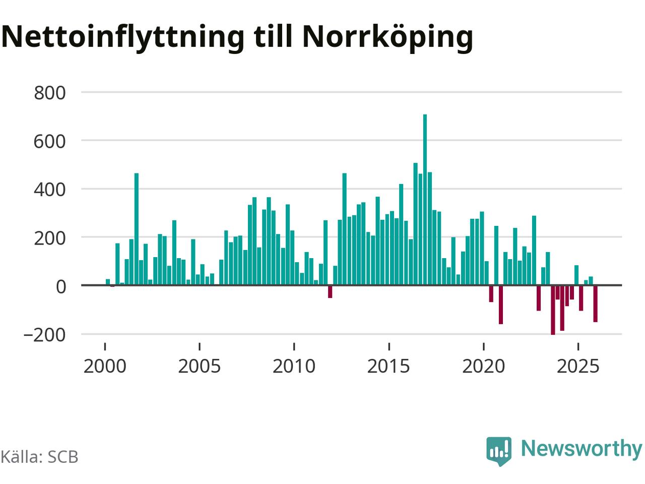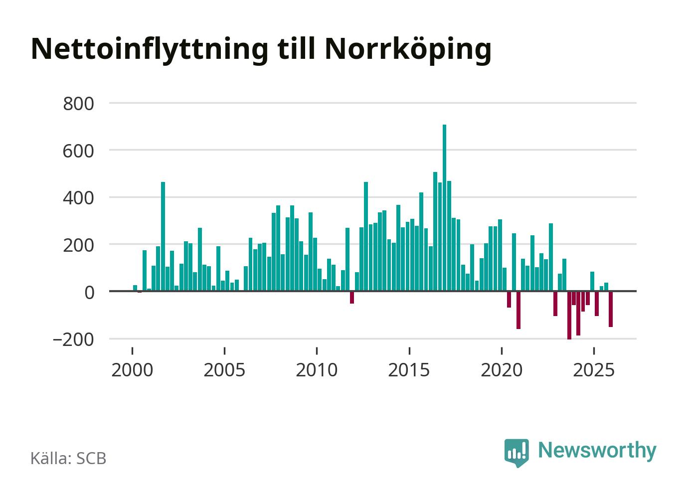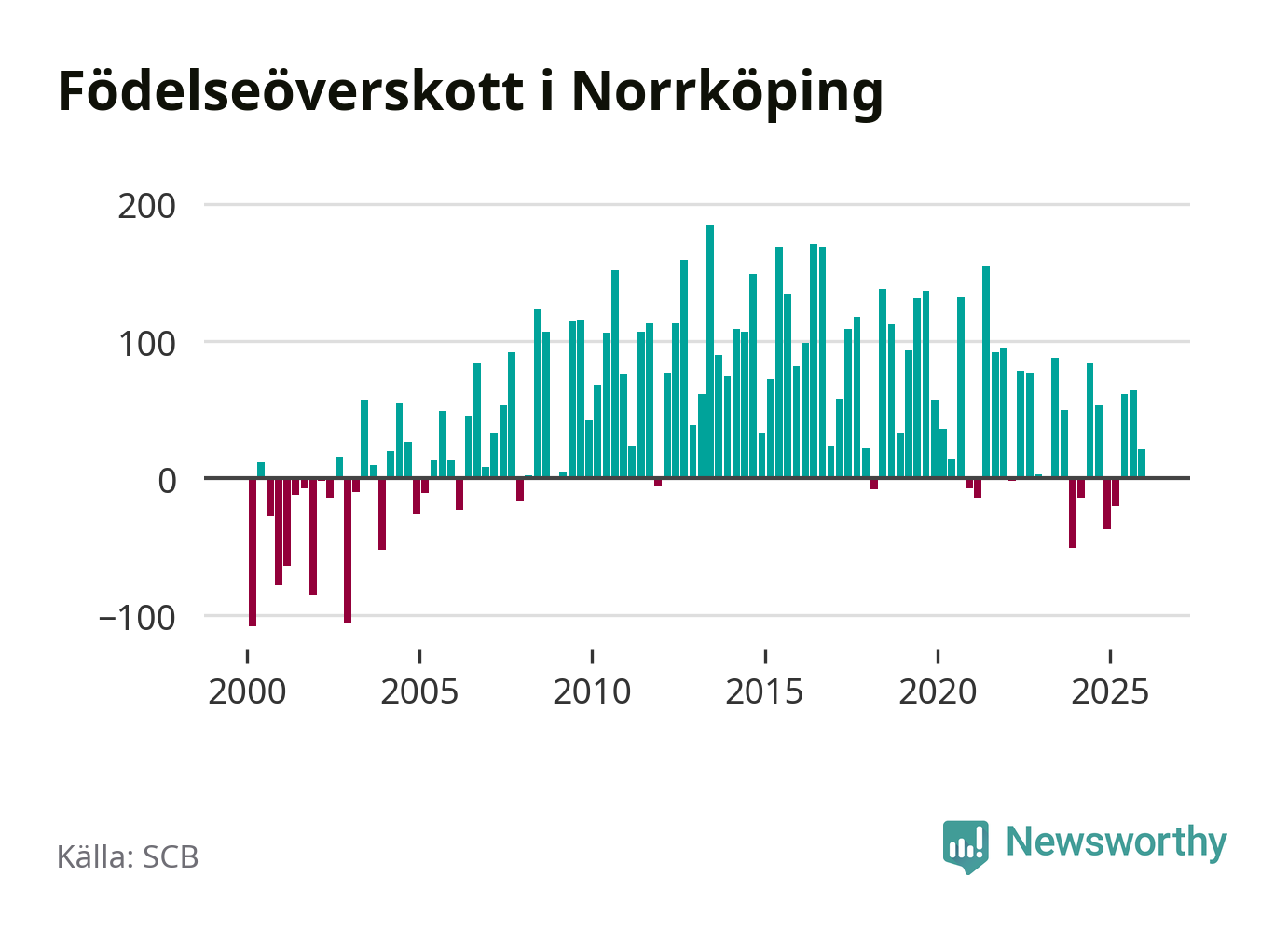 Enligt SCB:s siffror föddes 338 barn i Norrköping under det senaste kvartalet. Samtidigt avled 317 personer. Norrköping hade alltså ett positivt födelsenetto, vilket kommunen historiskt sett nästan alltid har haft.