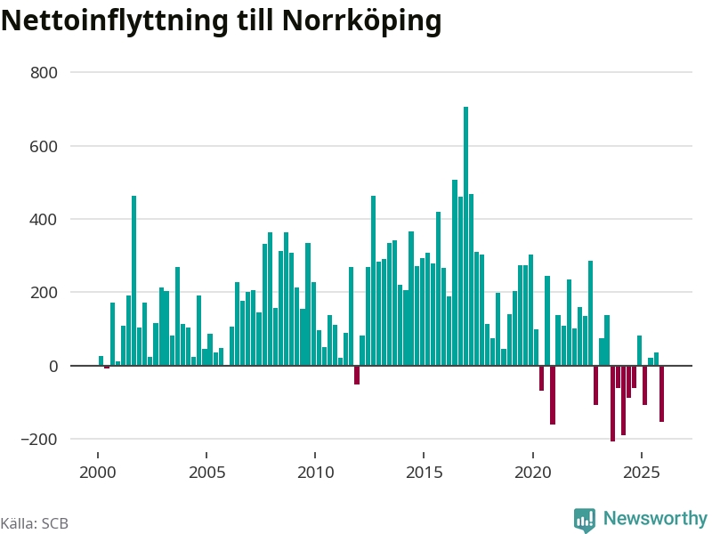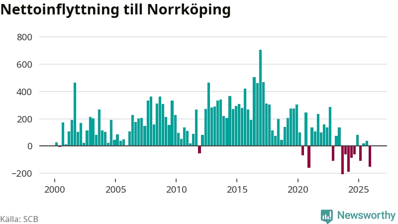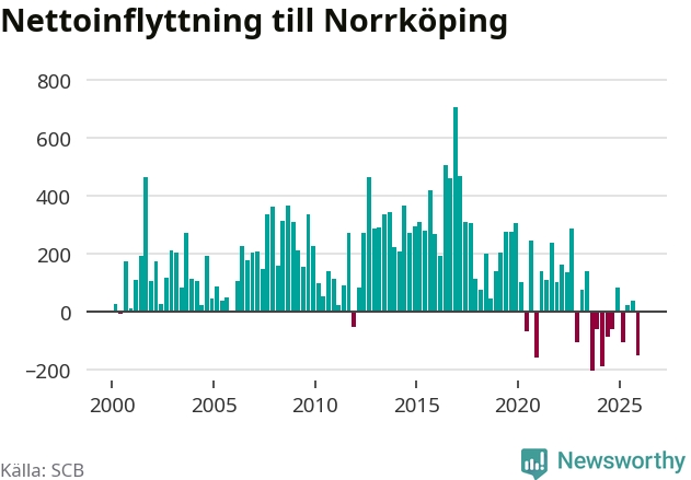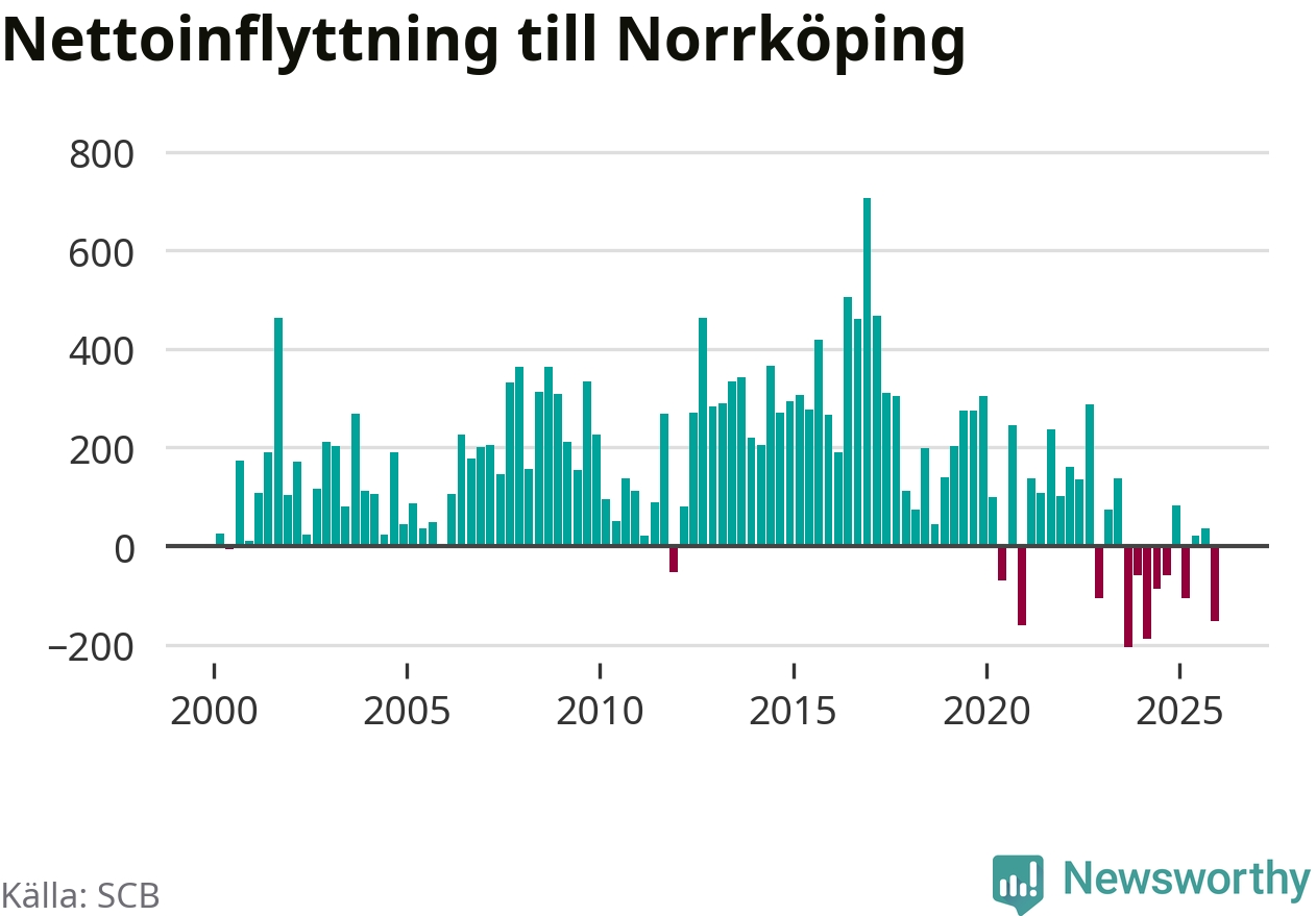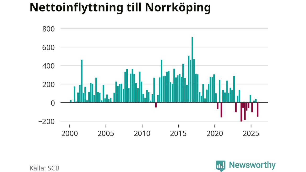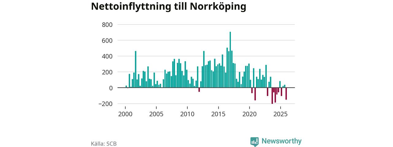 Under fjärde kvartalet 2025 flyttade 1 314 personer till kommunen medan 1 467 personer flyttade därifrån. Sedan seklets början har Norrköping oftast haft ett positivt flyttnetto.