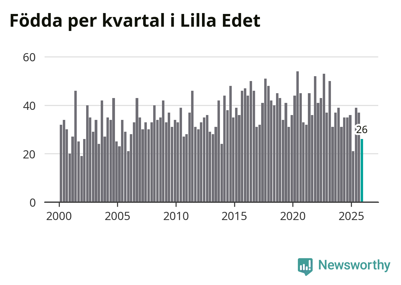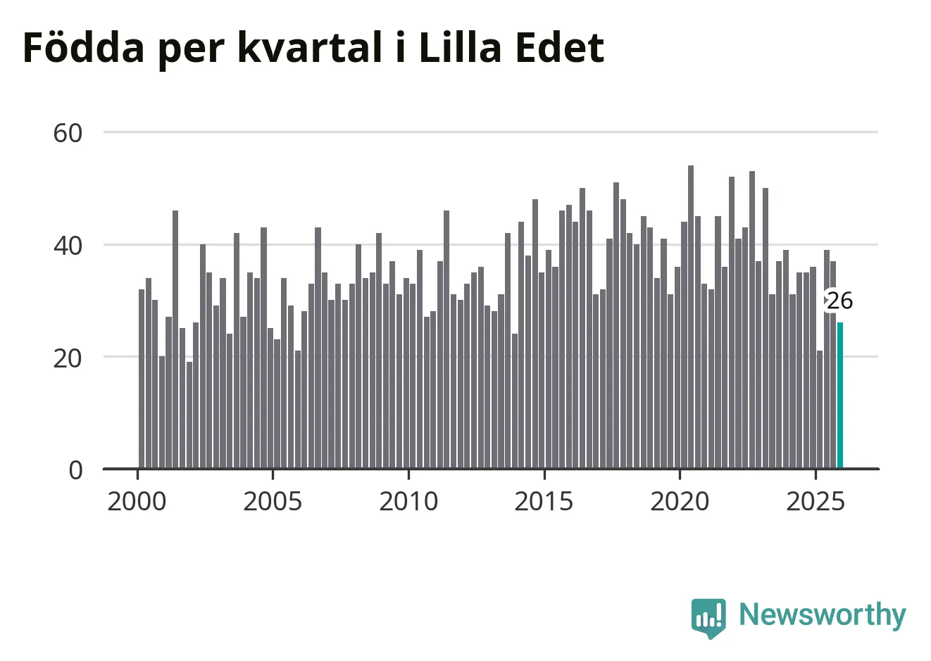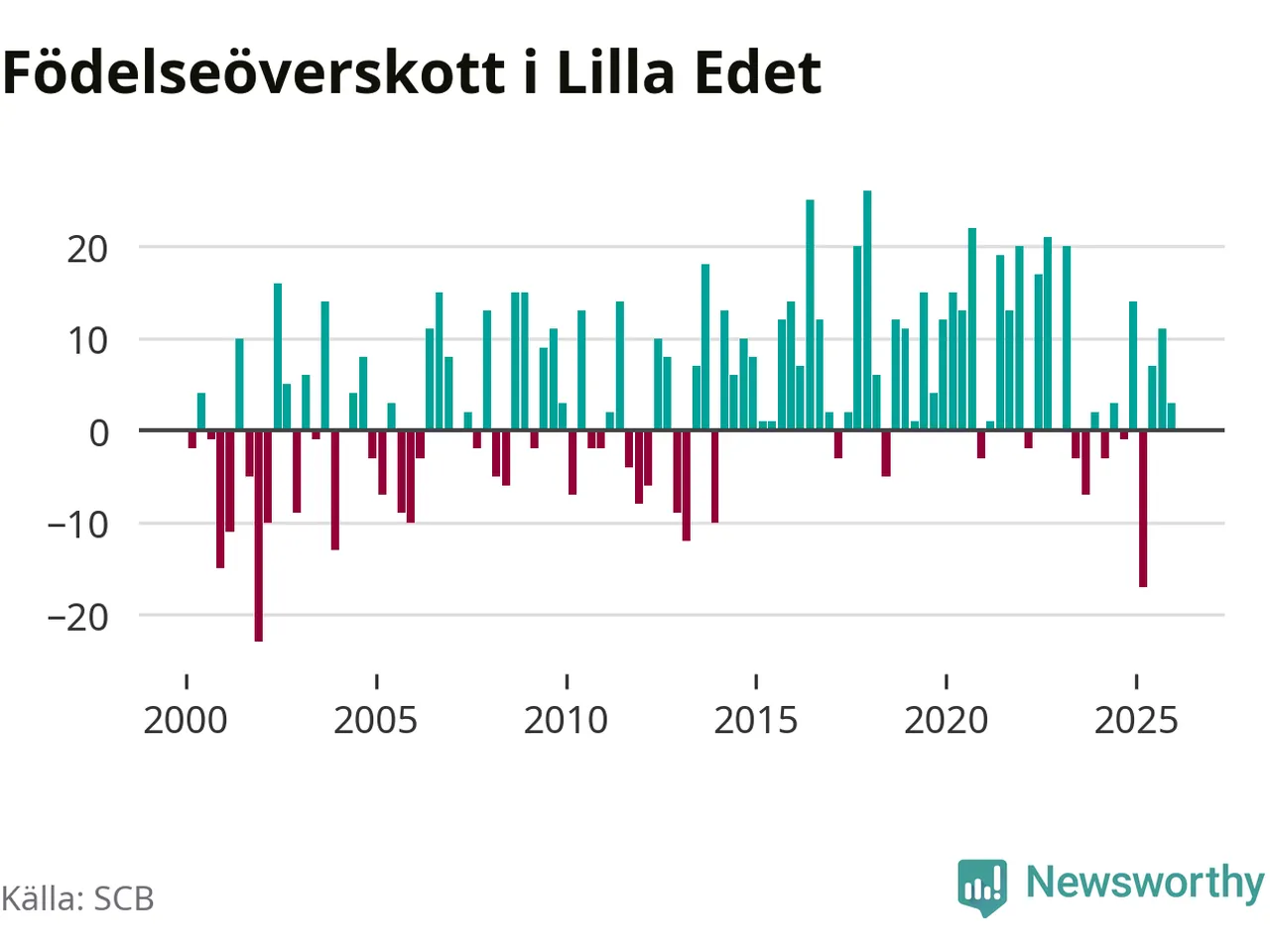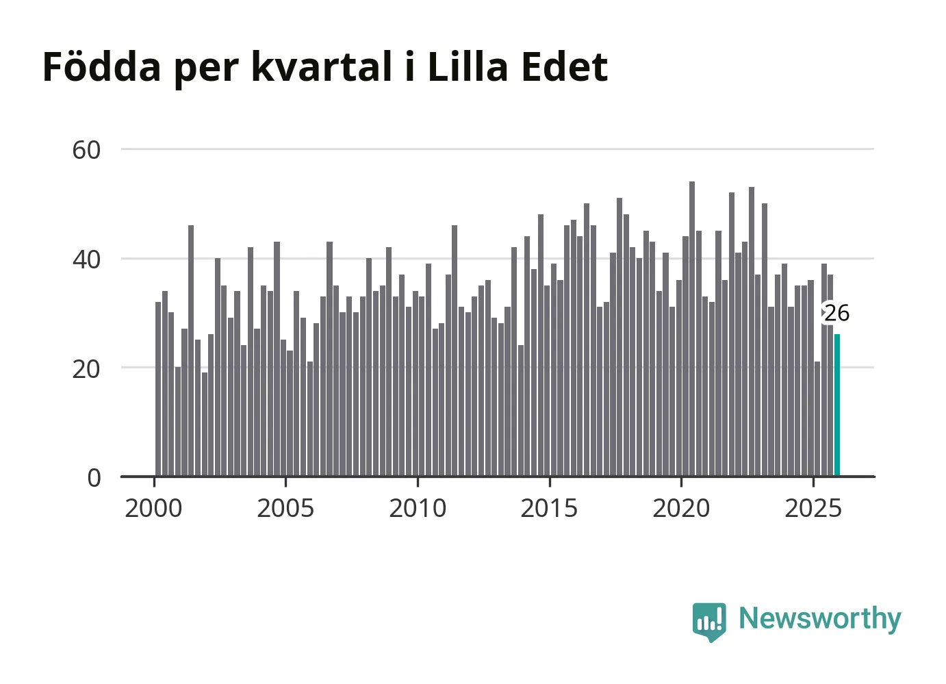Enligt SCB:s siffror föddes 26 barn i Lilla Edet under det senaste kvartalet. Samtidigt avled relativt få – 23 personer. Skillnaden mellan antal födda och döda är så liten att det inte går att säga om det beror på något annat än SCB:s röjandeskydd. Kommunen har oftast haft positivt födelsenetto tidigare.