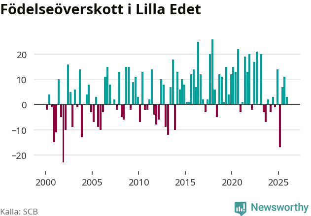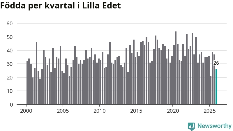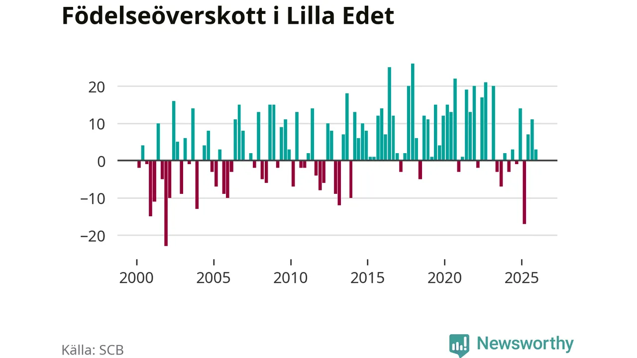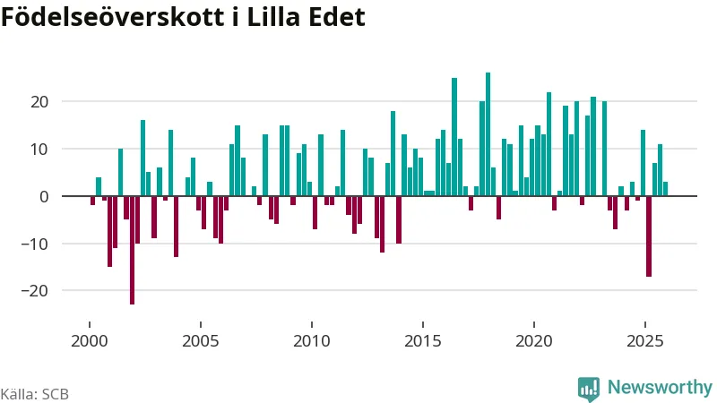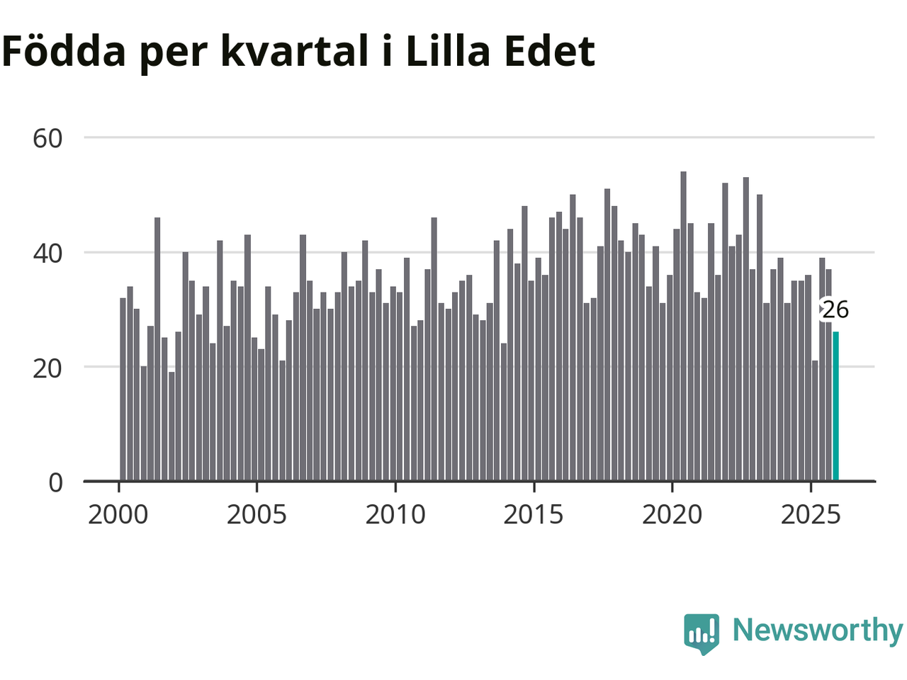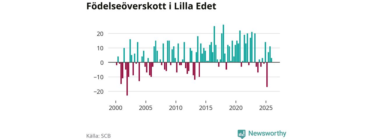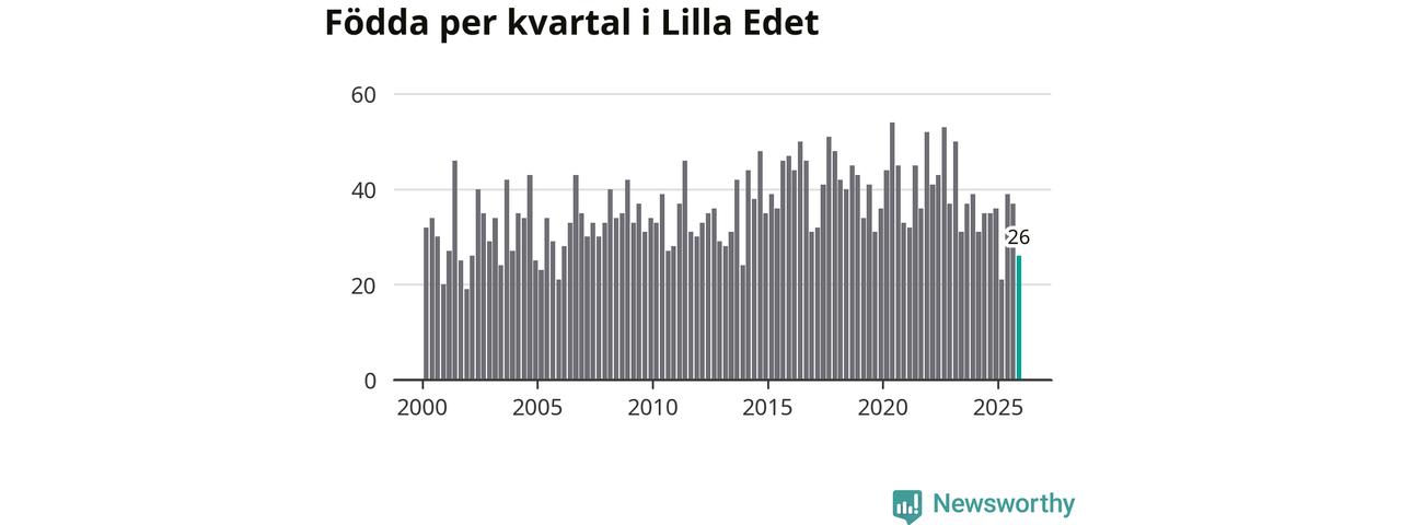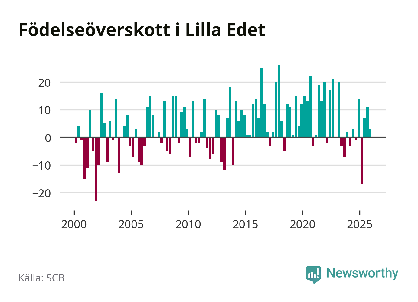 Enligt SCB:s siffror föddes 26 barn i Lilla Edet under det senaste kvartalet. Samtidigt avled relativt få – 23 personer. Skillnaden mellan antal födda och döda är så liten att det inte går att säga om det beror på något annat än SCB:s röjandeskydd. Kommunen har oftast haft positivt födelsenetto tidigare.