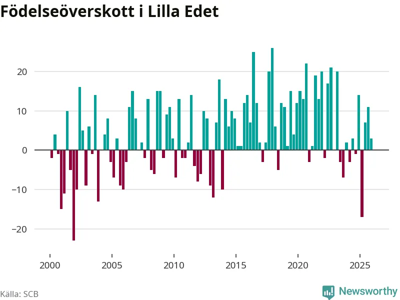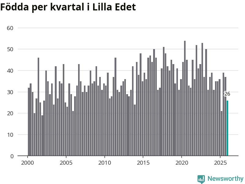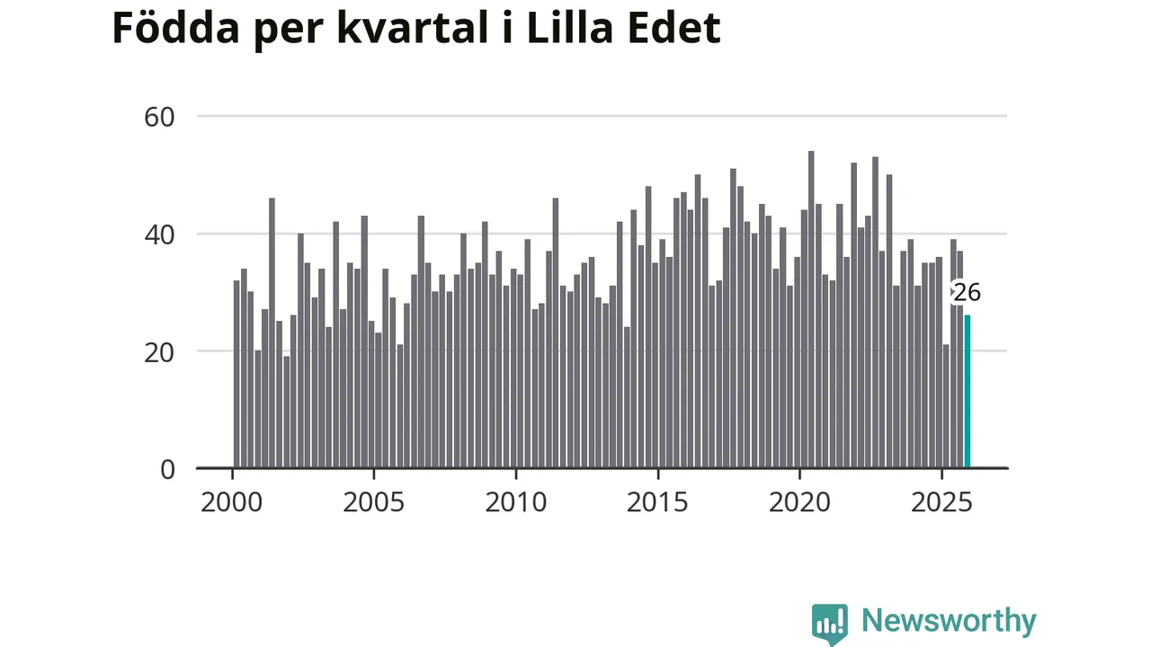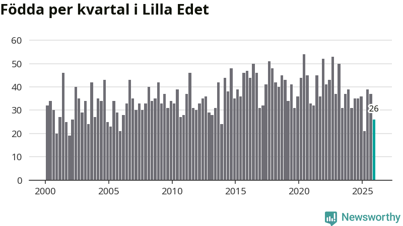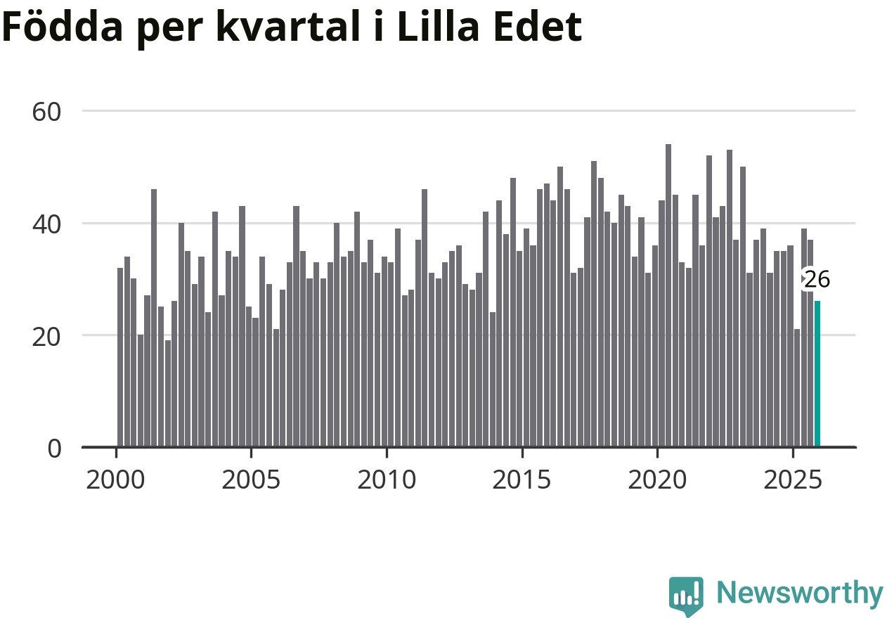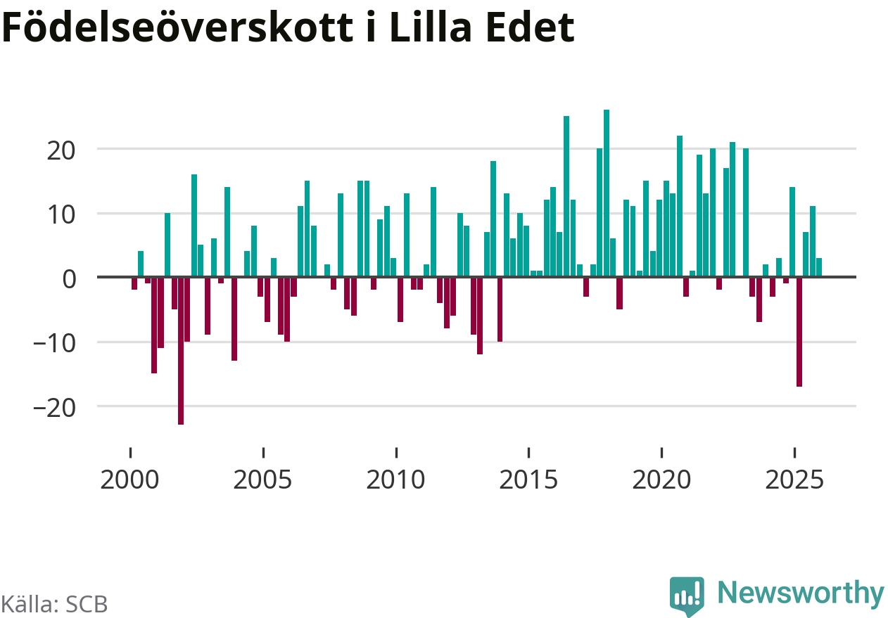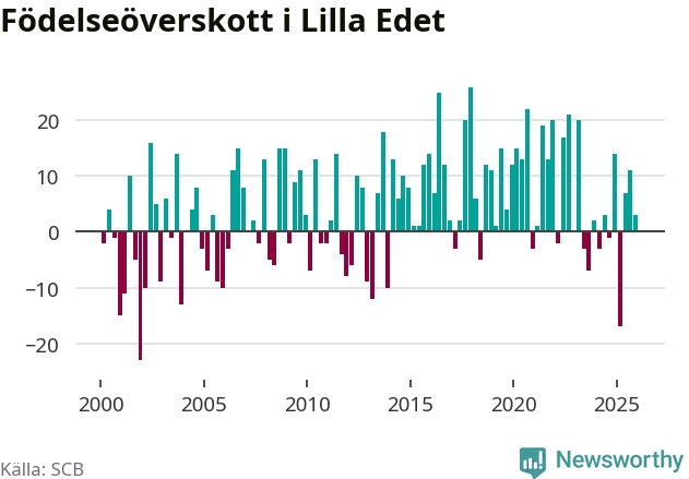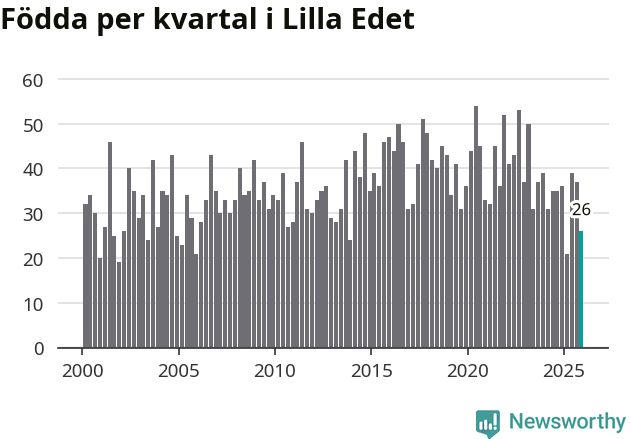 Enligt SCB:s siffror föddes 26 barn i Lilla Edet under det senaste kvartalet. Samtidigt avled relativt få – 23 personer. Skillnaden mellan antal födda och döda är så liten att det inte går att säga om det beror på något annat än SCB:s röjandeskydd. Kommunen har oftast haft positivt födelsenetto tidigare.