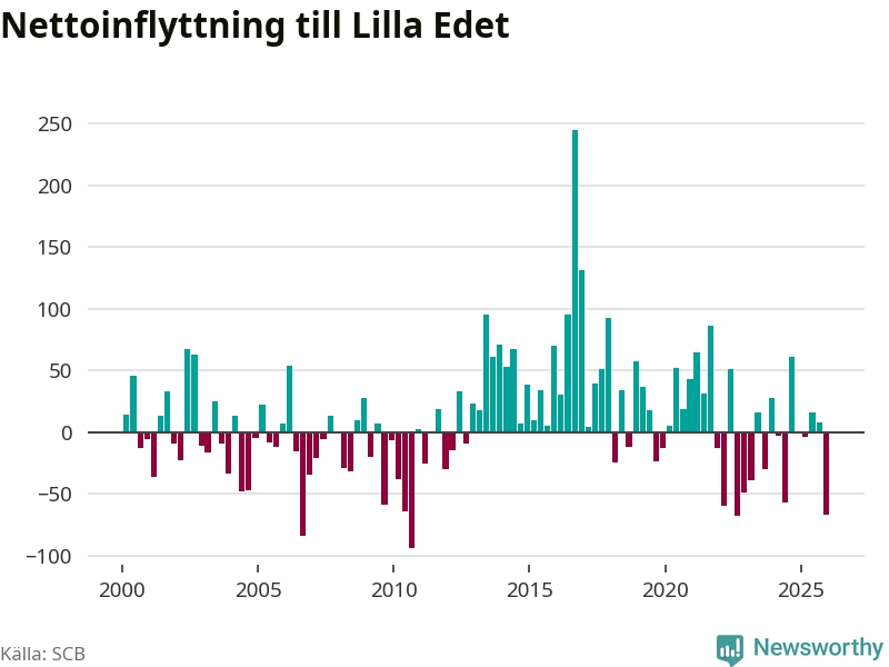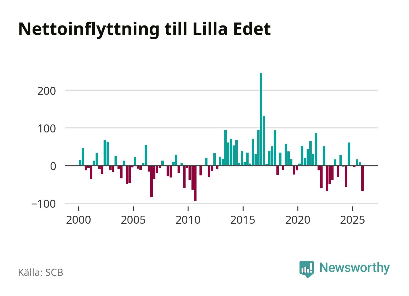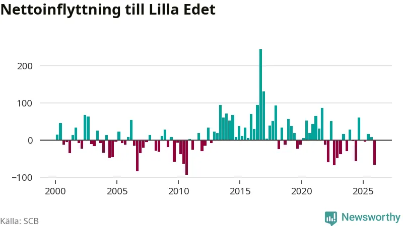 Under fjärde kvartalet 2025 flyttade 229 personer till kommunen medan 296 personer flyttade därifrån. Det är historiskt sett en stor utflyttning under ett kvartal. Sedan seklets början har Lilla Edet oftast haft ett positivt flyttnetto.