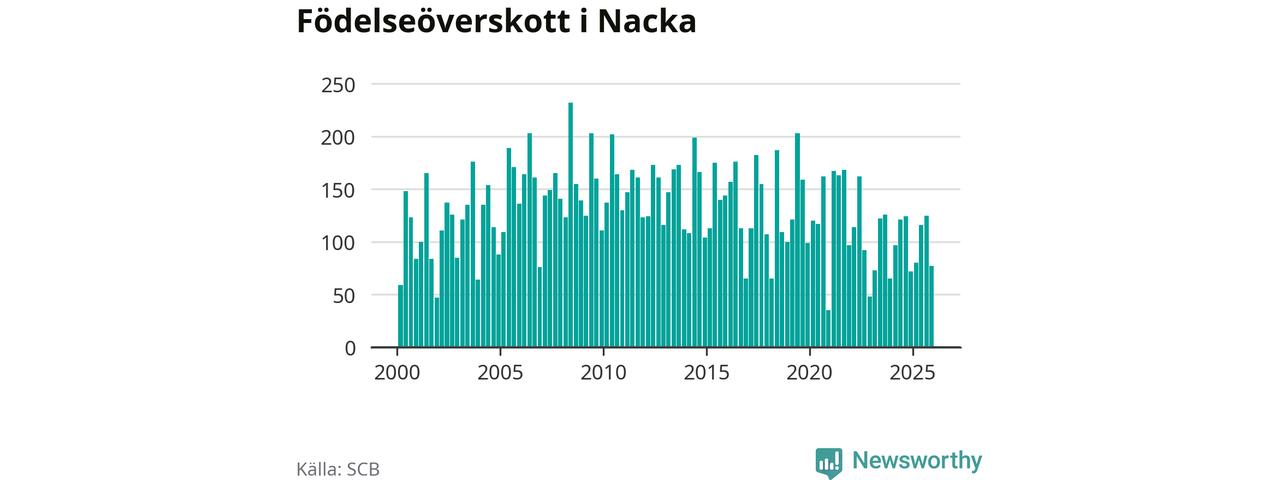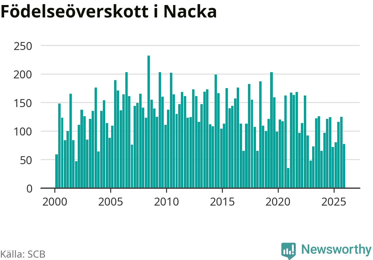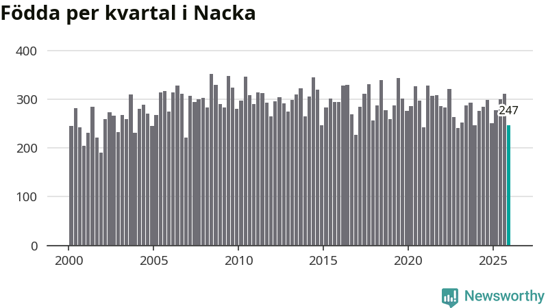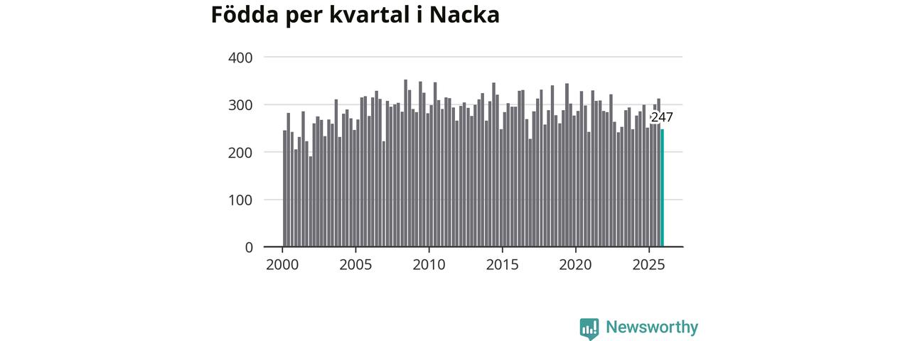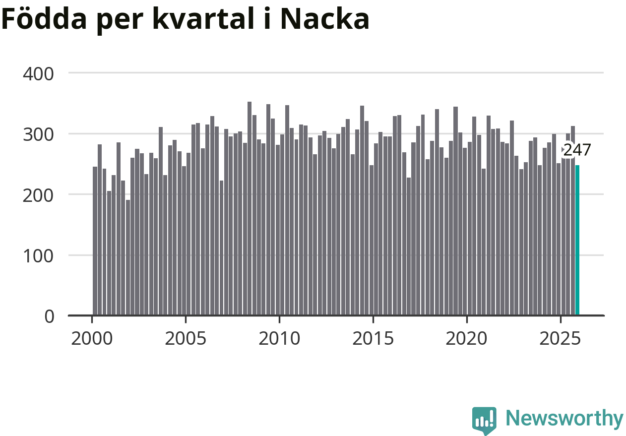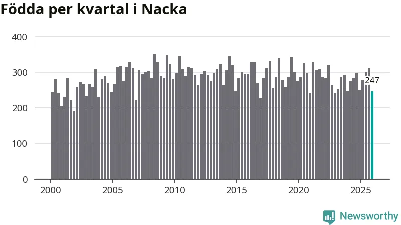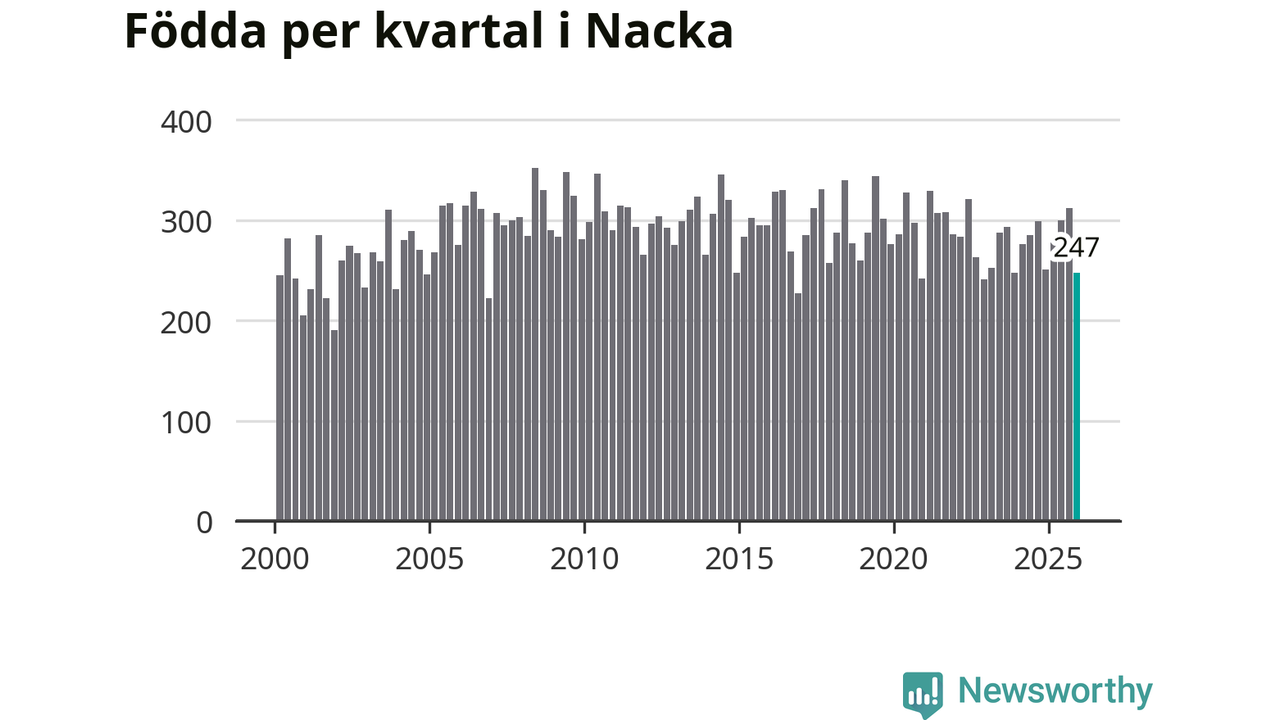 Enligt SCB:s siffror föddes 247 barn i Nacka under det senaste kvartalet. Samtidigt avled 170 personer. Nacka hade alltså ett positivt födelsenetto, vilket kommunen historiskt sett i princip alltid har haft.
