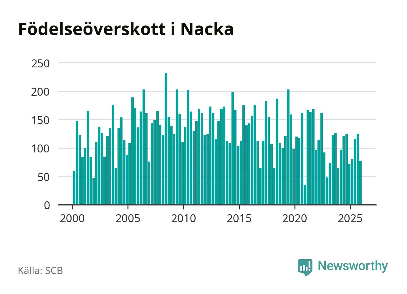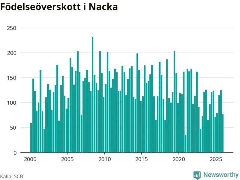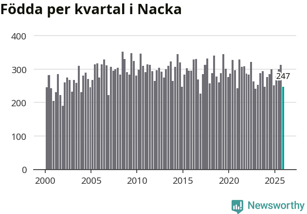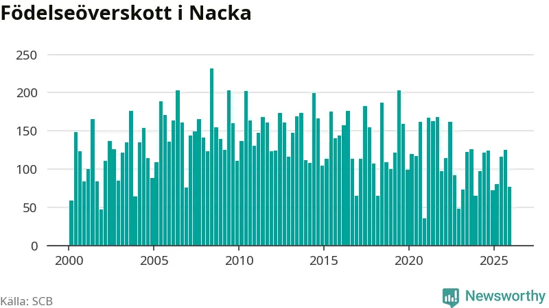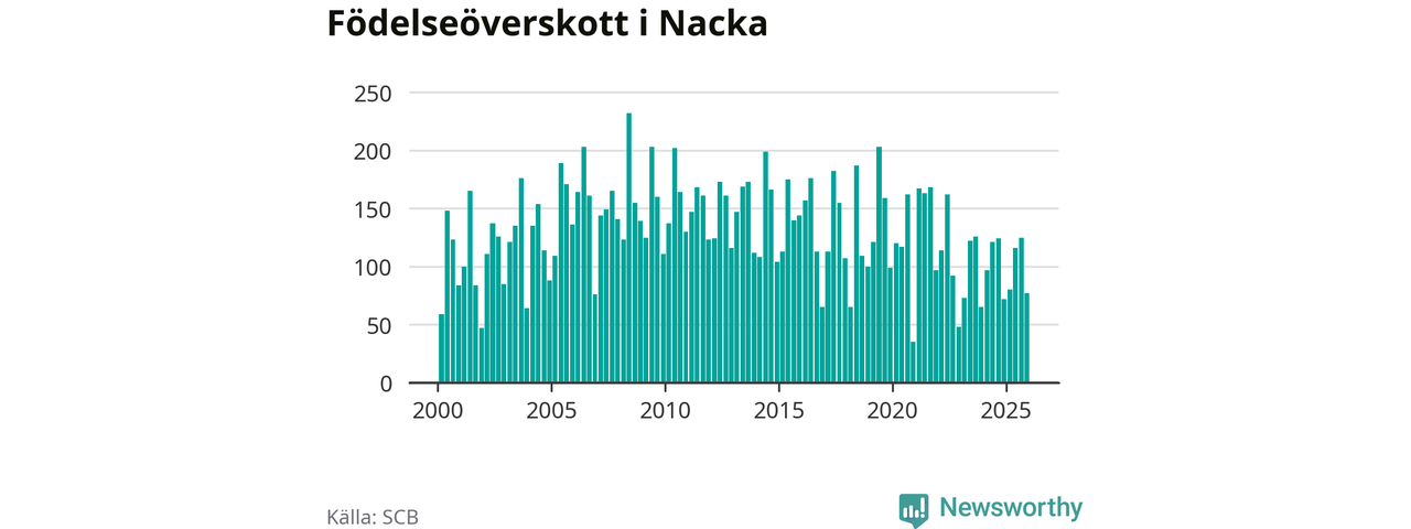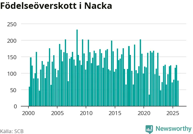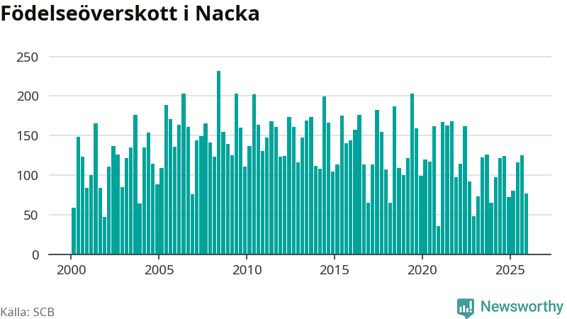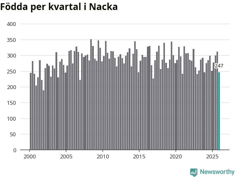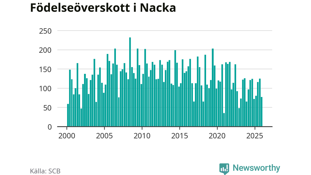 Enligt SCB:s siffror föddes 247 barn i Nacka under det senaste kvartalet. Samtidigt avled 170 personer. Nacka hade alltså ett positivt födelsenetto, vilket kommunen historiskt sett i princip alltid har haft.
