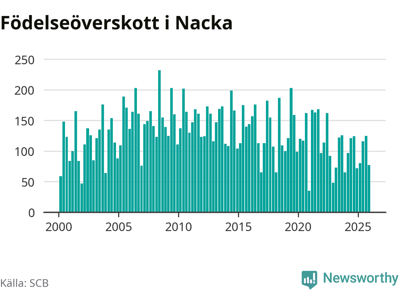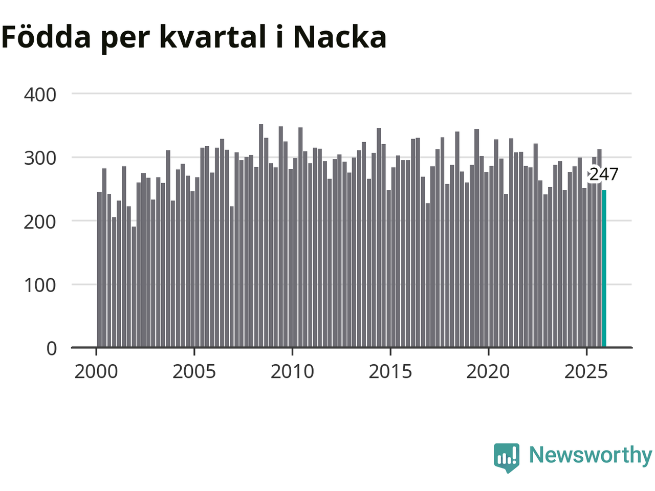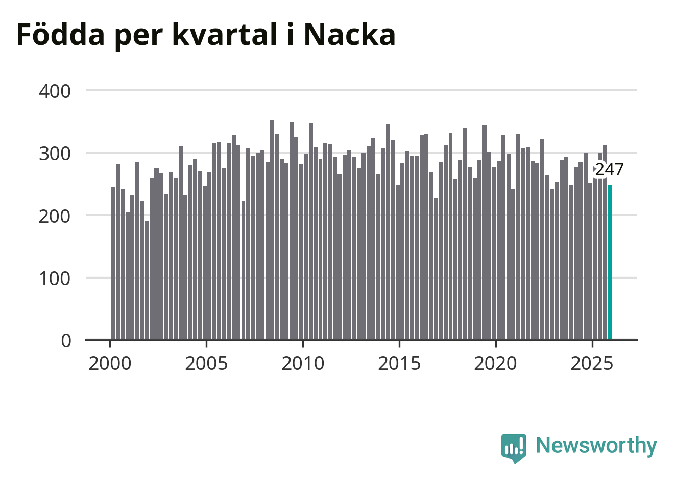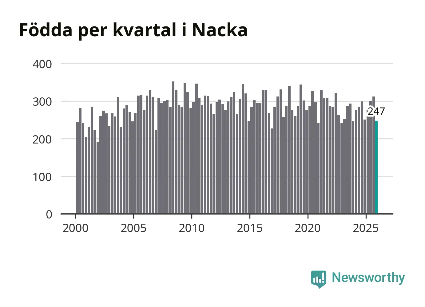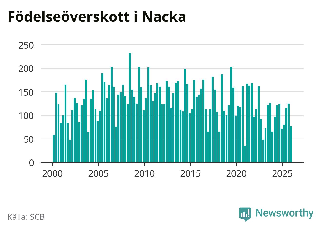 Enligt SCB:s siffror föddes 247 barn i Nacka under det senaste kvartalet. Samtidigt avled 170 personer. Nacka hade alltså ett positivt födelsenetto, vilket kommunen historiskt sett i princip alltid har haft.