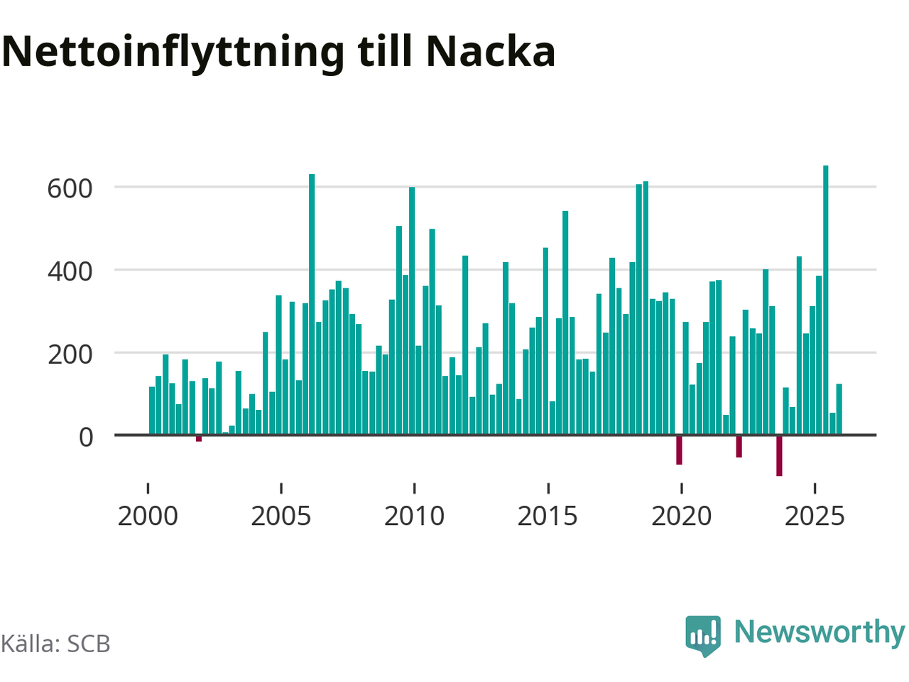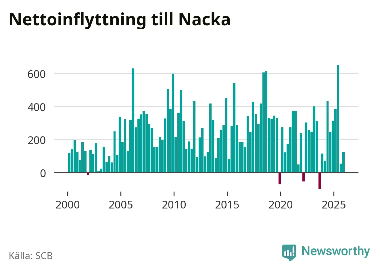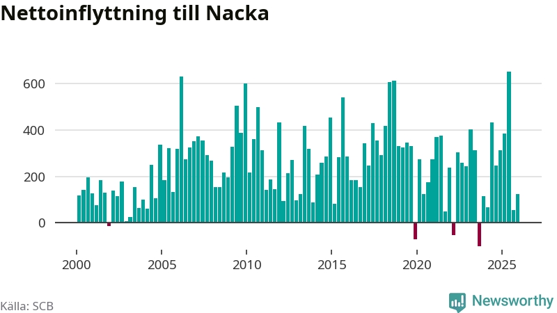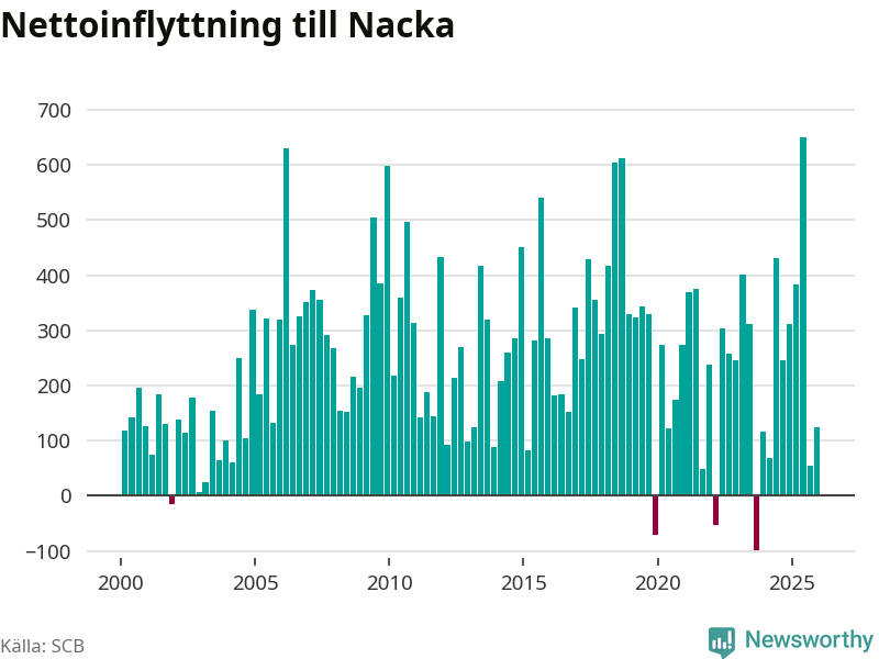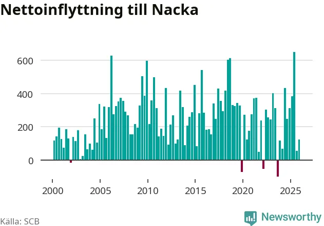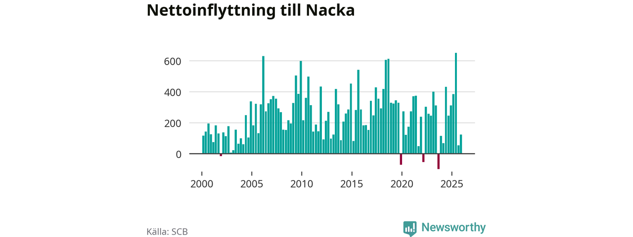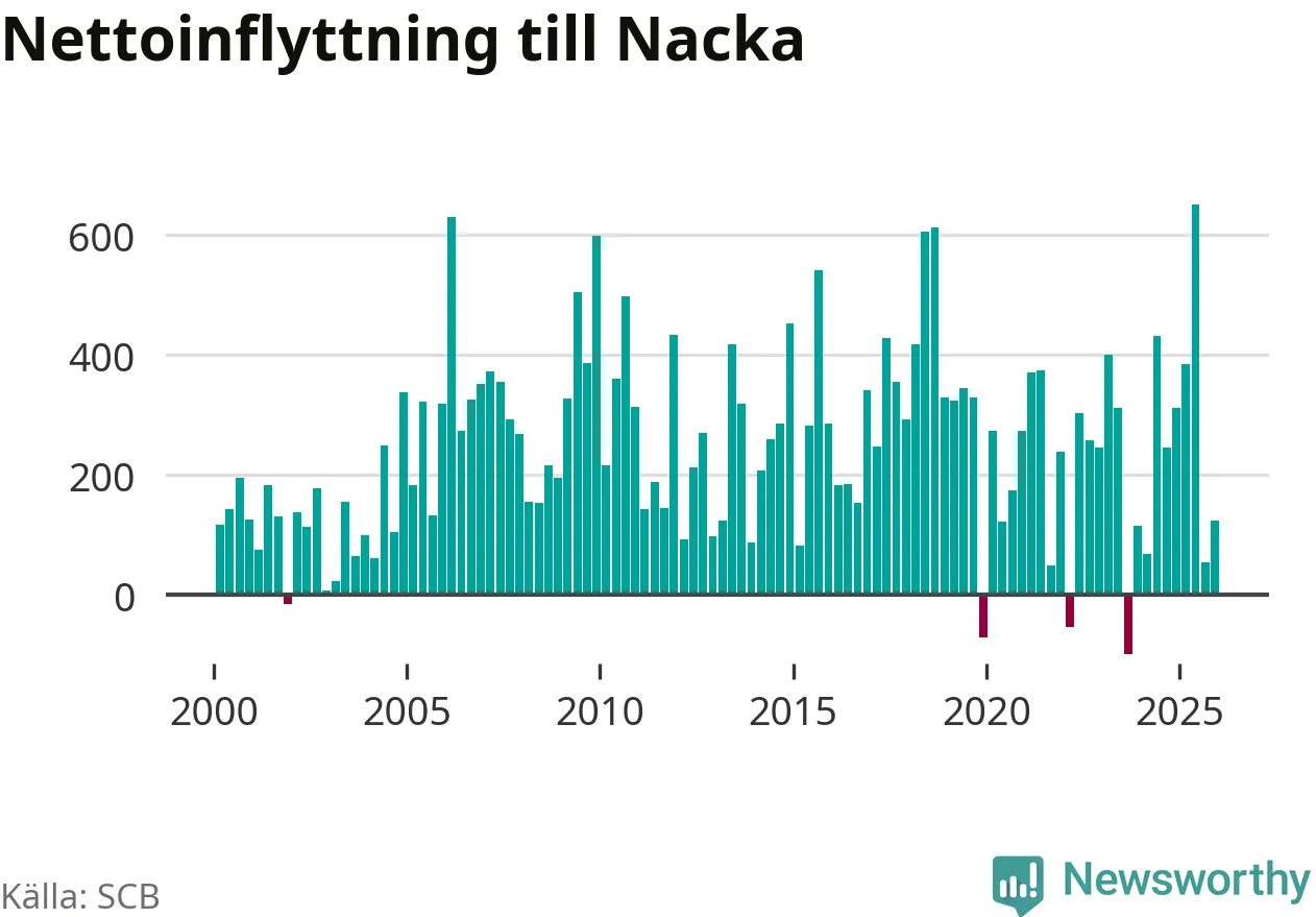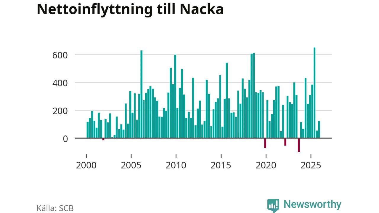 Under fjärde kvartalet 2025 flyttade 2 064 personer till kommunen medan 1 940 personer flyttade därifrån. Sedan seklets början har Nacka haft ett positivt flyttnetto under nästan alla kvartal, inklusive det senaste kvartalet.