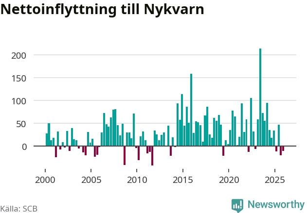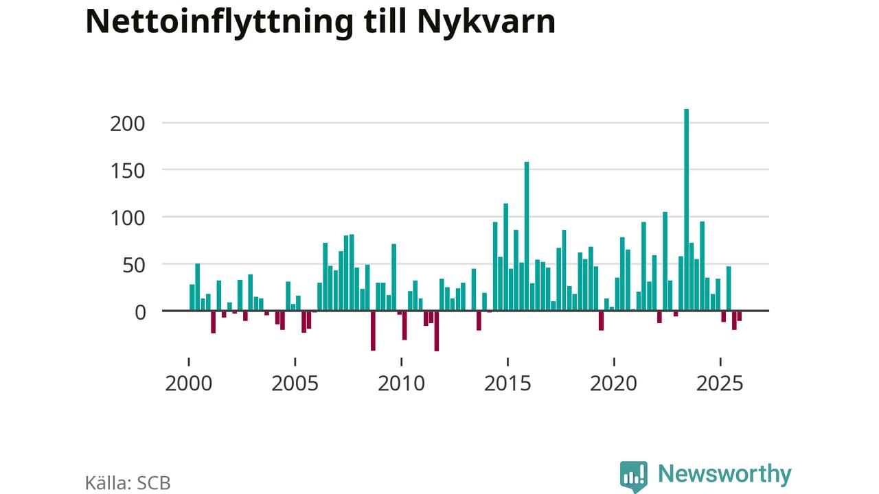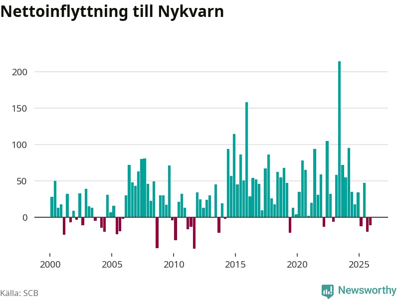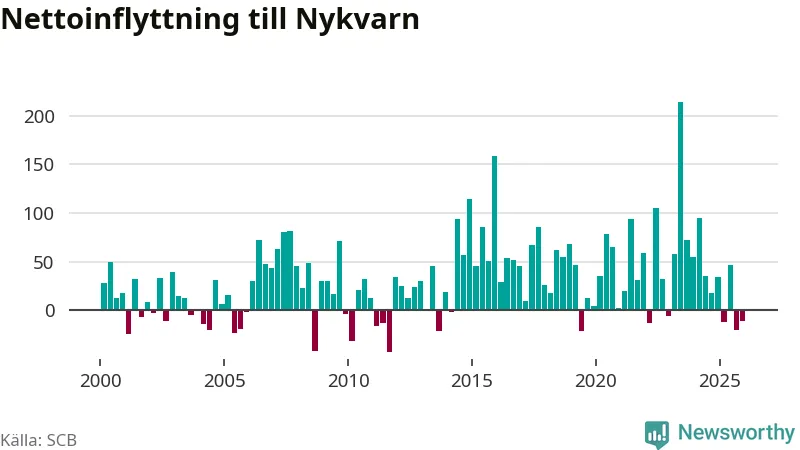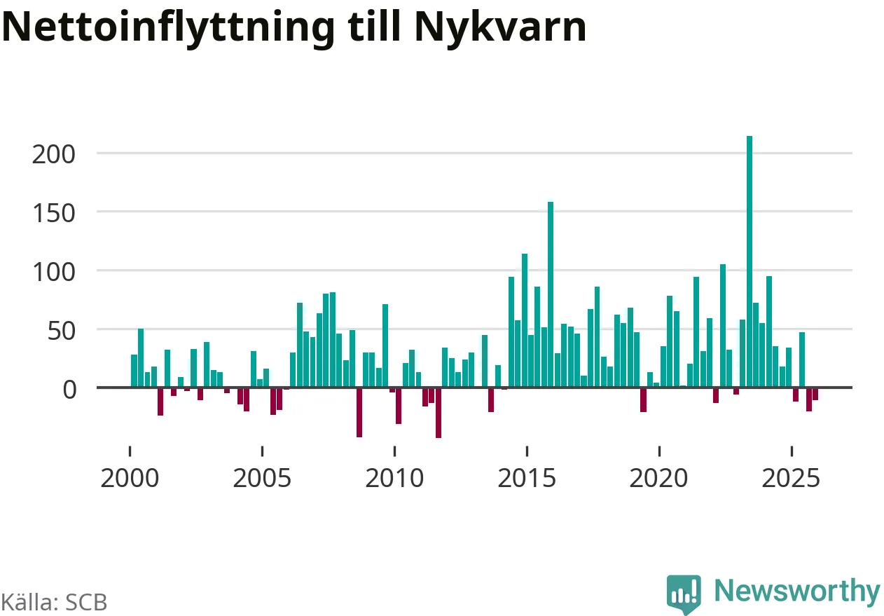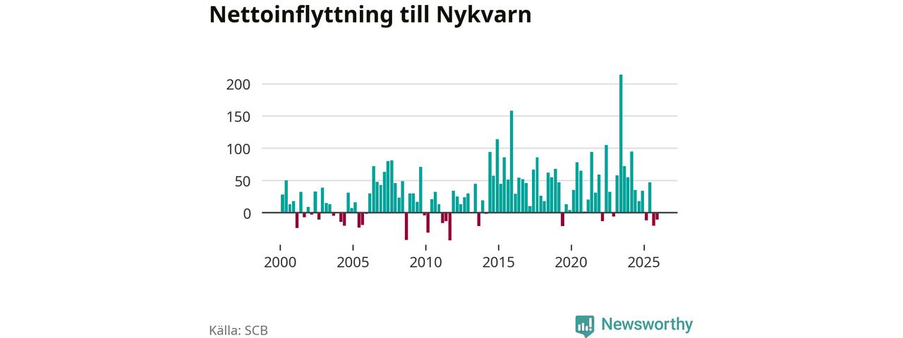 Under fjärde kvartalet 2025 flyttade 180 personer till kommunen medan 191 personer flyttade därifrån. Sedan seklets början har Nykvarn haft ett positivt flyttnetto under nästan alla kvartal.