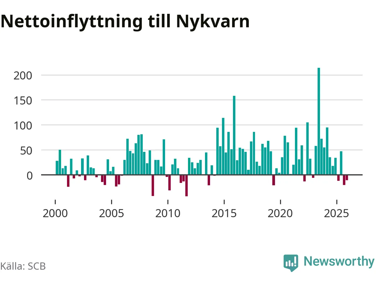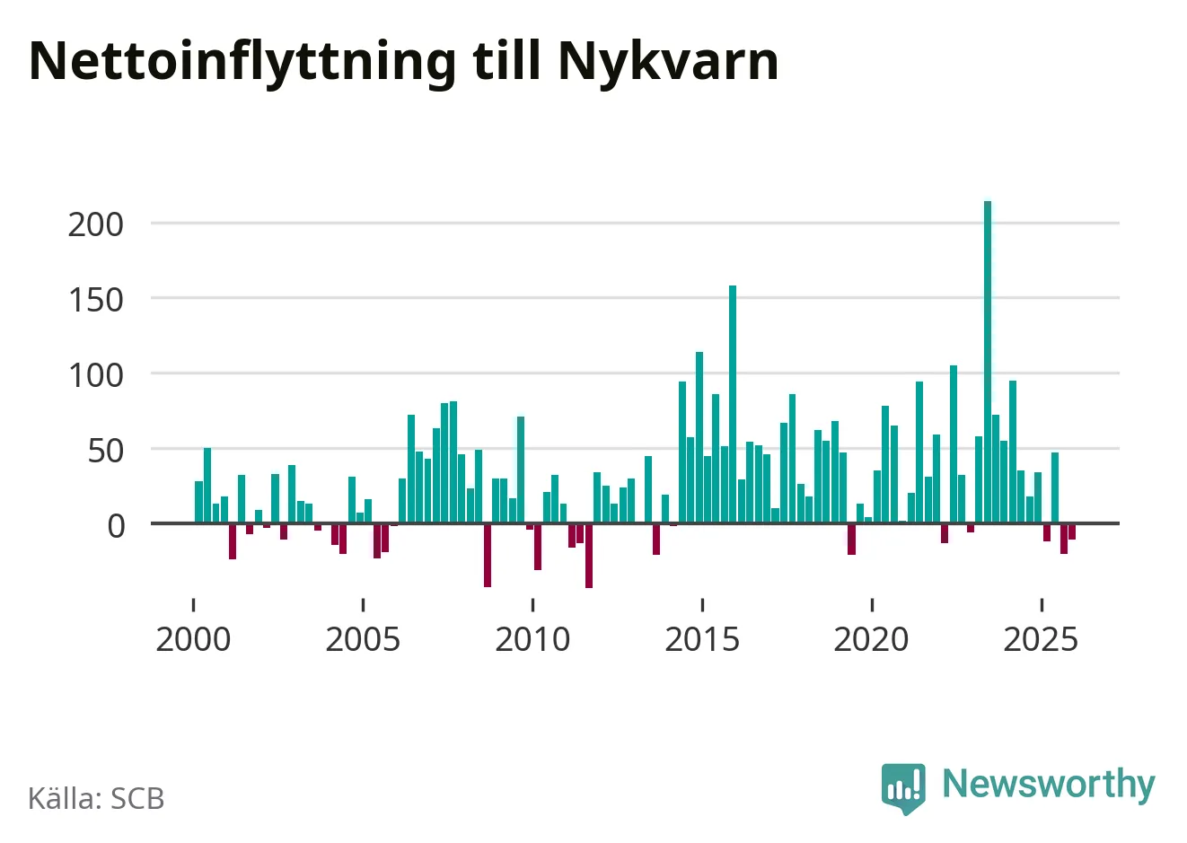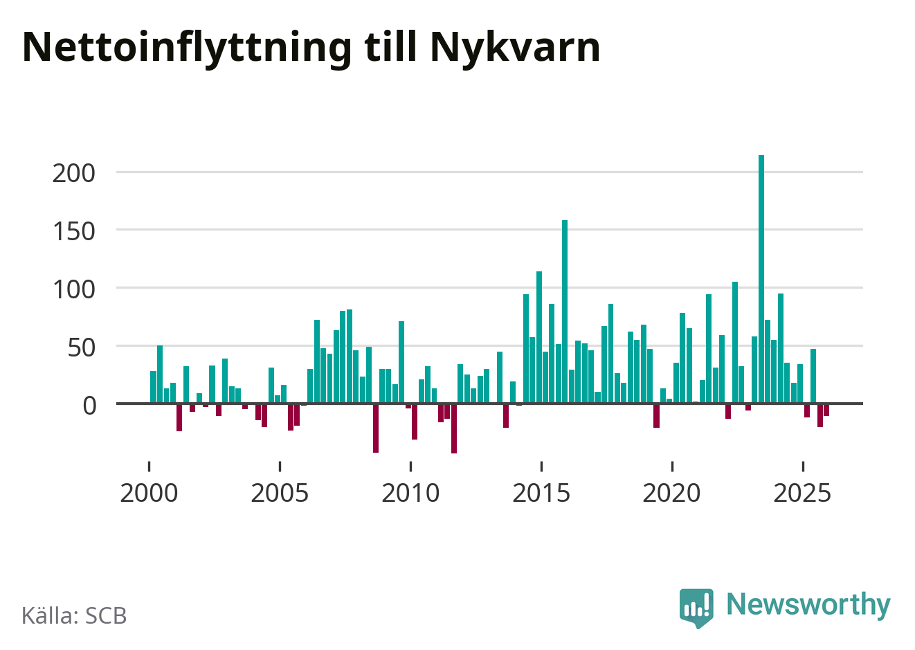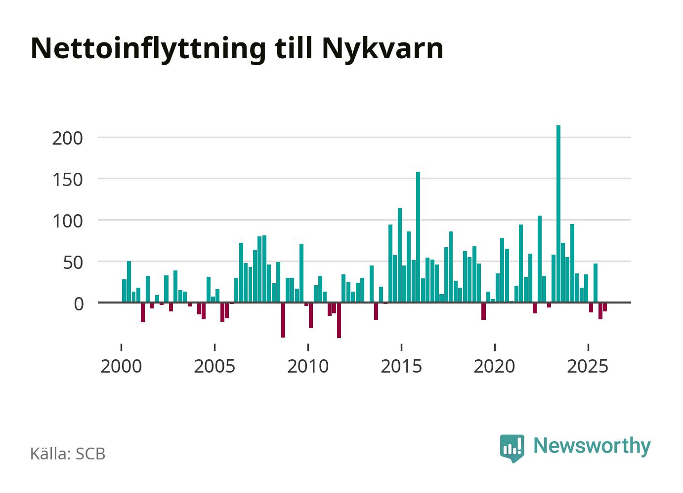 Under fjärde kvartalet 2025 flyttade 180 personer till kommunen medan 191 personer flyttade därifrån. Sedan seklets början har Nykvarn haft ett positivt flyttnetto under nästan alla kvartal.