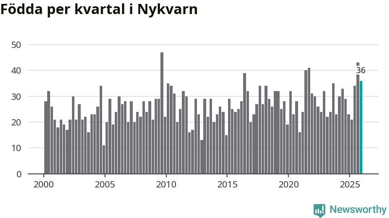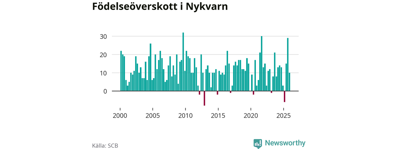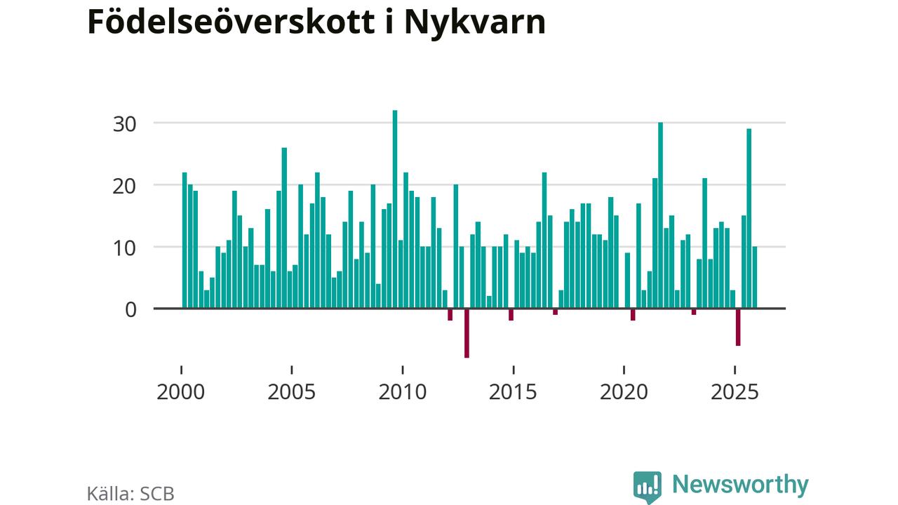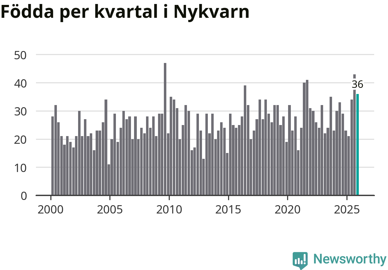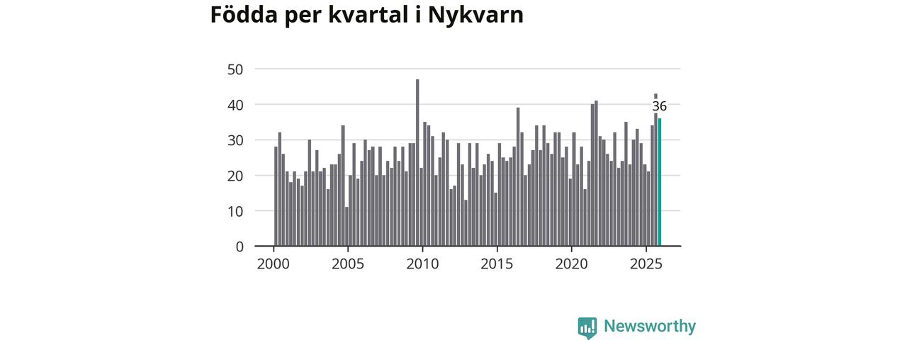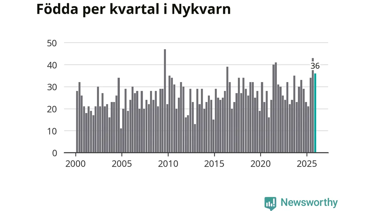 Enligt SCB:s siffror föddes 36 barn i Nykvarn under det senaste kvartalet, vilket är en relativt hög siffra historiskt sett. Samtidigt avled 26 personer. Nykvarn hade alltså ett positivt födelsenetto, vilket kommunen historiskt sett nästan alltid har haft.
