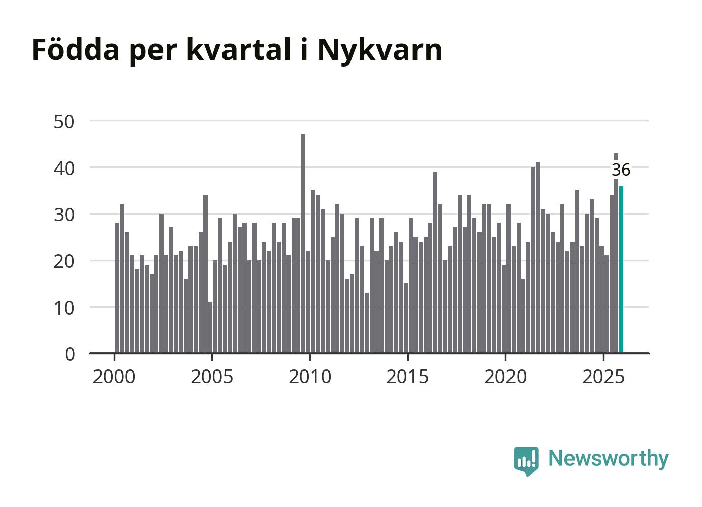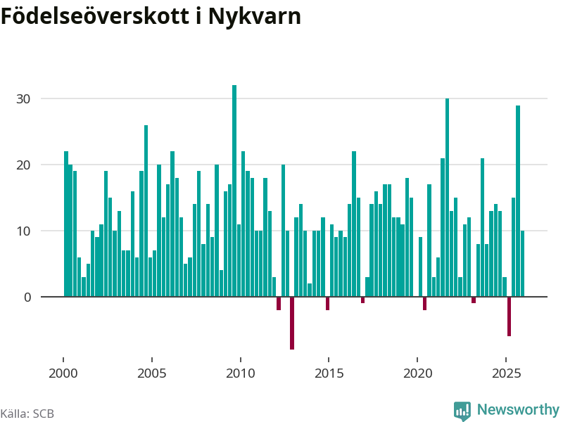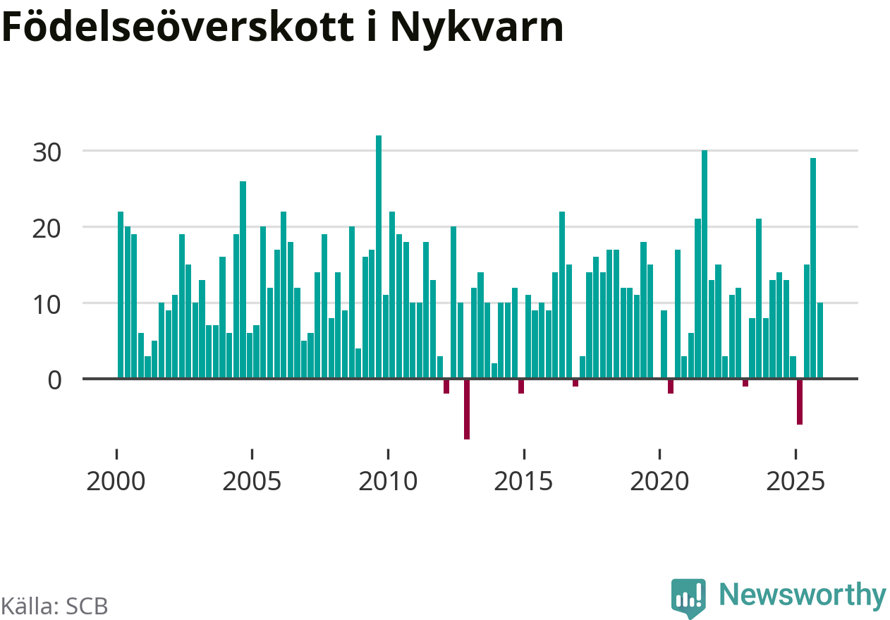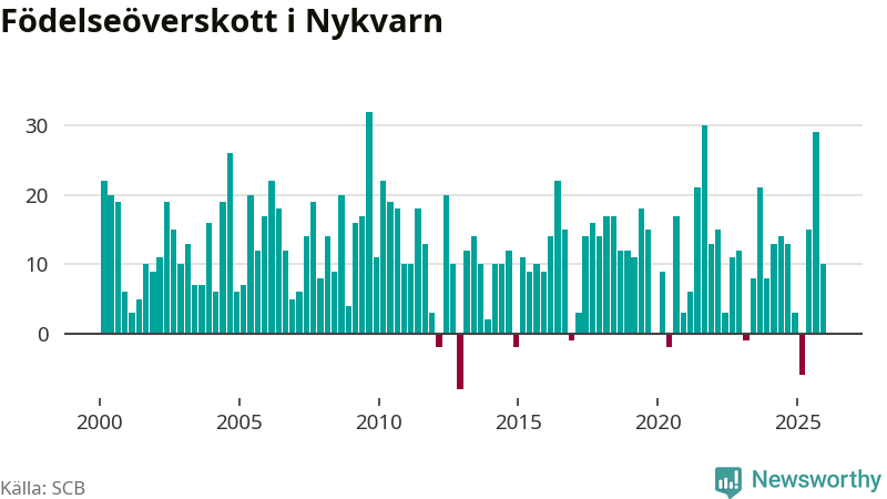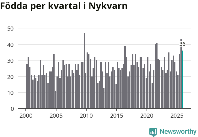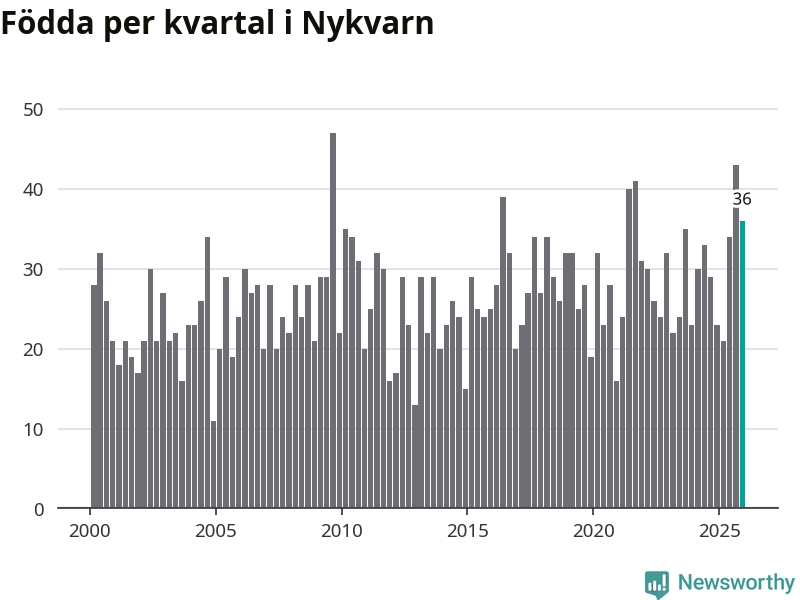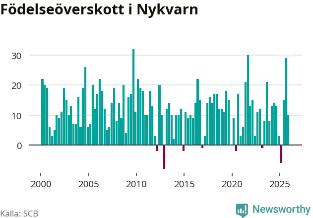Enligt SCB:s siffror föddes 36 barn i Nykvarn under det senaste kvartalet, vilket är en relativt hög siffra historiskt sett. Samtidigt avled 26 personer. Nykvarn hade alltså ett positivt födelsenetto, vilket kommunen historiskt sett nästan alltid har haft.