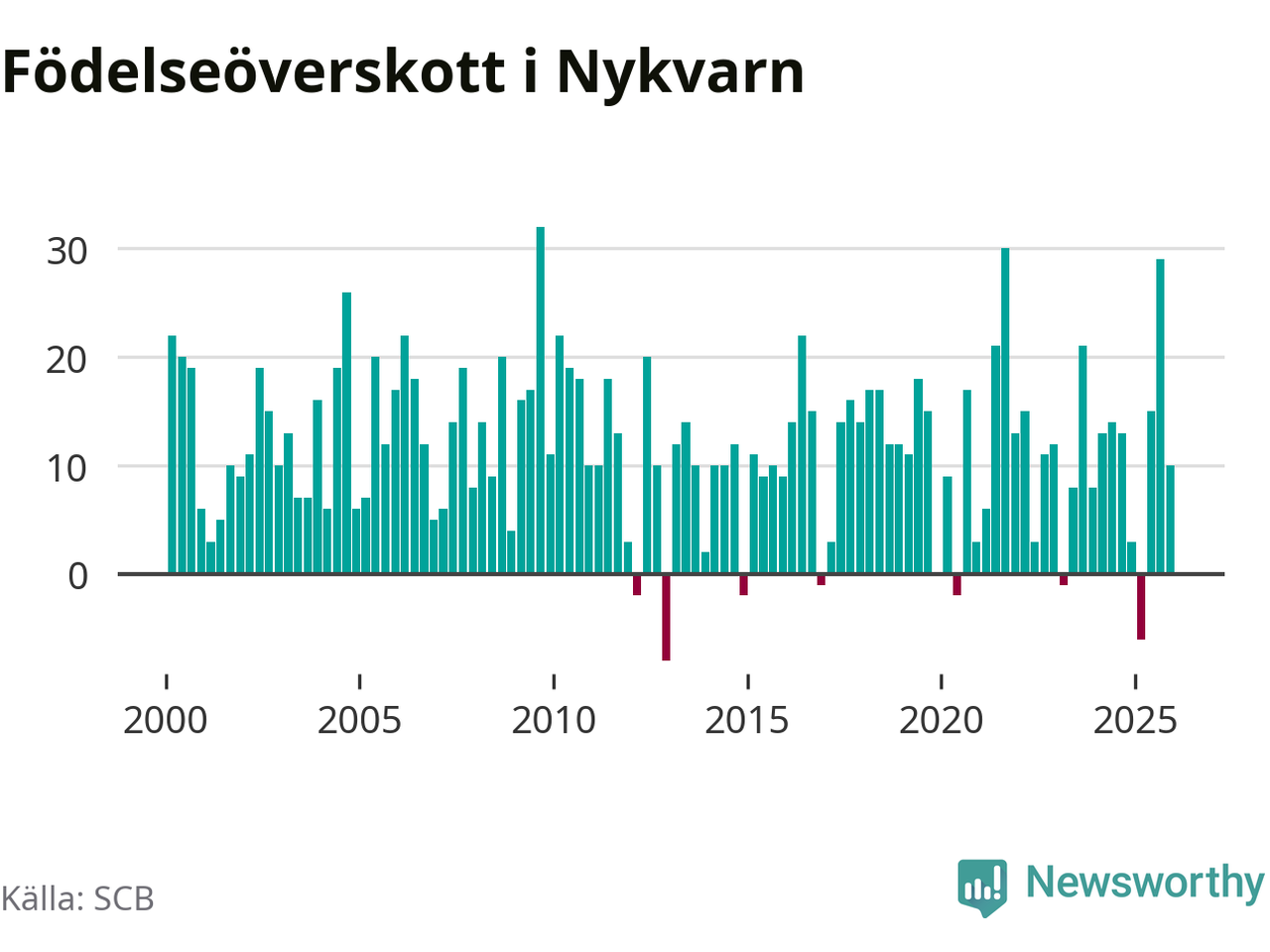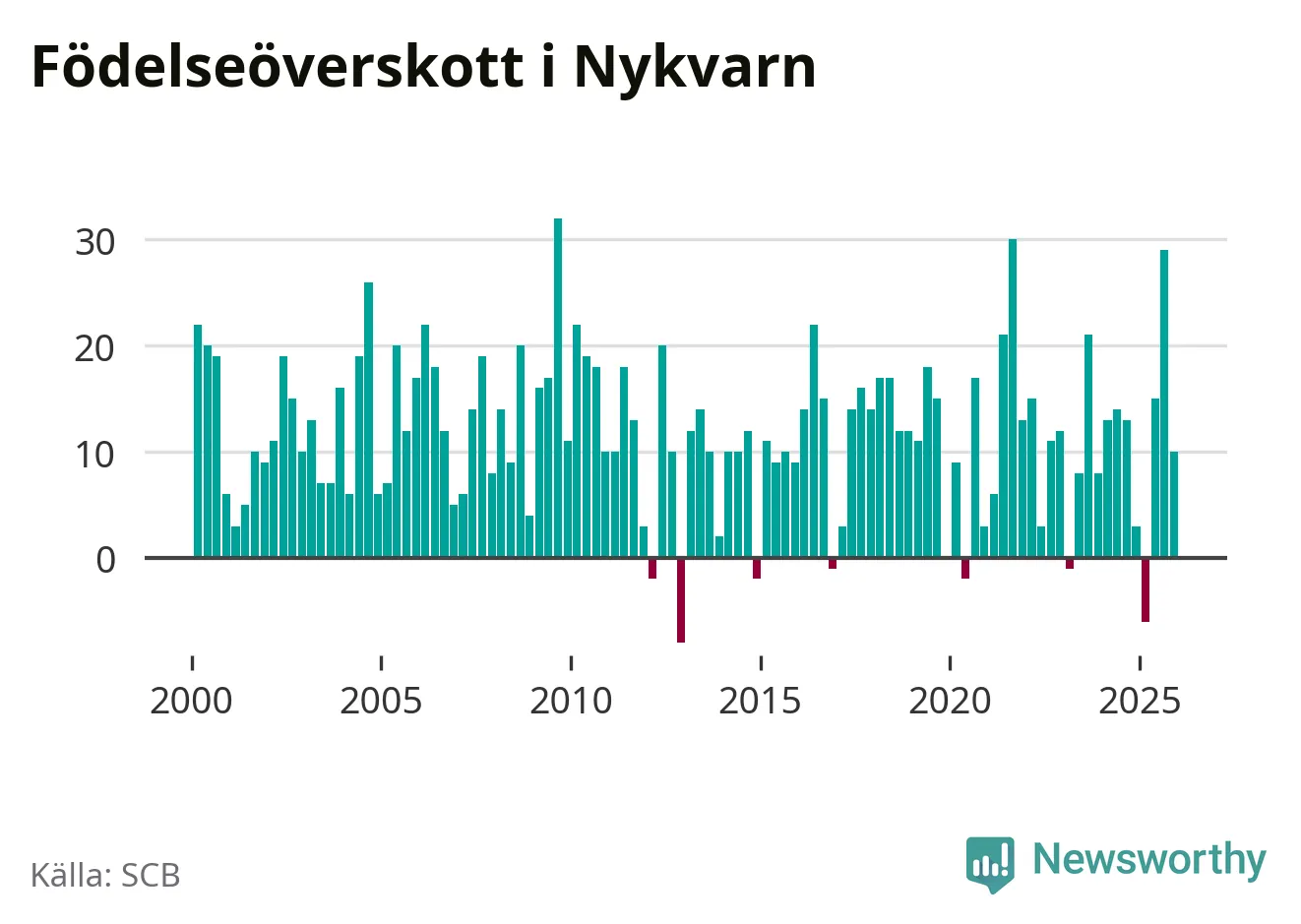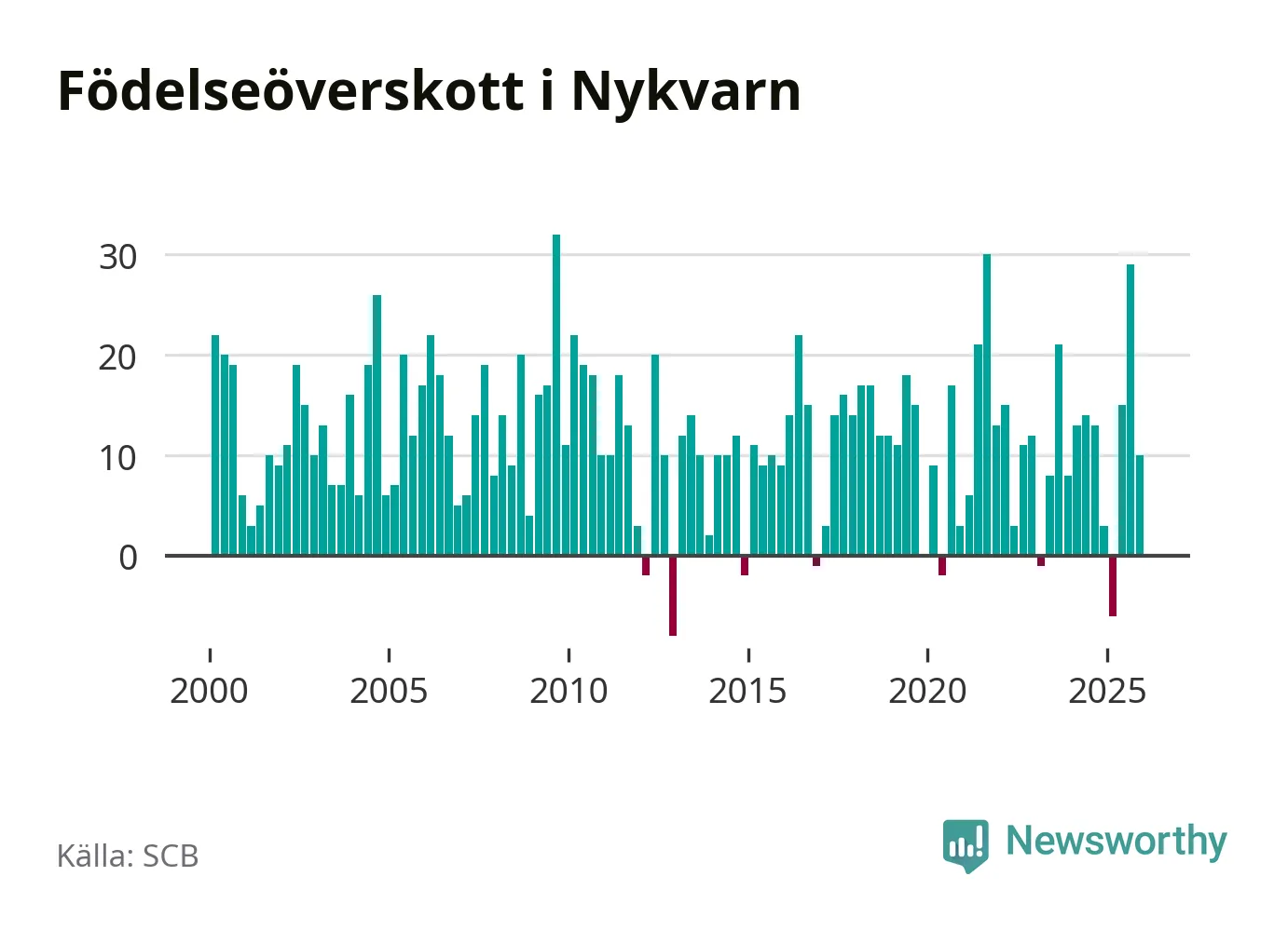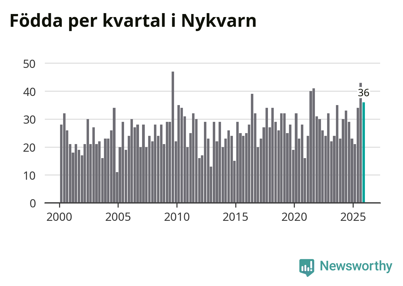Enligt SCB:s siffror föddes 36 barn i Nykvarn under det senaste kvartalet, vilket är en relativt hög siffra historiskt sett. Samtidigt avled 26 personer. Nykvarn hade alltså ett positivt födelsenetto, vilket kommunen historiskt sett nästan alltid har haft.