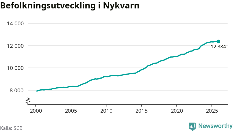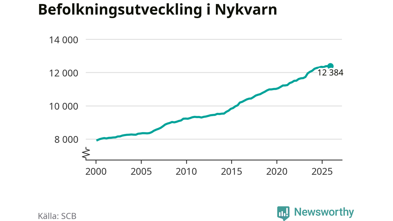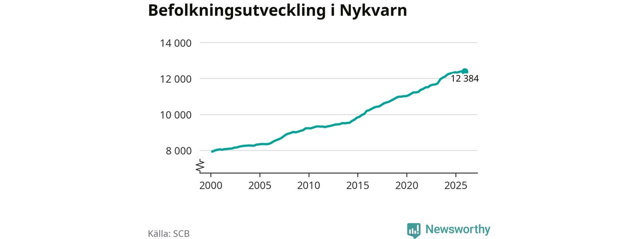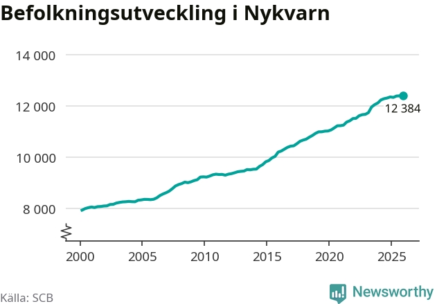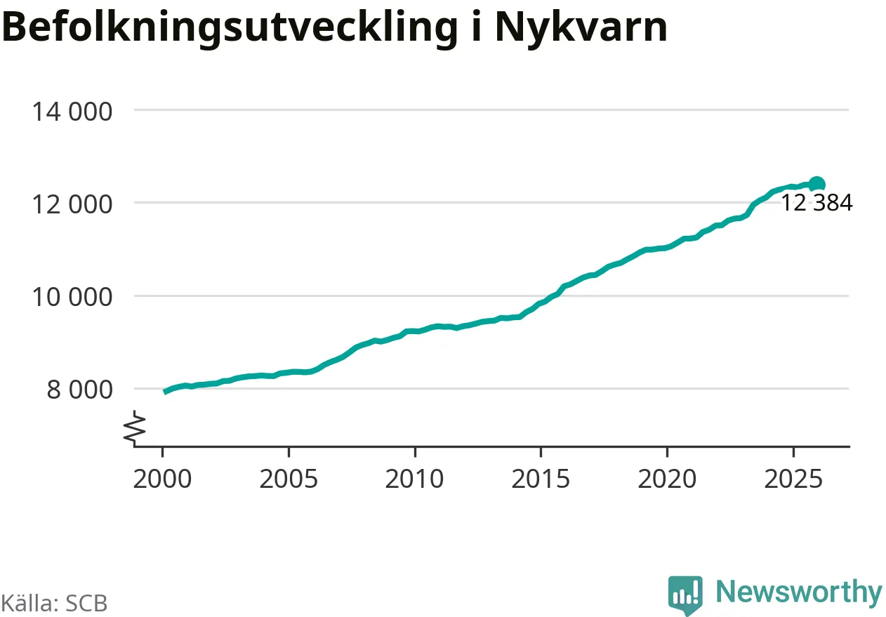 Den 31 december bodde 12 384 personer i Nykvarns kommun, enligt SCB:s senaste siffror. Det är något färre än i slutet av tredje kvartalet, men skillnaden är så liten att den lika gärna kan bero på den lilla justering som SCB gör av siffrorna för att skydda enskilda individers identitet.