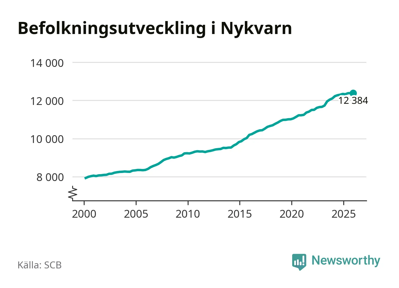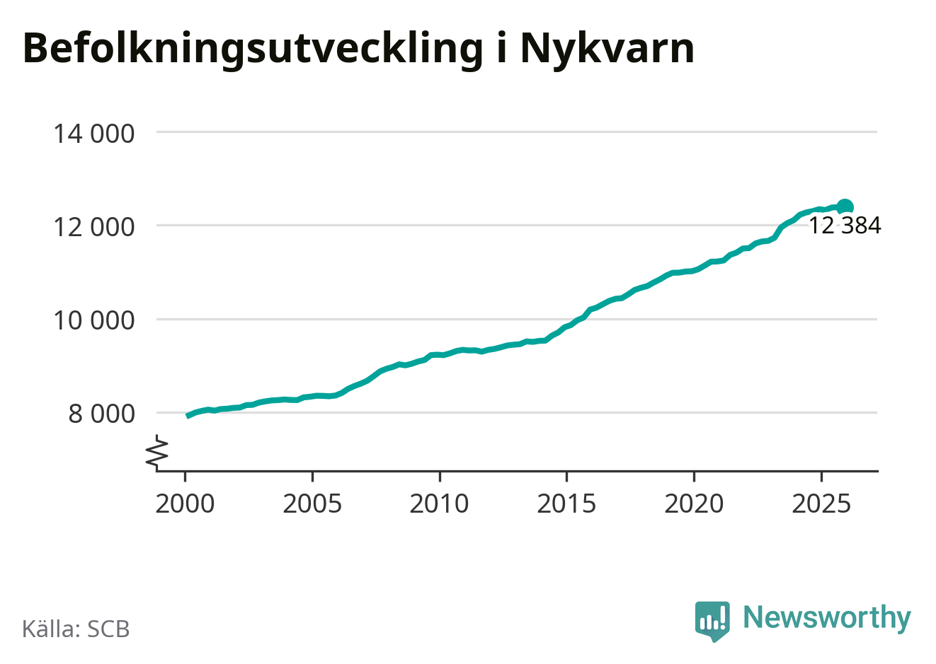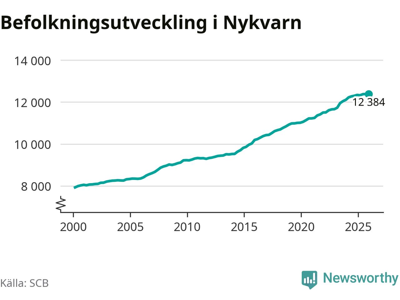 Den 31 december bodde 12 384 personer i Nykvarns kommun, enligt SCB:s senaste siffror. Det är något färre än i slutet av tredje kvartalet, men skillnaden är så liten att den lika gärna kan bero på den lilla justering som SCB gör av siffrorna för att skydda enskilda individers identitet.