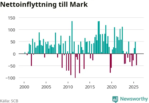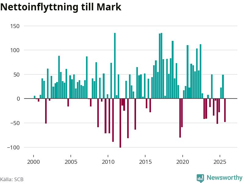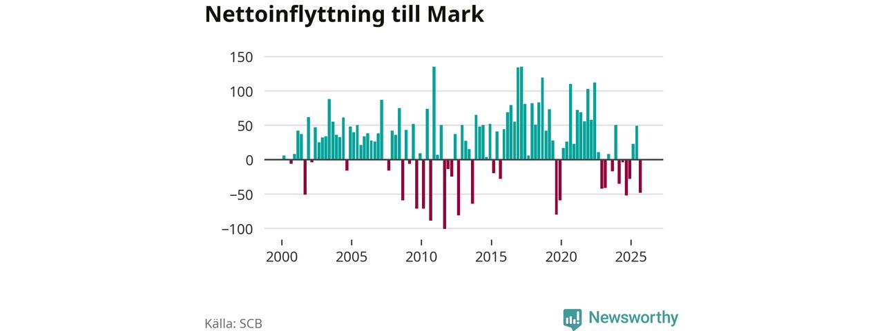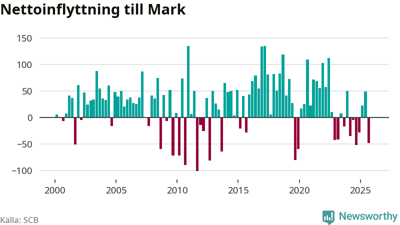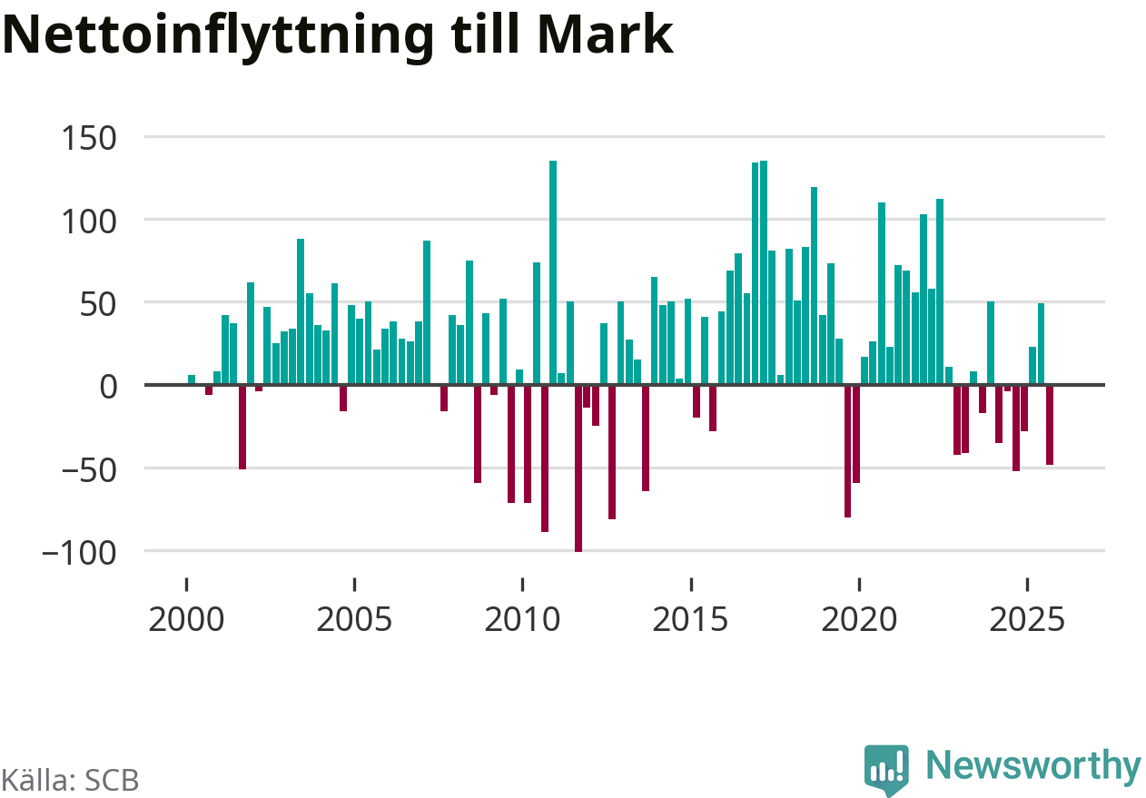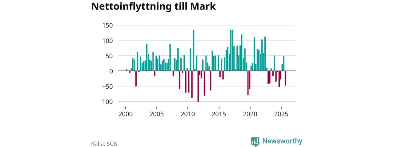 Under fjärde kvartalet 2025 flyttade 374 personer till kommunen samtidigt som lika många flyttade därifrån. Sedan seklets början har Mark oftast haft ett positivt flyttnetto.