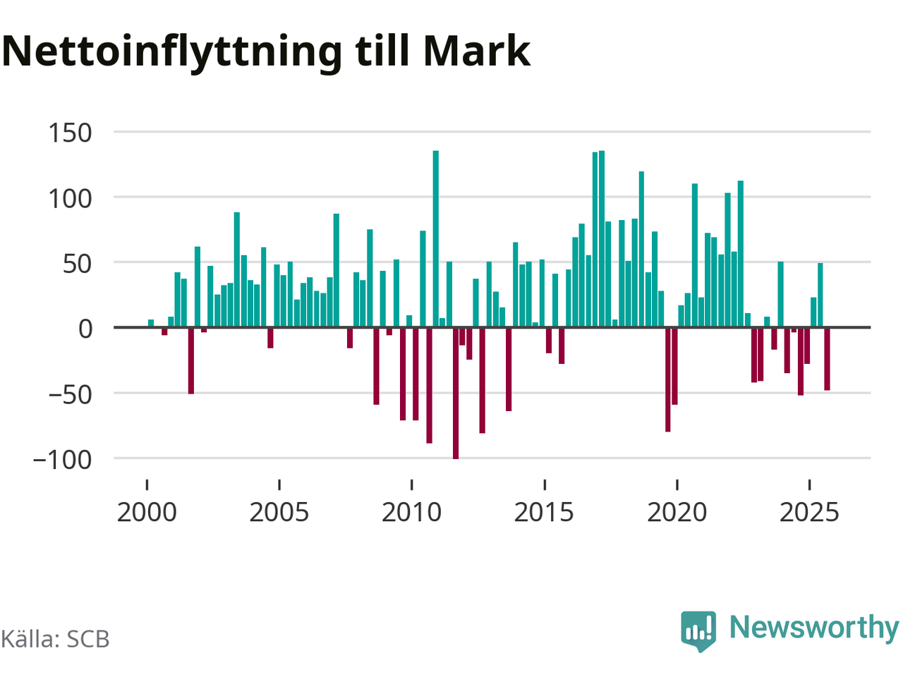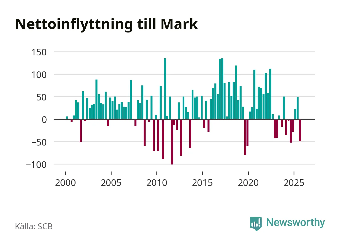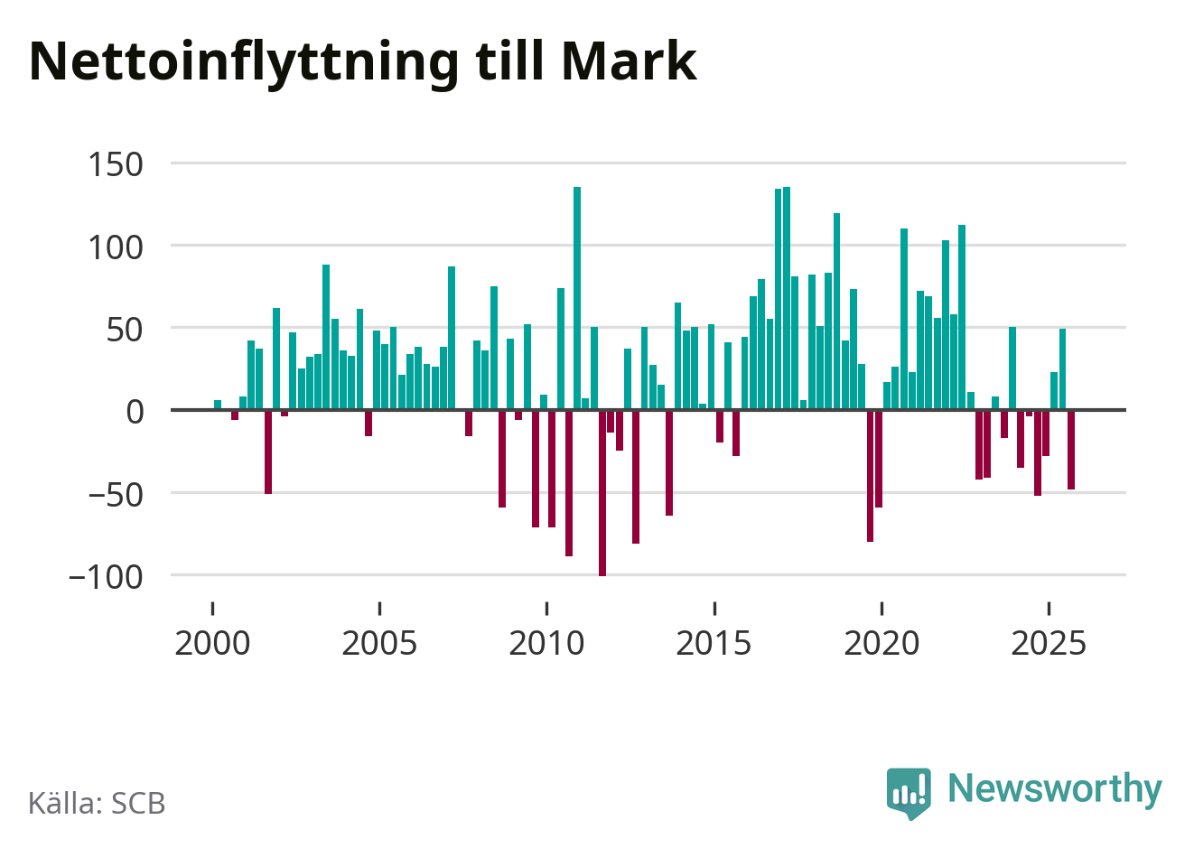 Under fjärde kvartalet 2025 flyttade 374 personer till kommunen samtidigt som lika många flyttade därifrån. Sedan seklets början har Mark oftast haft ett positivt flyttnetto.