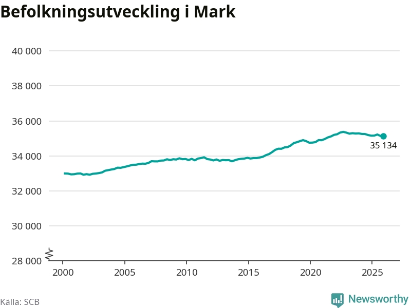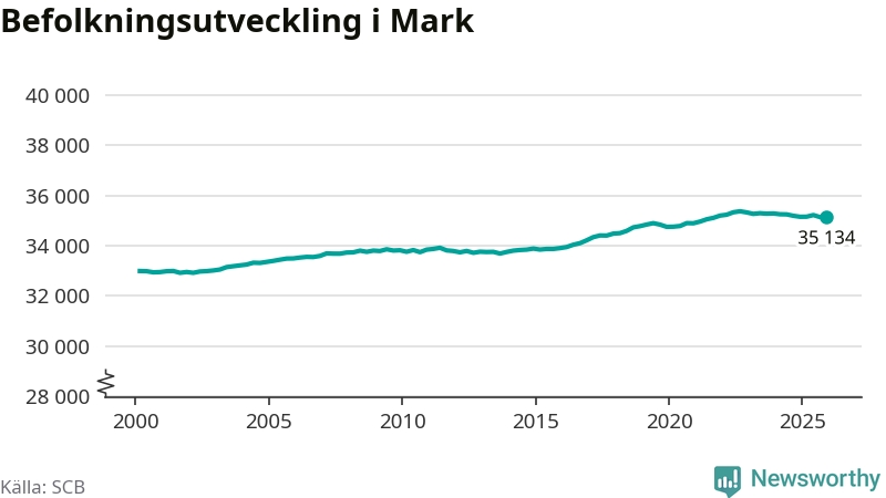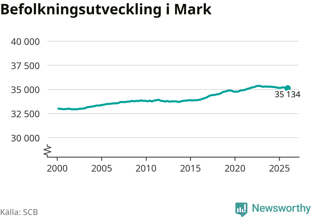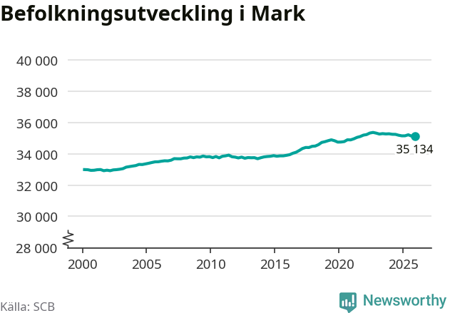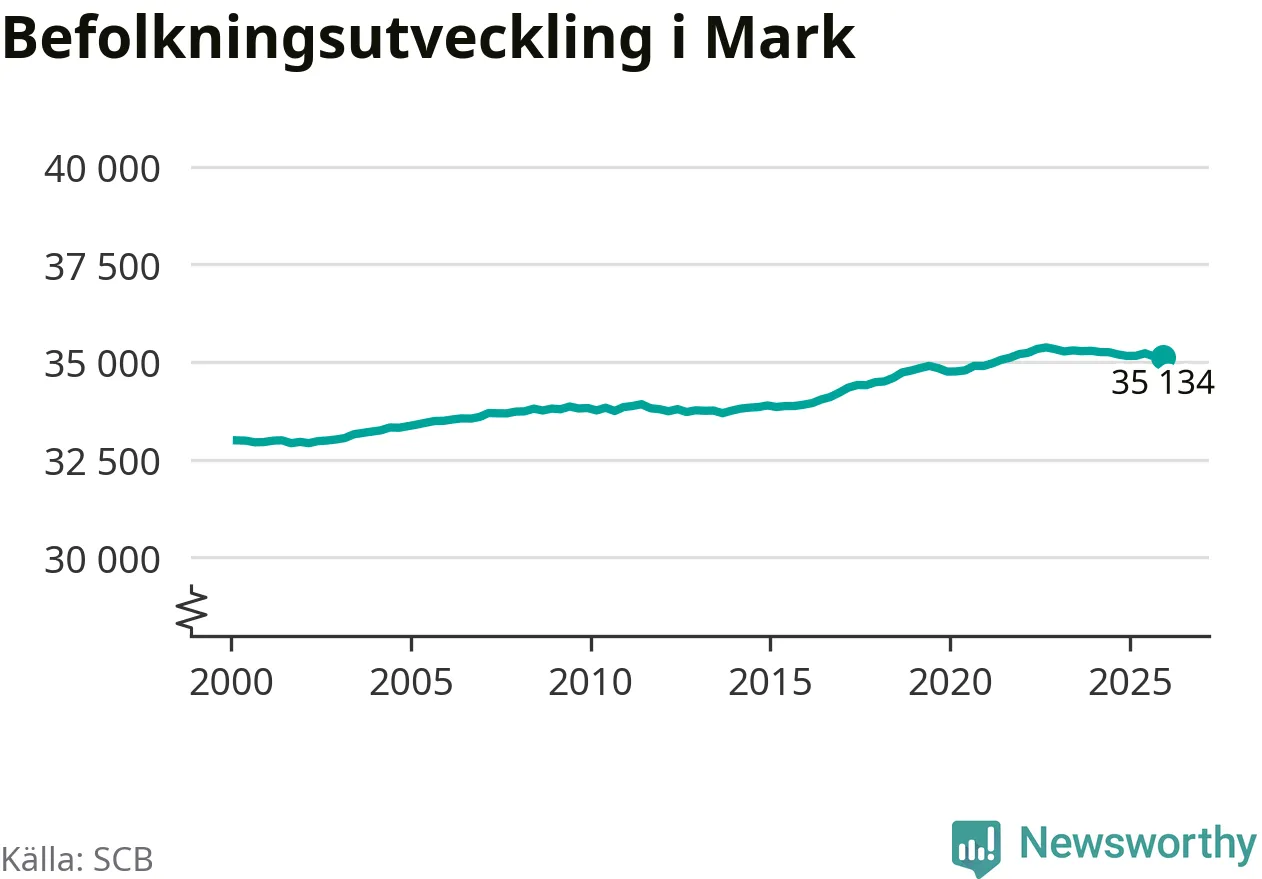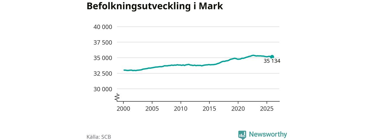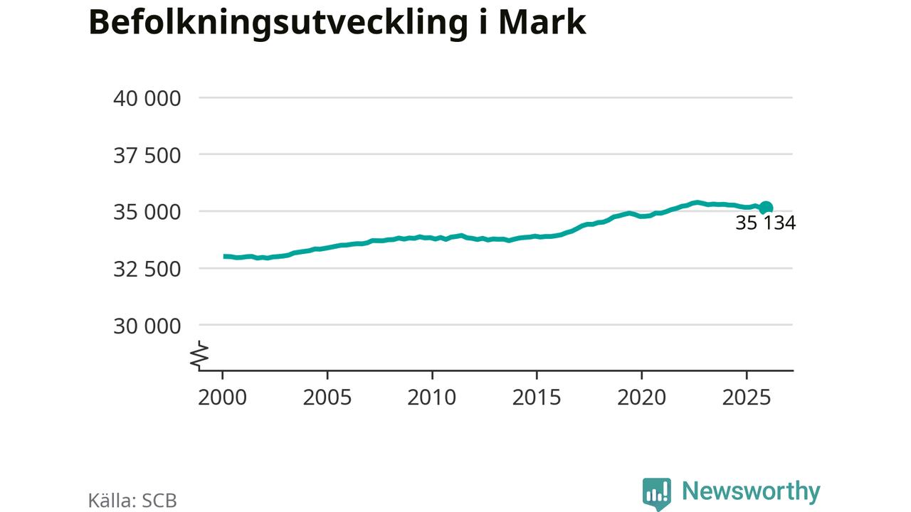 Befolkningen minskade i Marks kommun under det fjärde kvartalet 2025. Den 31 december bodde enligt SCB:s senaste siffror 35 134 personer i kommunen, vilket är sju färre än i slutet av tredje kvartalet.
