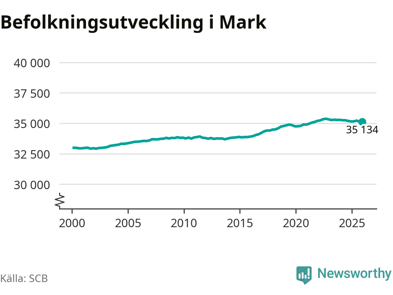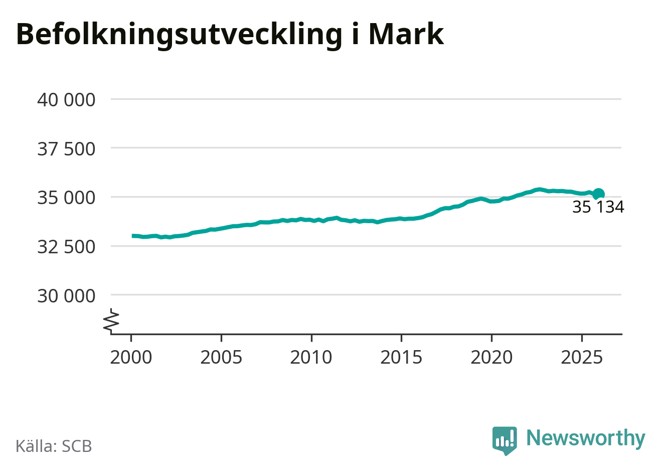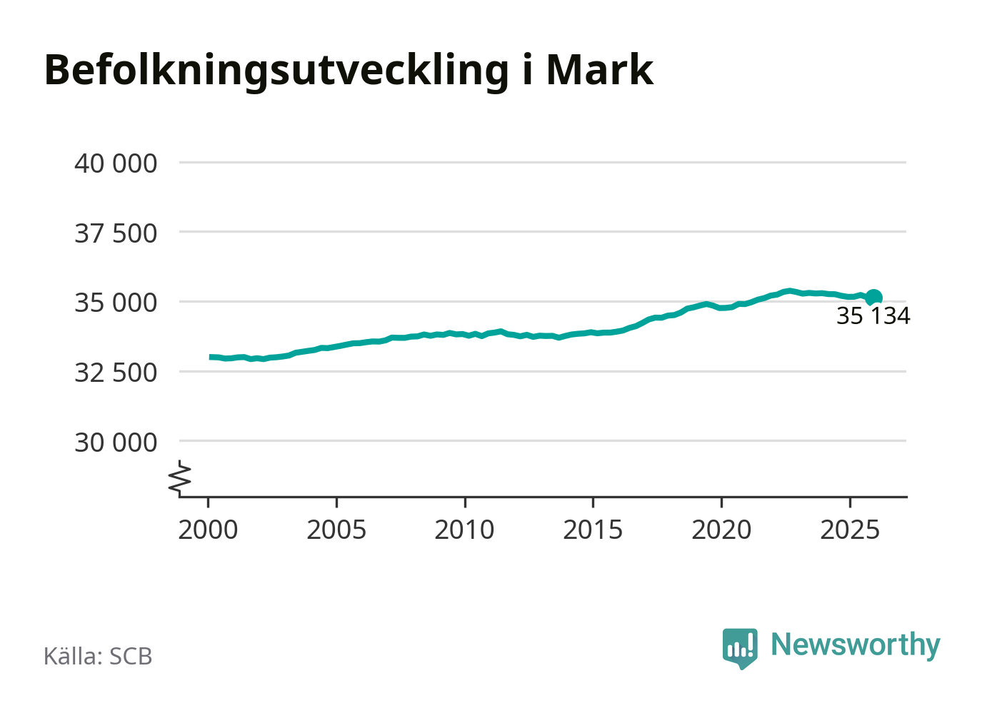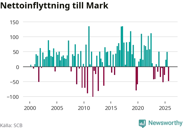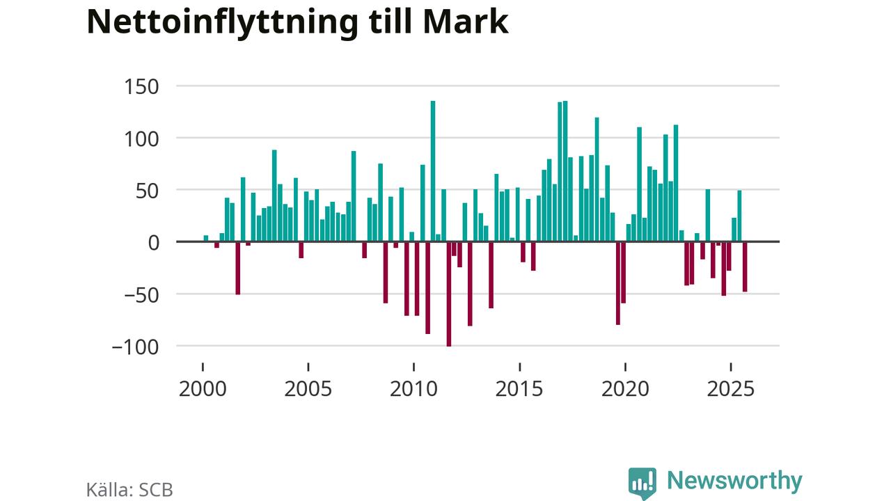 Befolkningen minskade i Marks kommun under det fjärde kvartalet 2025. Den 31 december bodde enligt SCB:s senaste siffror 35 134 personer i kommunen, vilket är sju färre än i slutet av tredje kvartalet.