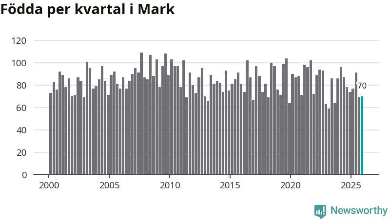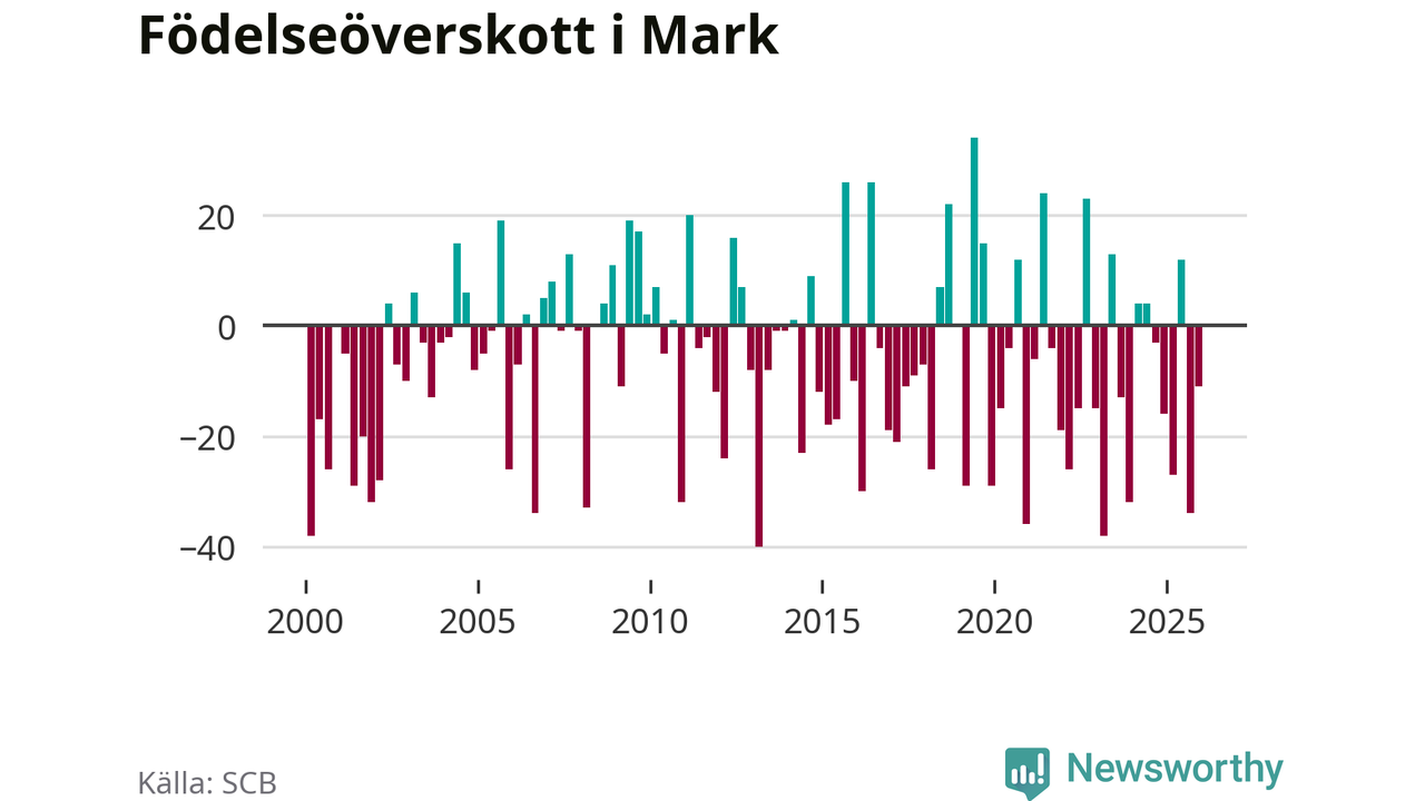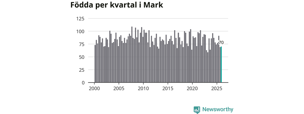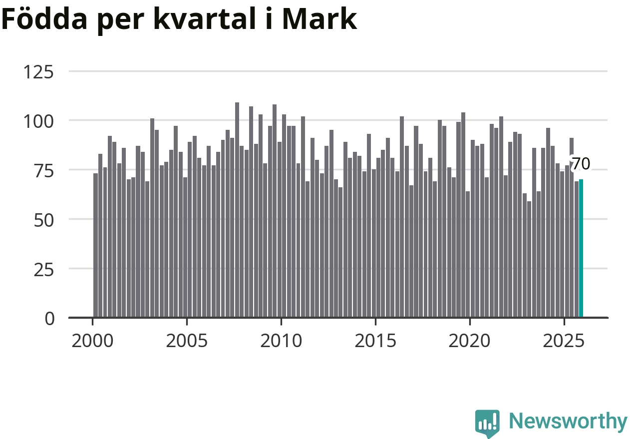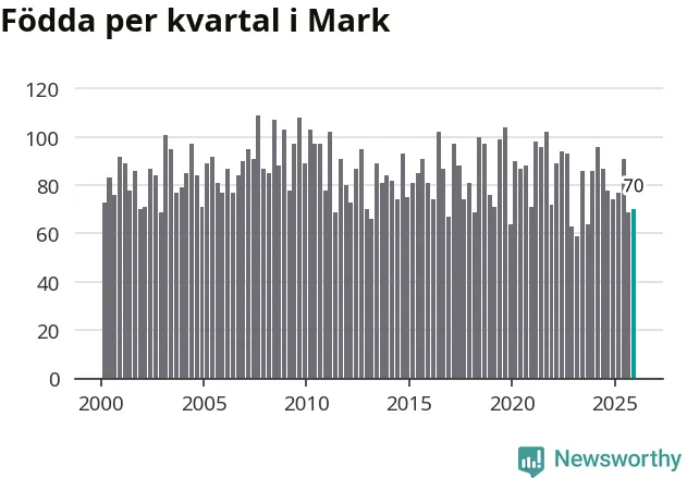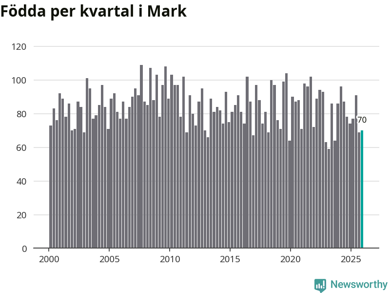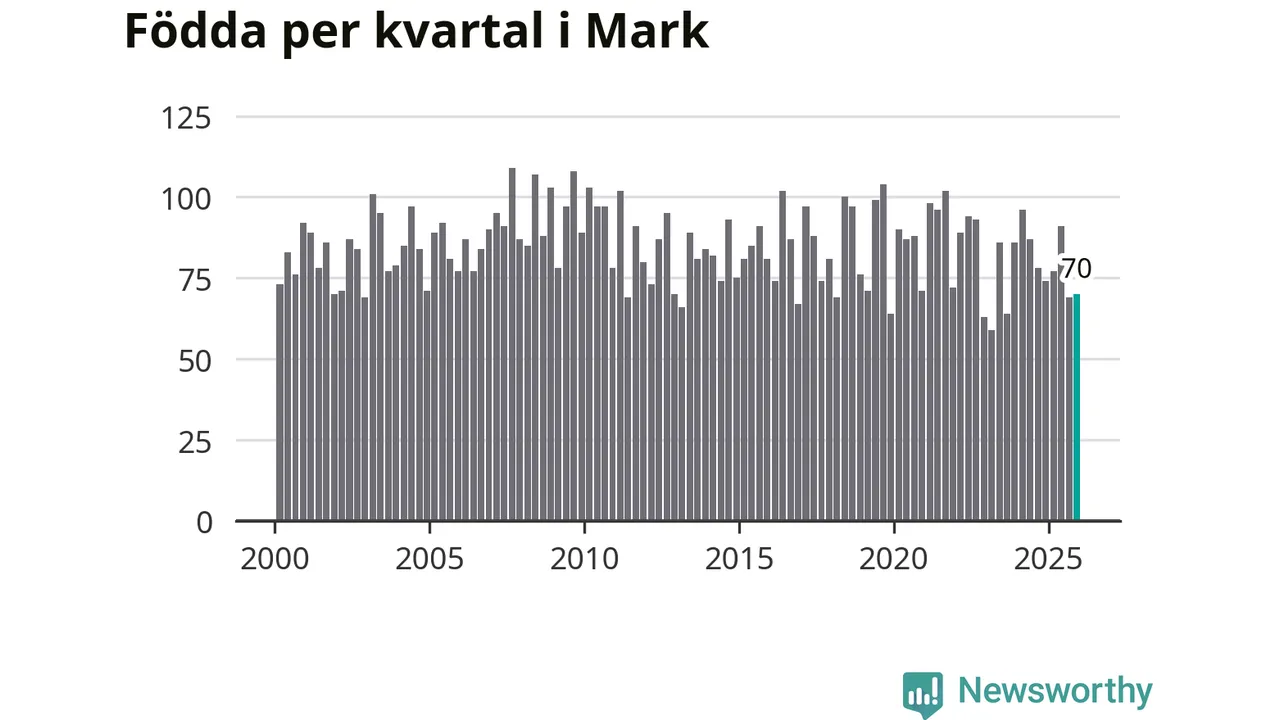 Enligt SCB:s siffror föddes 70 barn i Mark under det senaste kvartalet. Samtidigt avled 81 personer. Mark hade alltså ett negativt födelsenetto, vilket kommunen historiskt sett oftast har haft.