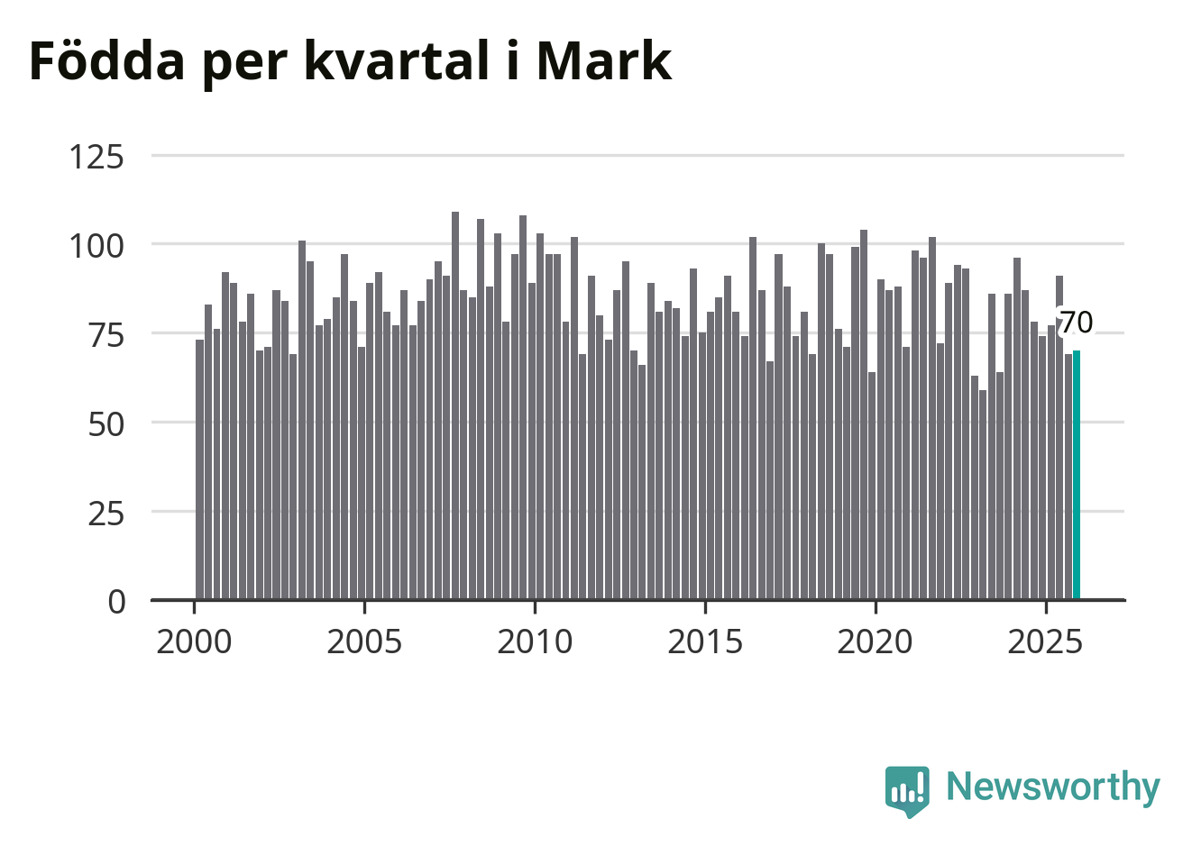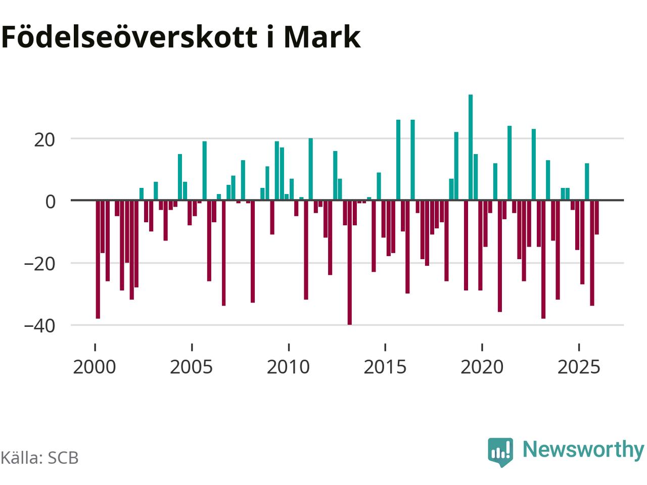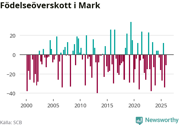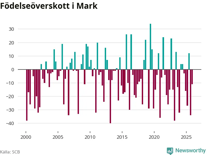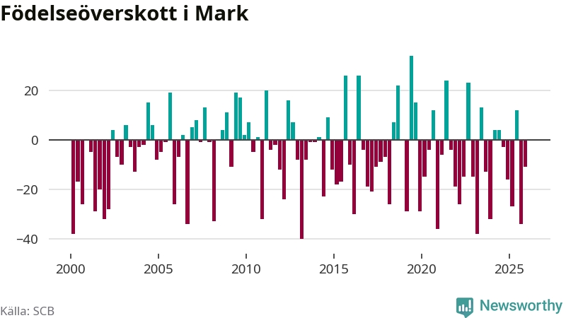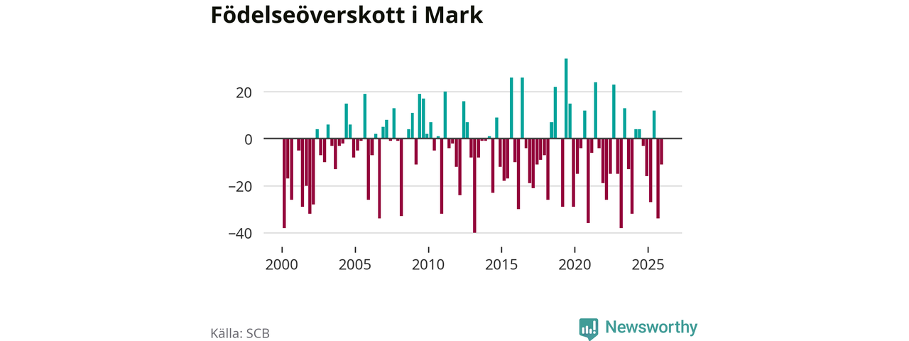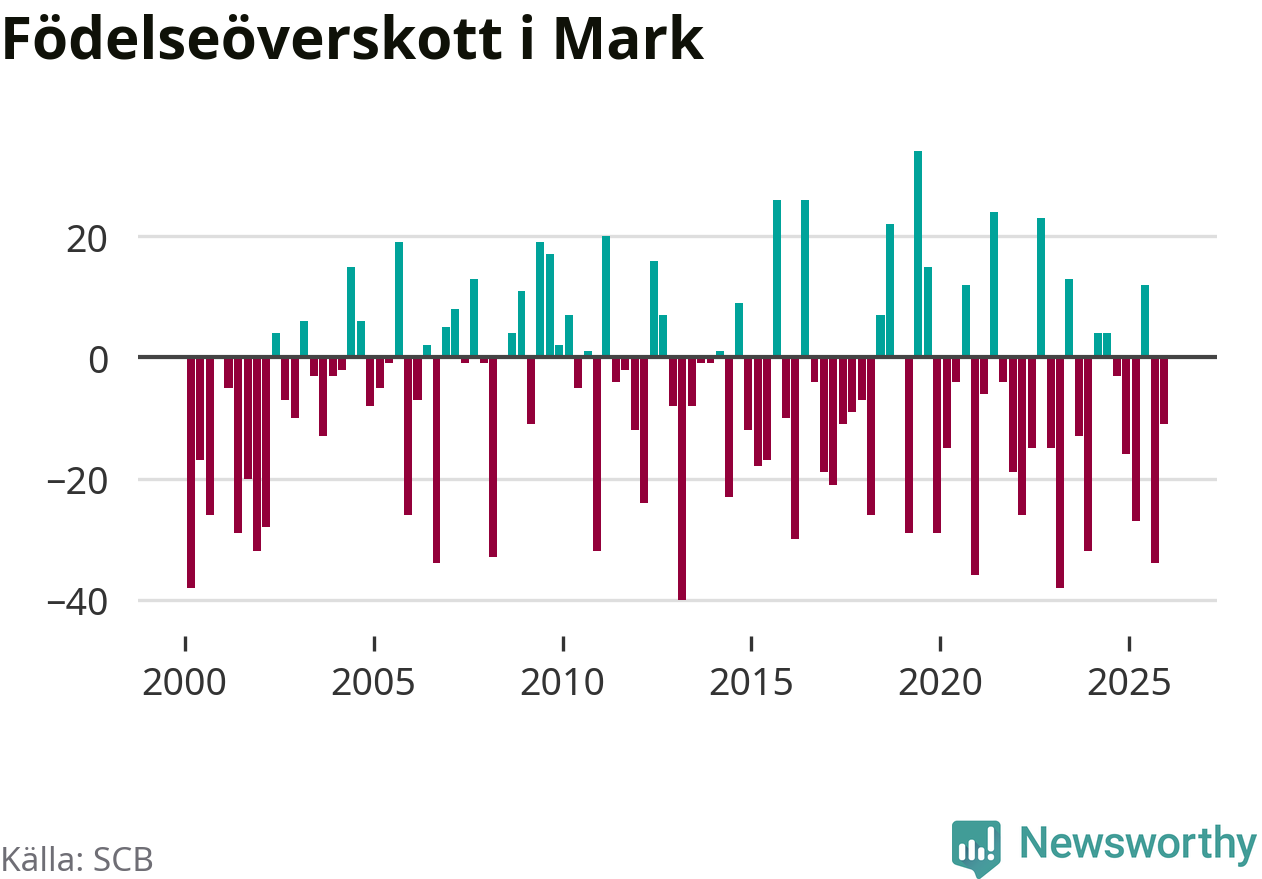 Enligt SCB:s siffror föddes 70 barn i Mark under det senaste kvartalet. Samtidigt avled 81 personer. Mark hade alltså ett negativt födelsenetto, vilket kommunen historiskt sett oftast har haft.