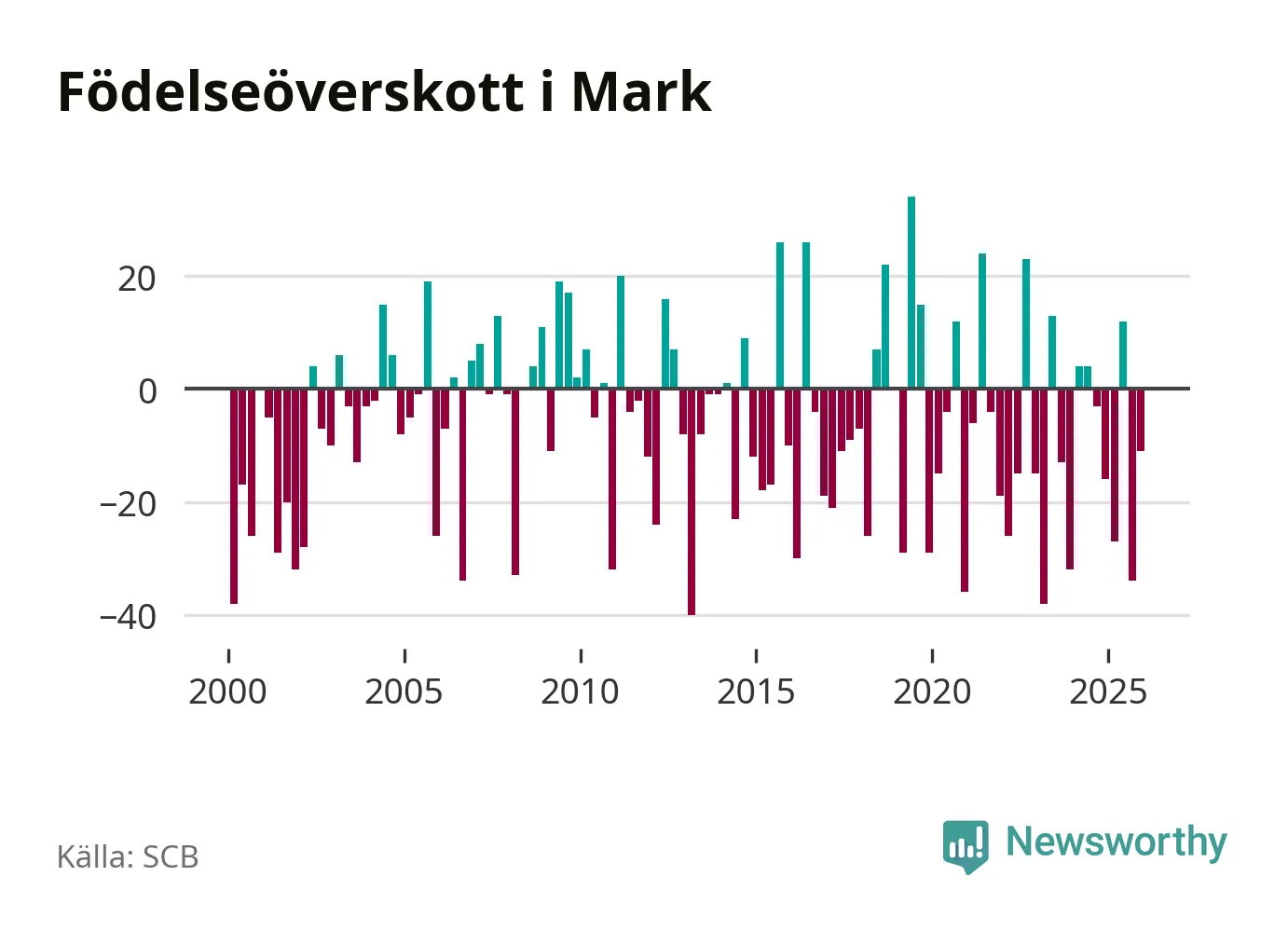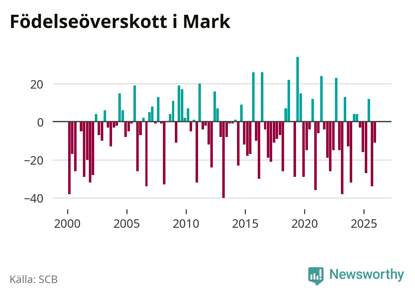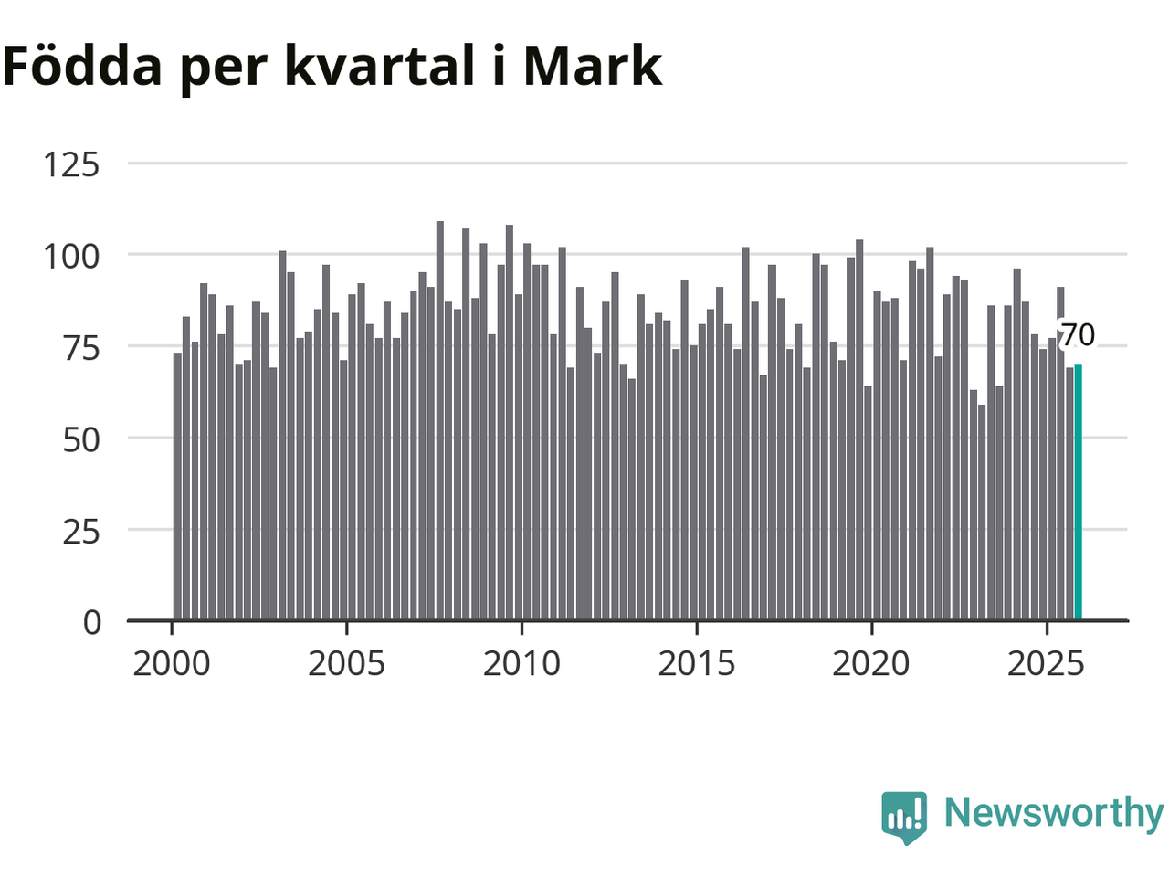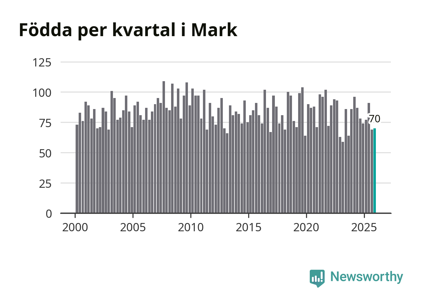 Enligt SCB:s siffror föddes 70 barn i Mark under det senaste kvartalet. Samtidigt avled 81 personer. Mark hade alltså ett negativt födelsenetto, vilket kommunen historiskt sett oftast har haft.
