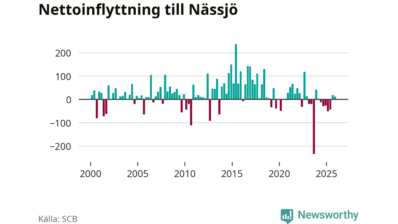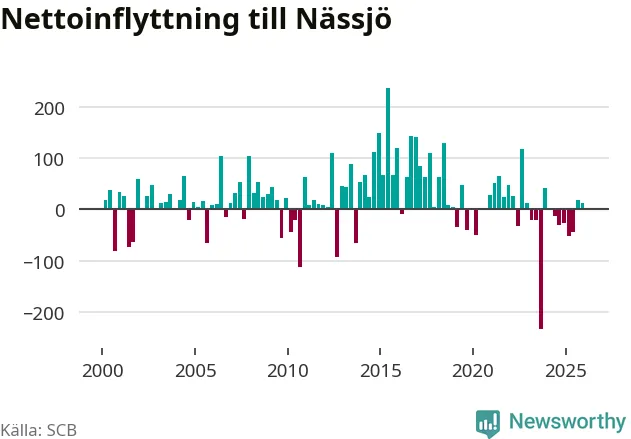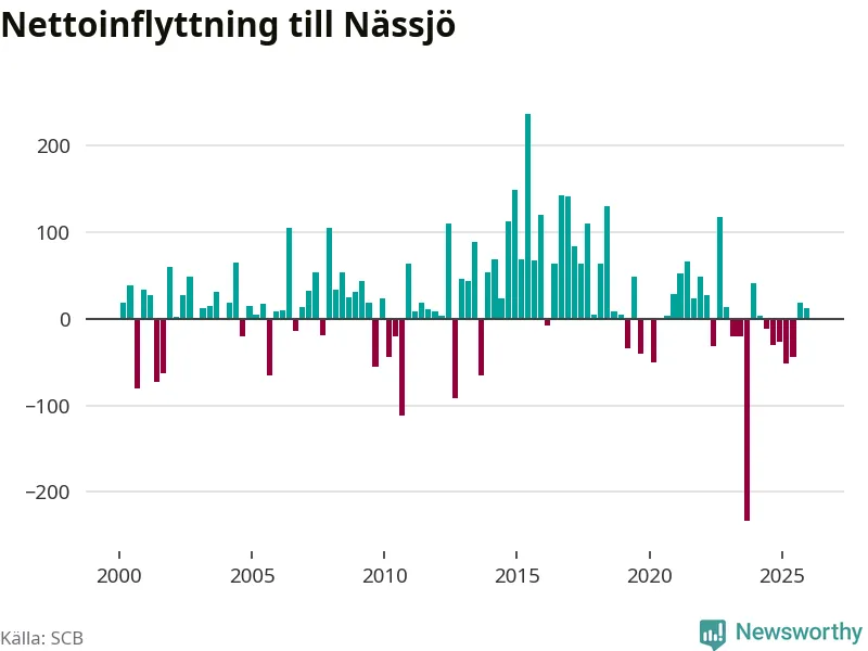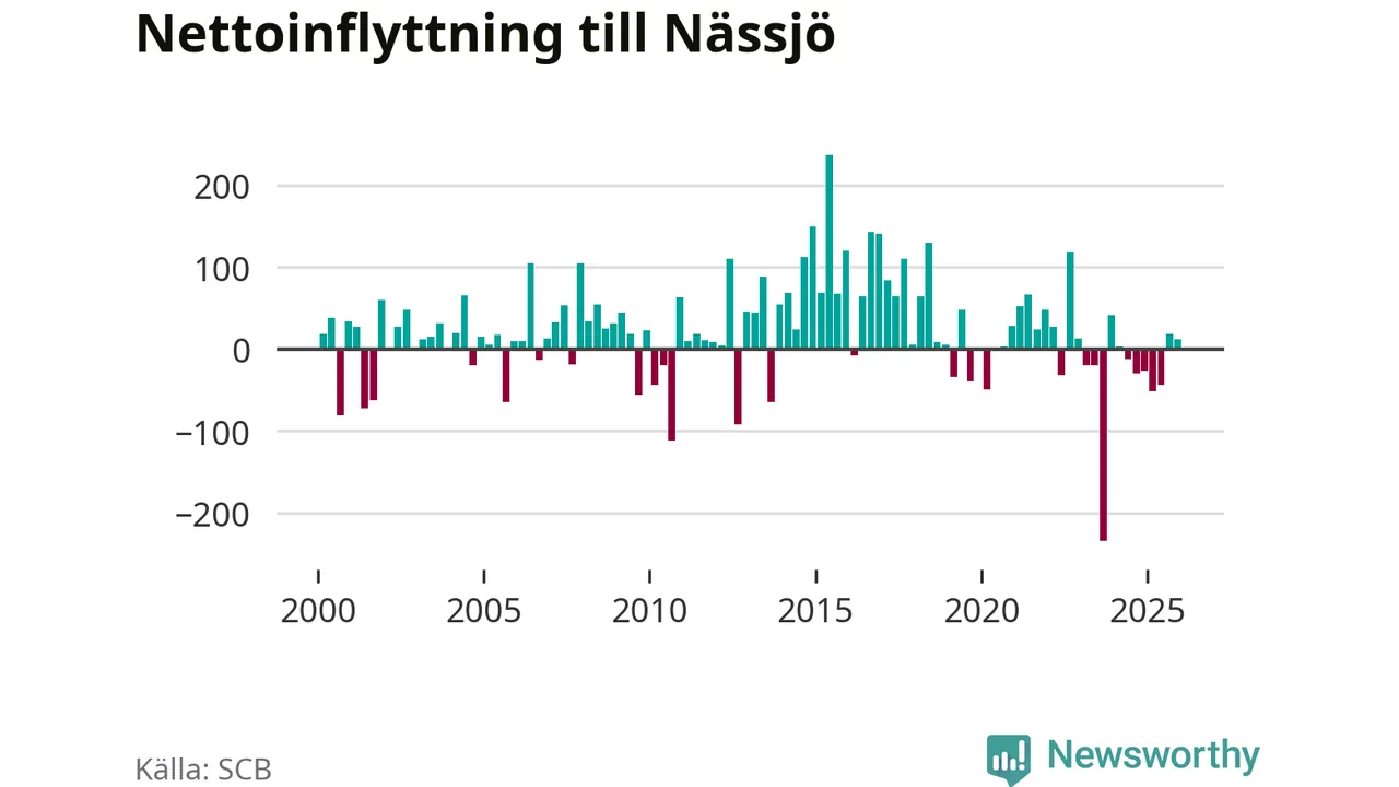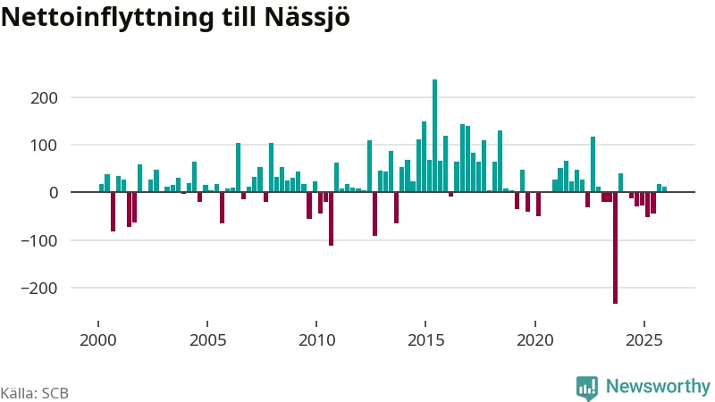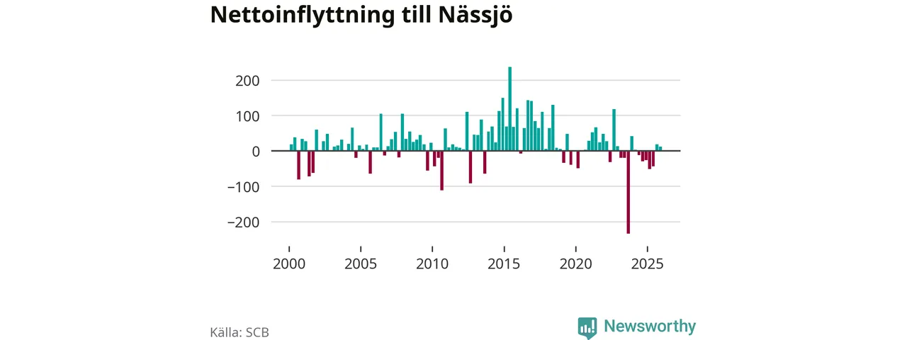 Under fjärde kvartalet 2025 flyttade 358 personer till kommunen medan 346 personer flyttade därifrån. Sedan seklets början har Nässjö oftast haft ett positivt flyttnetto, inklusive det senaste kvartalet.