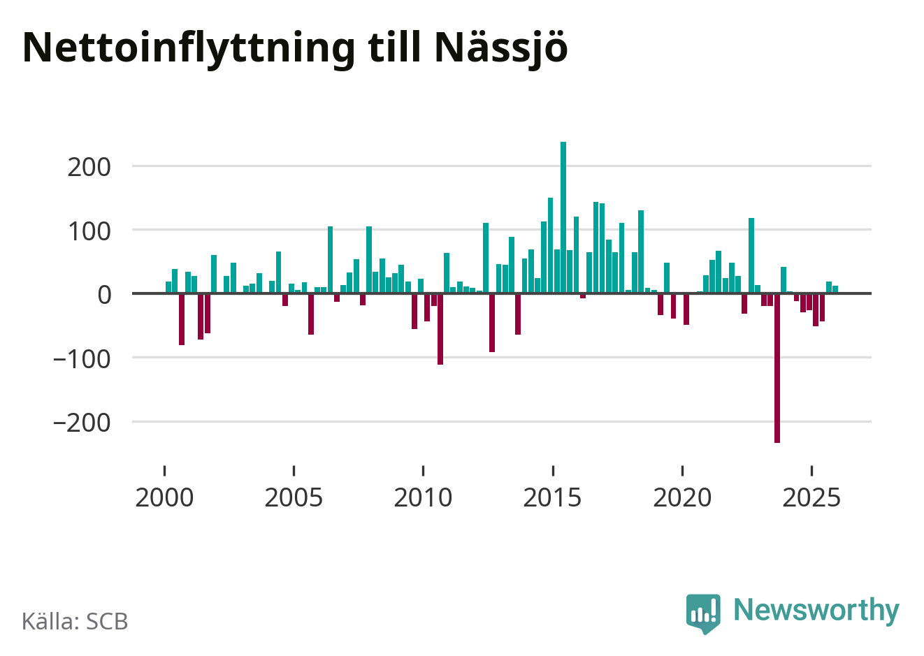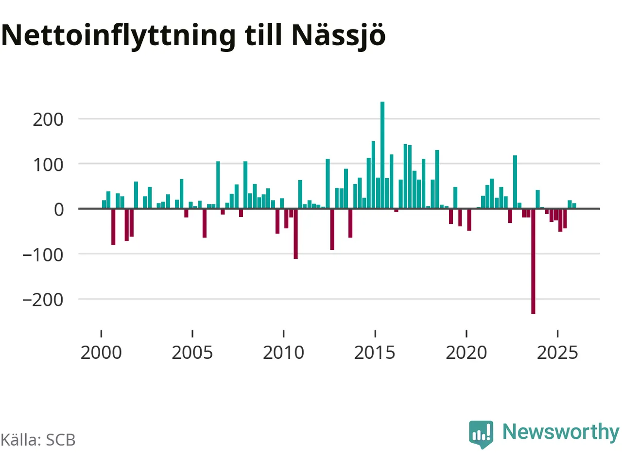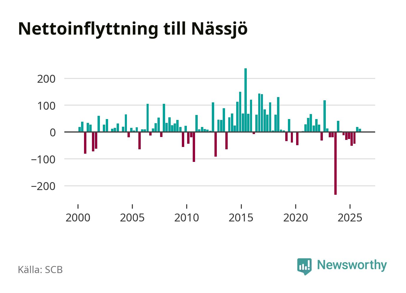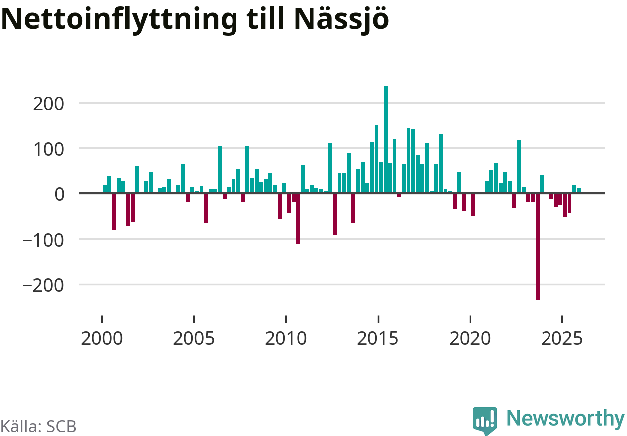 Under fjärde kvartalet 2025 flyttade 358 personer till kommunen medan 346 personer flyttade därifrån. Sedan seklets början har Nässjö oftast haft ett positivt flyttnetto, inklusive det senaste kvartalet.