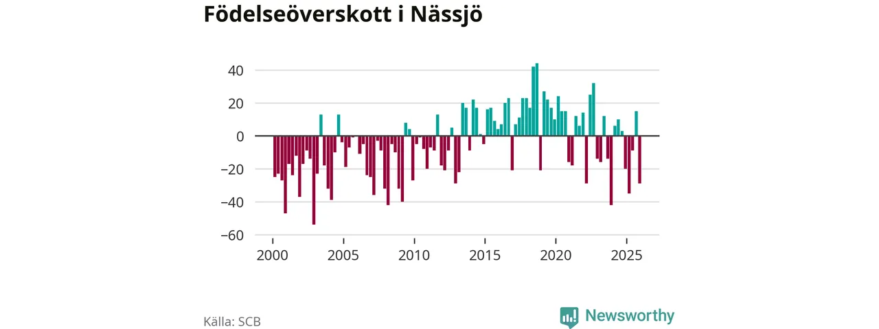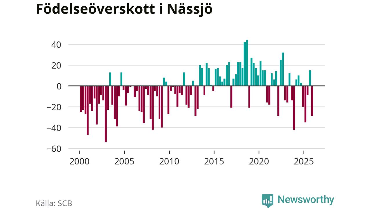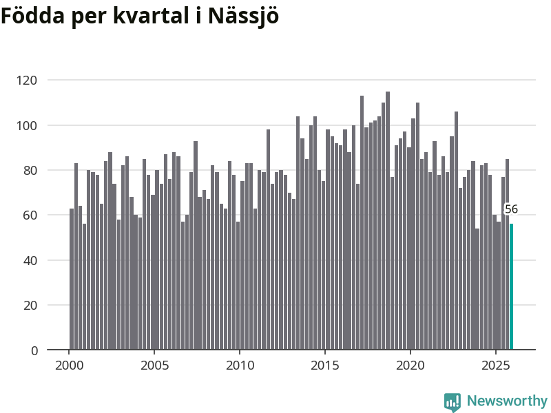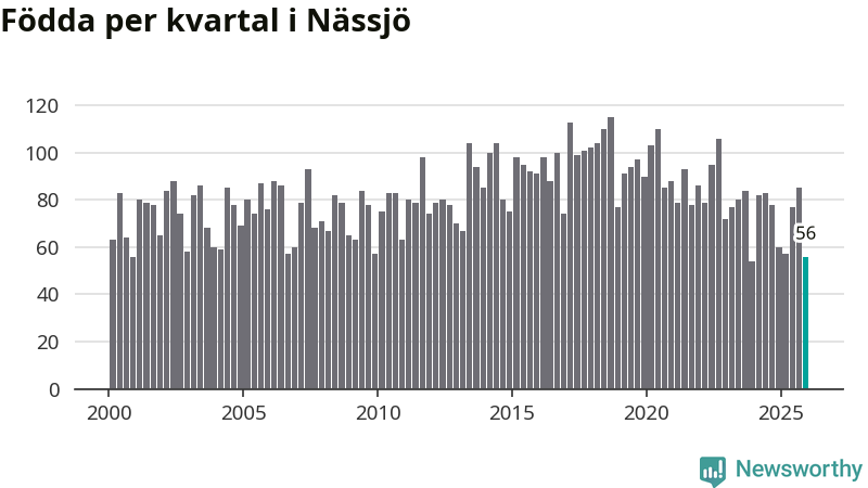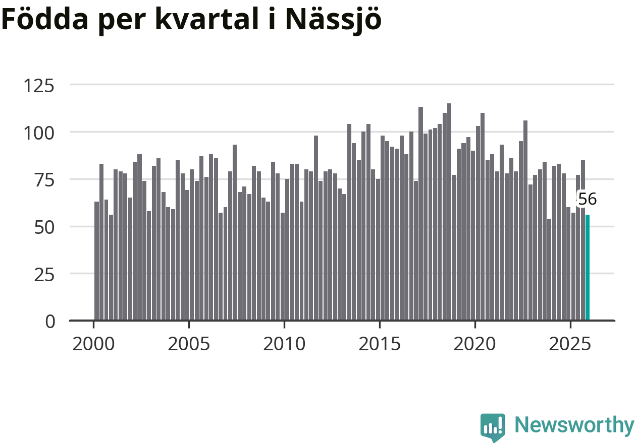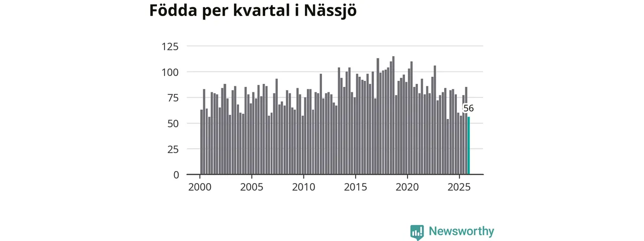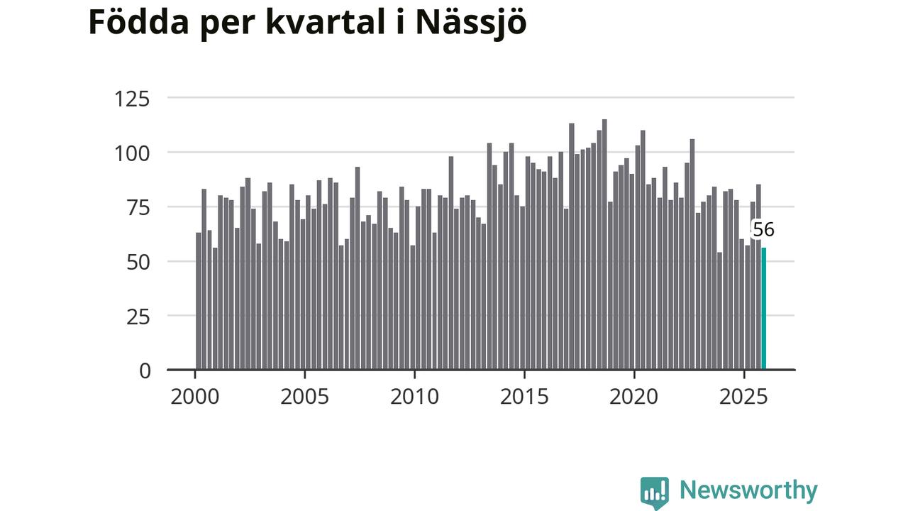 Enligt SCB:s siffror föddes 56 barn i Nässjö under det senaste kvartalet. Samtidigt avled 85 personer. Nässjö hade alltså ett negativt födelsenetto under fjärde kvartalet. Historiskt har dock födelsenettot oftast varit positivt.