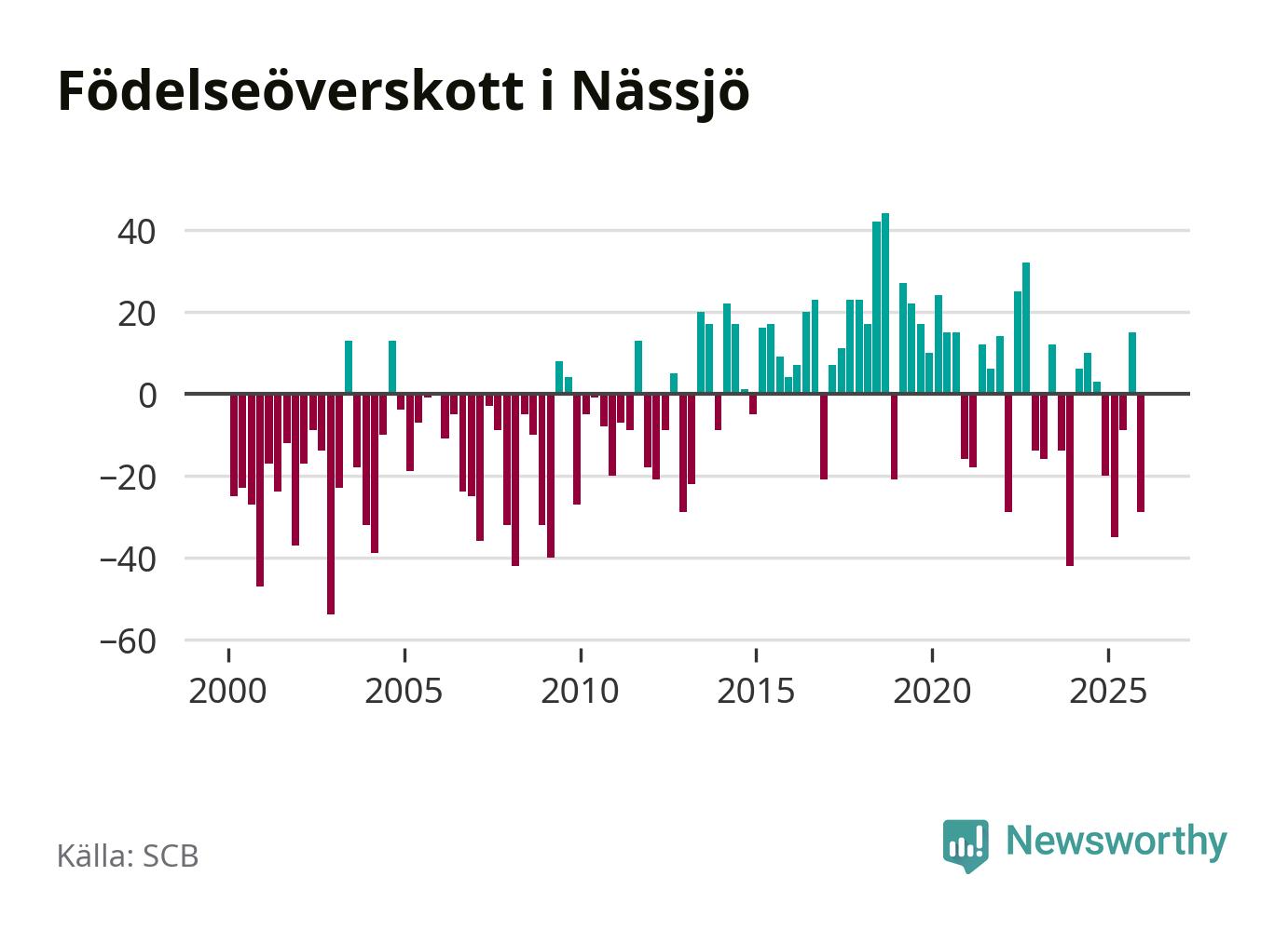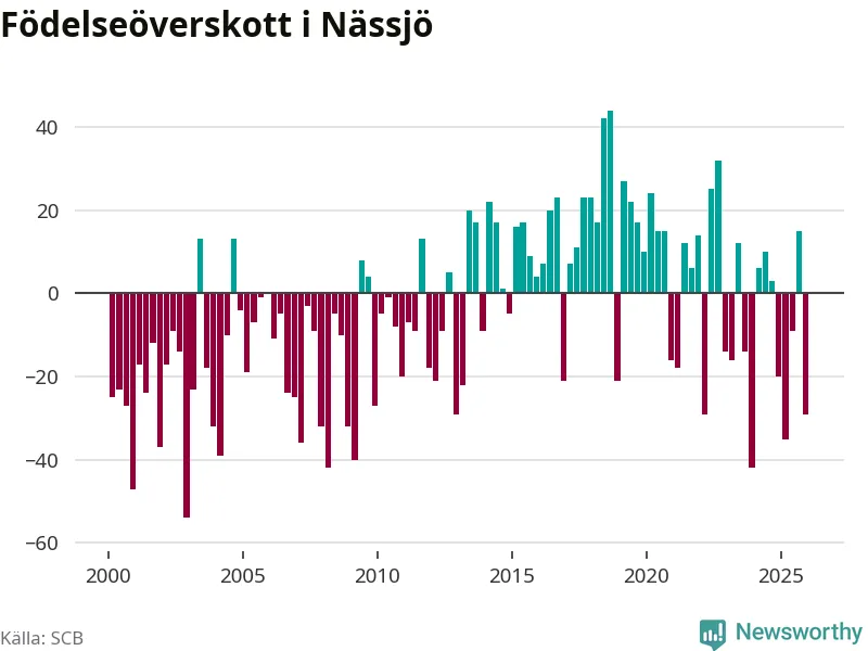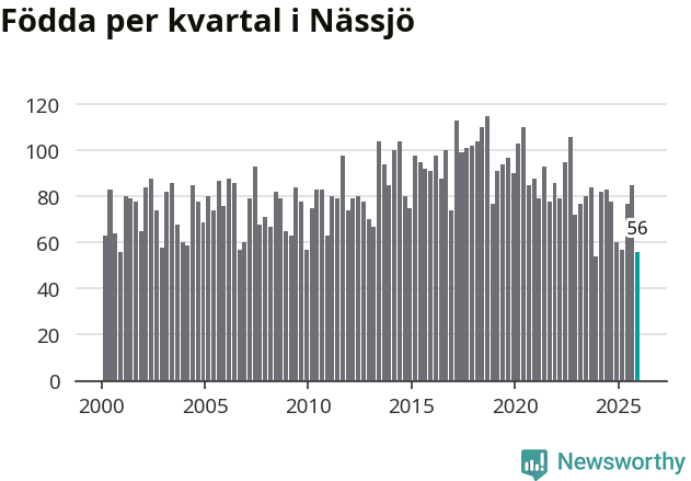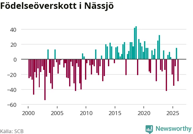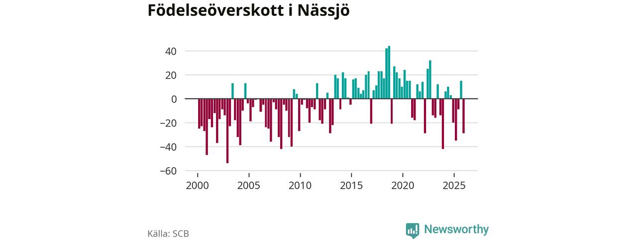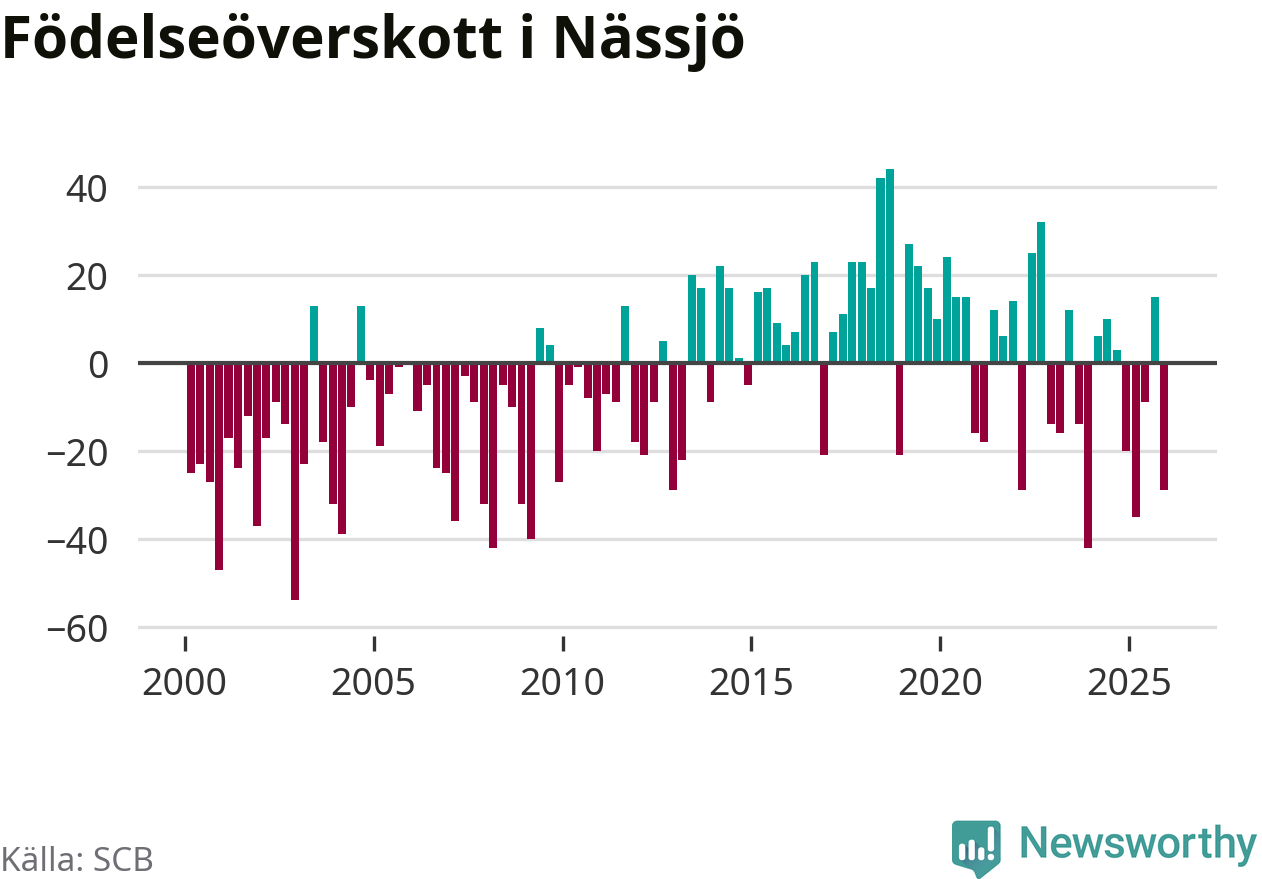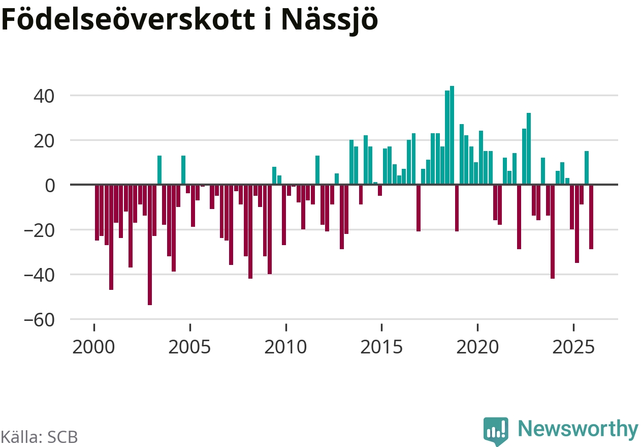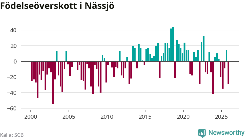 Enligt SCB:s siffror föddes 56 barn i Nässjö under det senaste kvartalet. Samtidigt avled 85 personer. Nässjö hade alltså ett negativt födelsenetto under fjärde kvartalet. Historiskt har dock födelsenettot oftast varit positivt.
