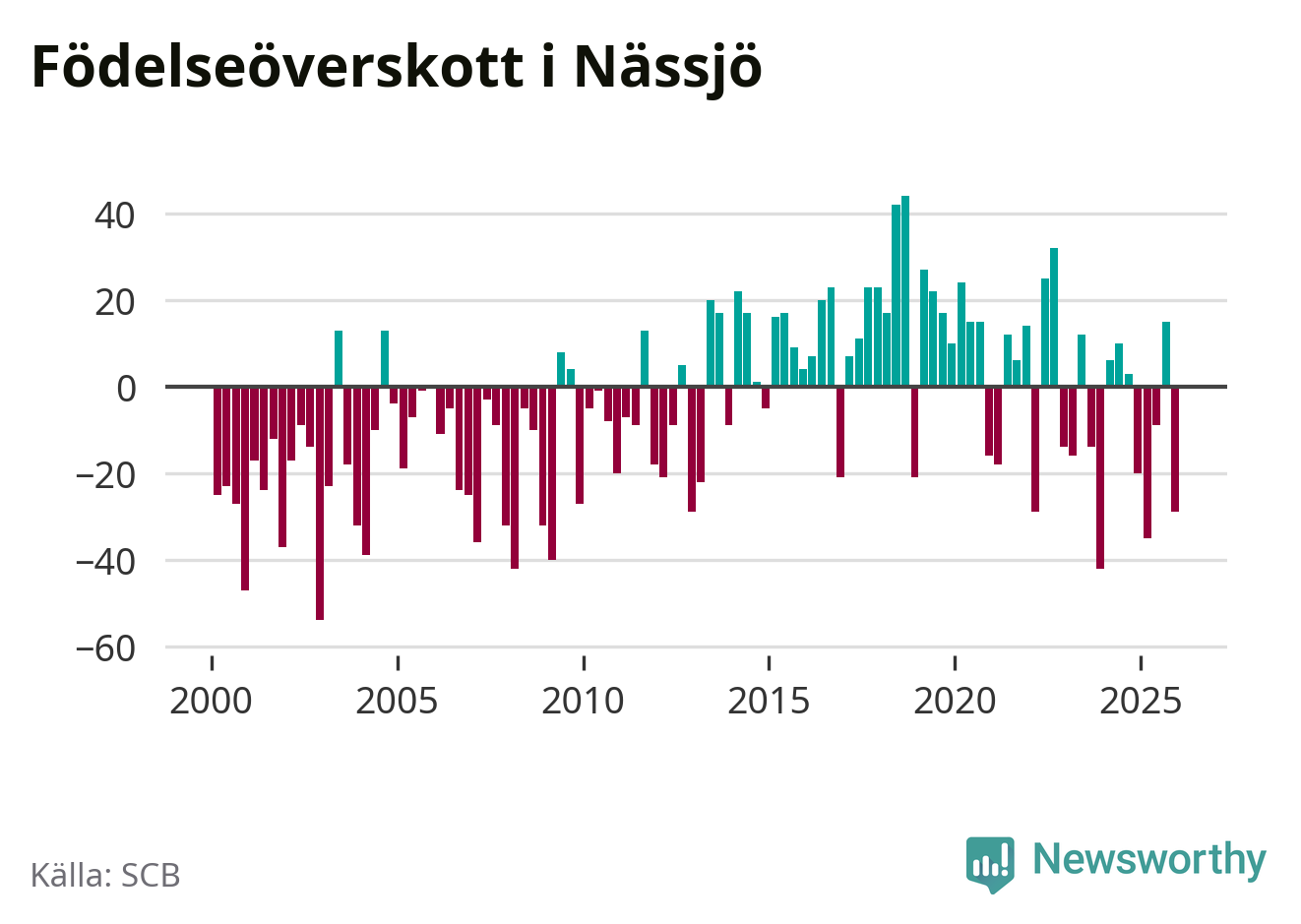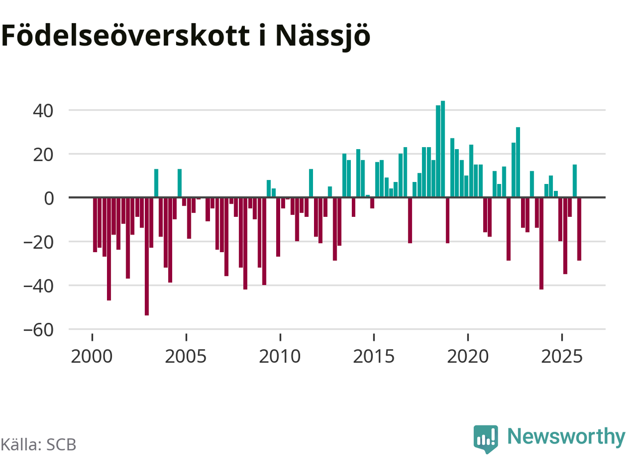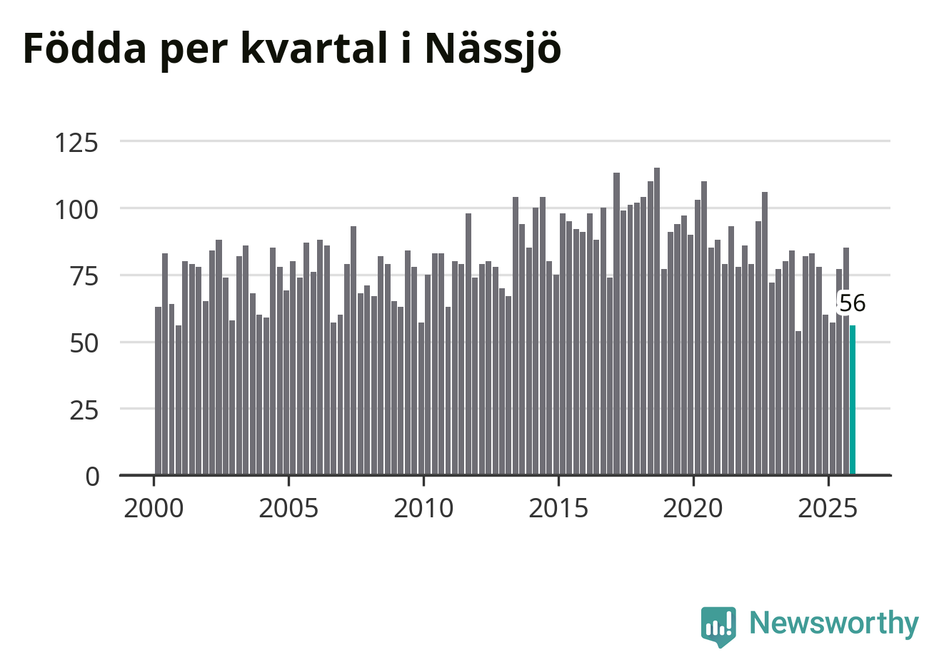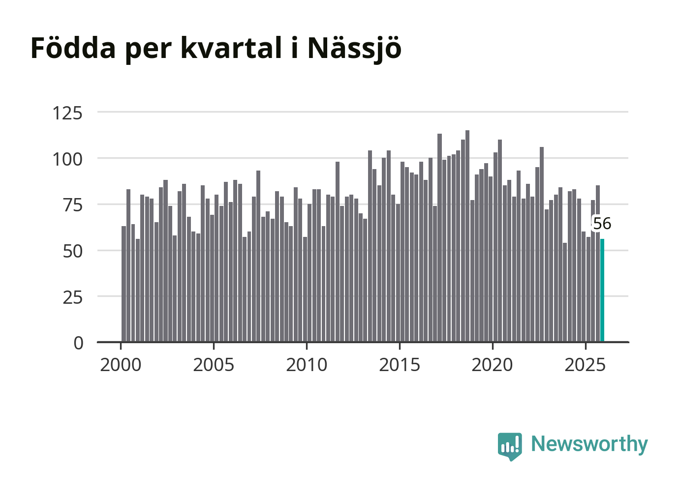 Enligt SCB:s siffror föddes 56 barn i Nässjö under det senaste kvartalet. Samtidigt avled 85 personer. Nässjö hade alltså ett negativt födelsenetto under fjärde kvartalet. Historiskt har dock födelsenettot oftast varit positivt.
