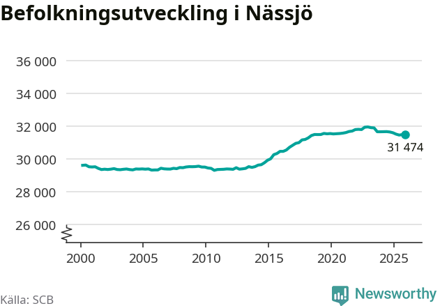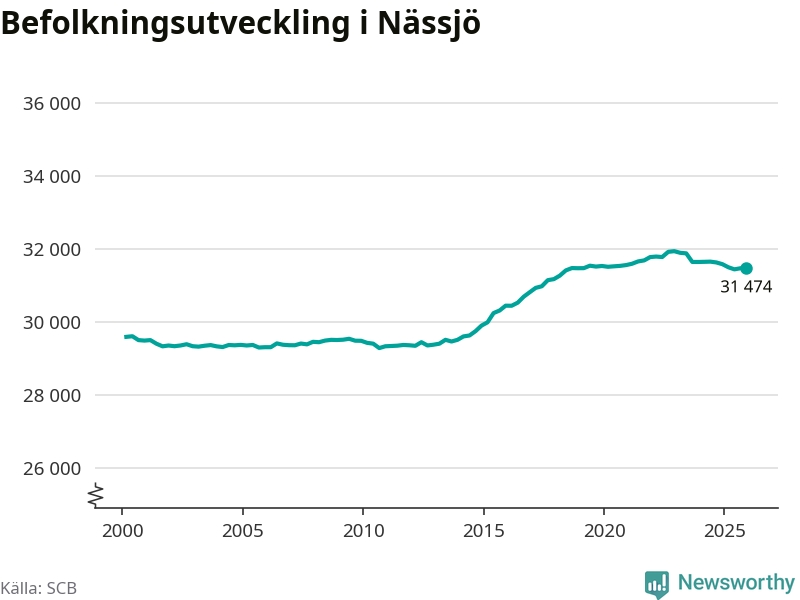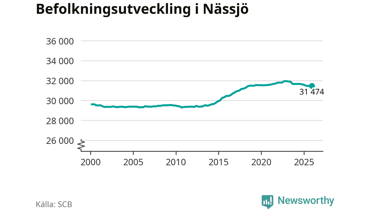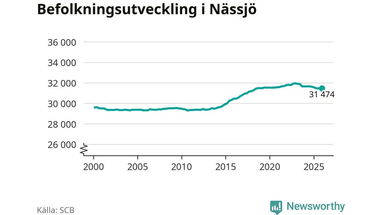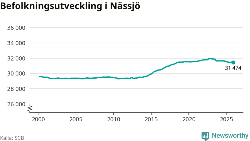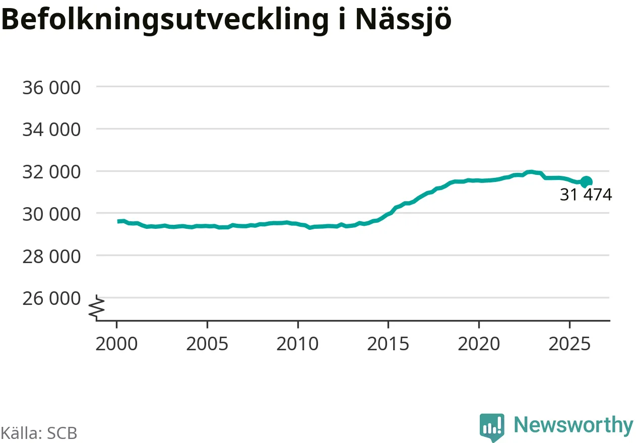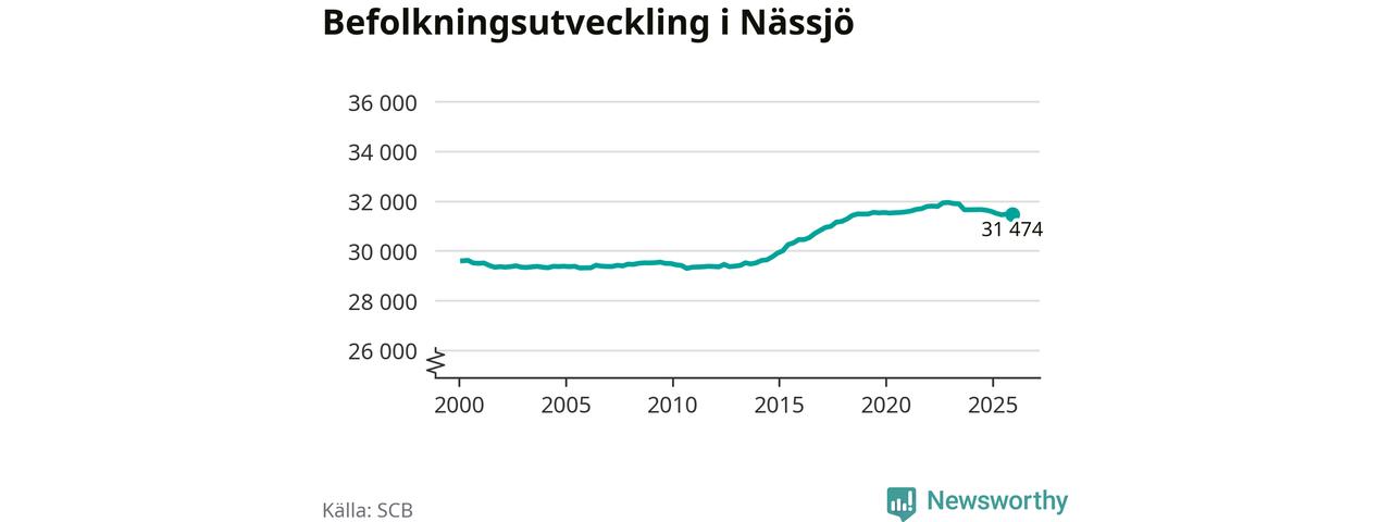 Den 31 december bodde 31 474 personer i Nässjö kommun, enligt SCB:s senaste siffror. Det är något färre än i slutet av tredje kvartalet, men skillnaden är så liten att den lika gärna kan bero på den lilla justering som SCB gör av siffrorna för att skydda enskilda individers identitet.