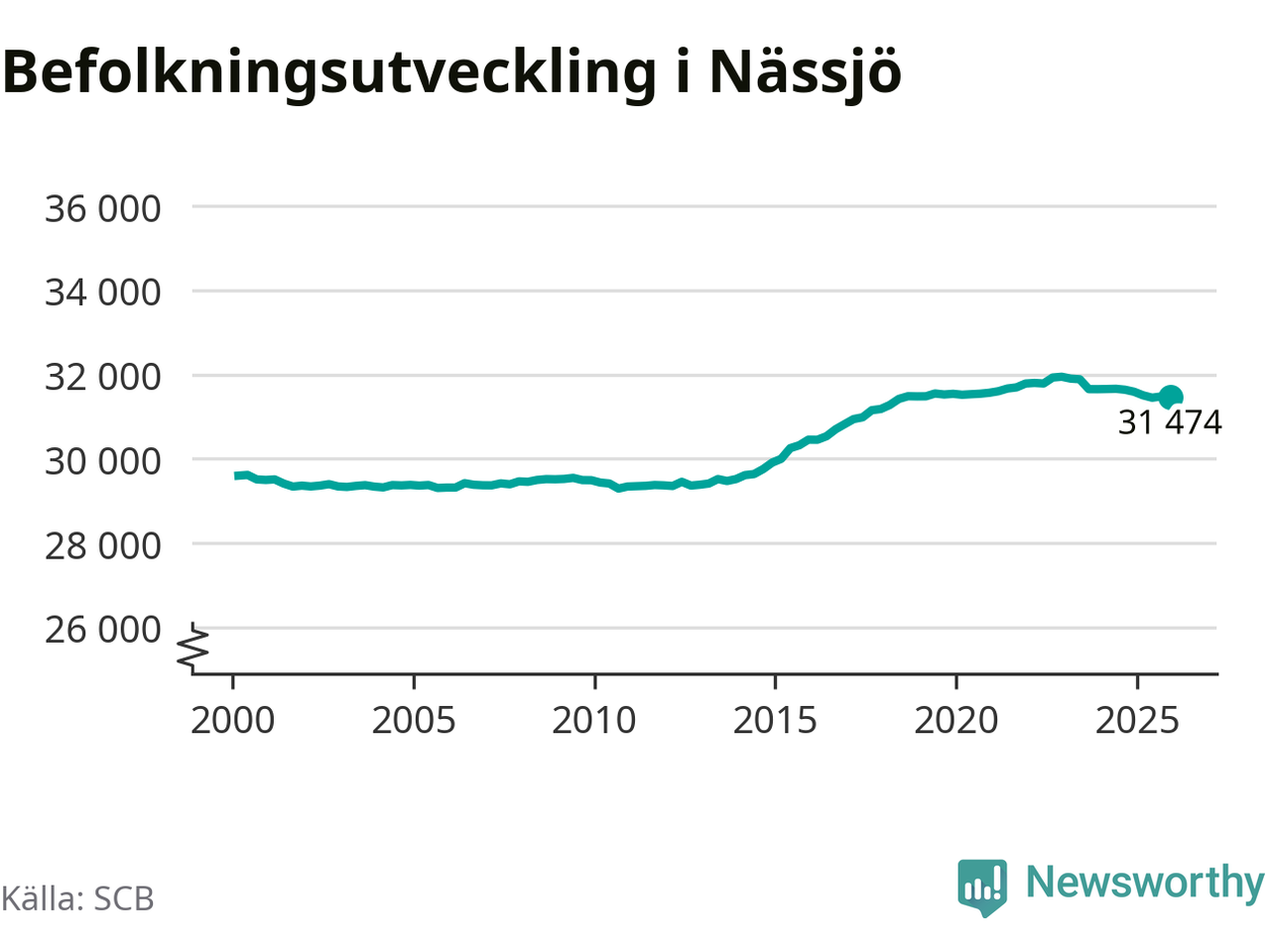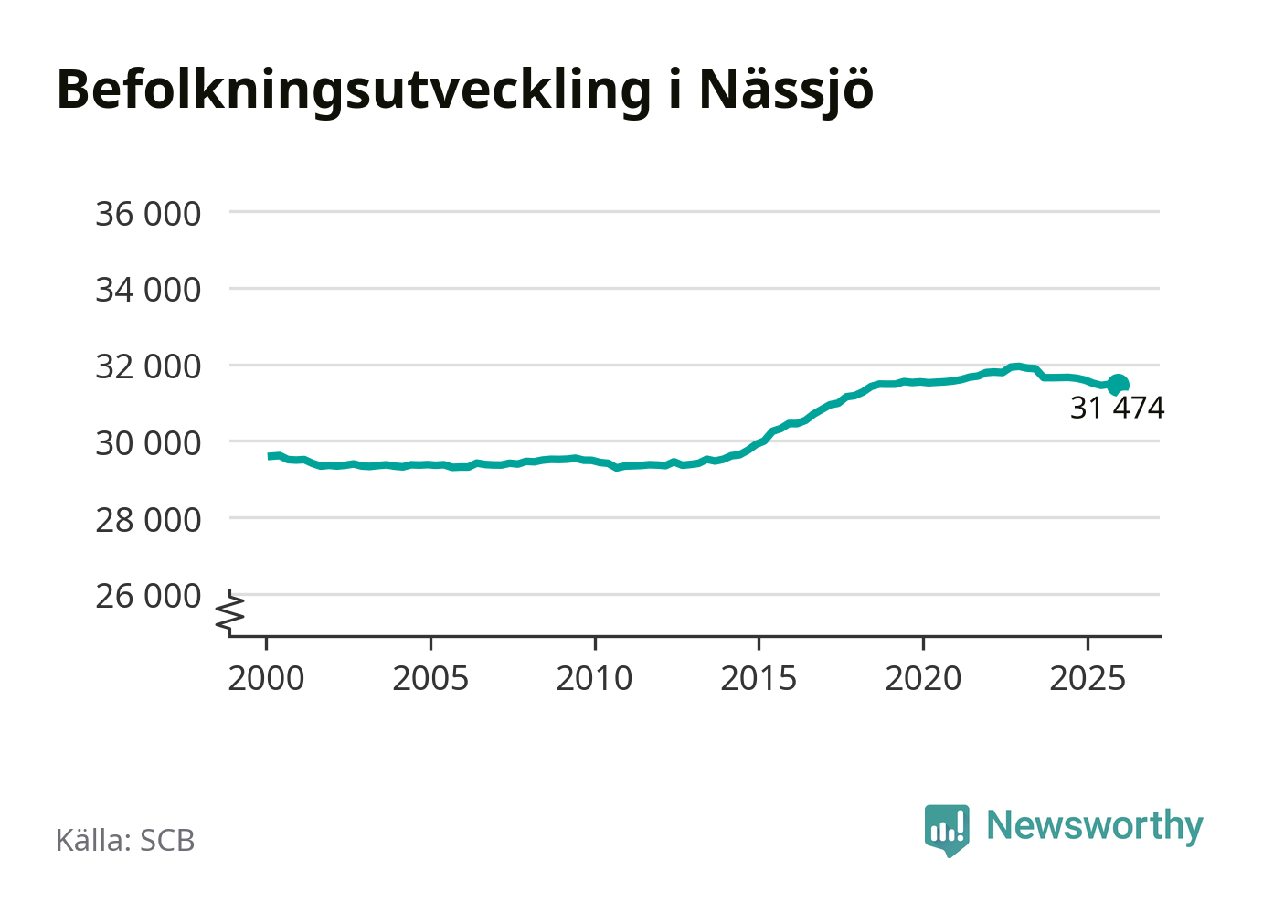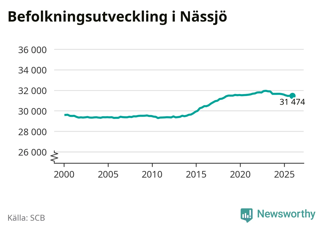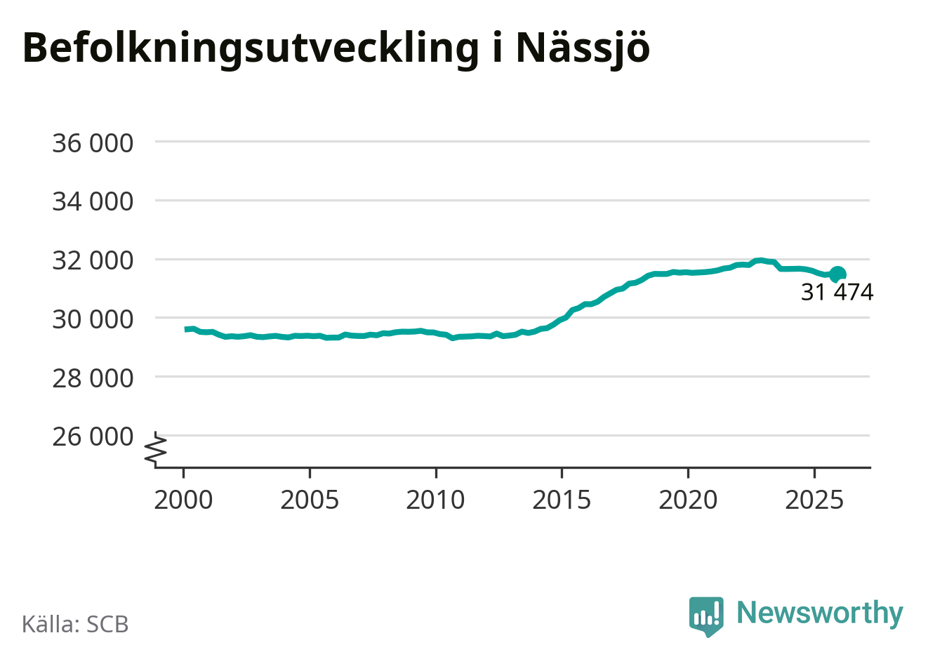 Den 31 december bodde 31 474 personer i Nässjö kommun, enligt SCB:s senaste siffror. Det är något färre än i slutet av tredje kvartalet, men skillnaden är så liten att den lika gärna kan bero på den lilla justering som SCB gör av siffrorna för att skydda enskilda individers identitet.