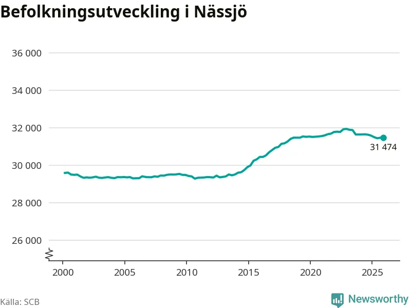 Jämfört med för ett år sedan har befolkningen i Nässjö minskat med drygt 110 personer. Sedan millennieskiftet har folkmängden ökat med runt 1 880 personer, eller sex procent.
