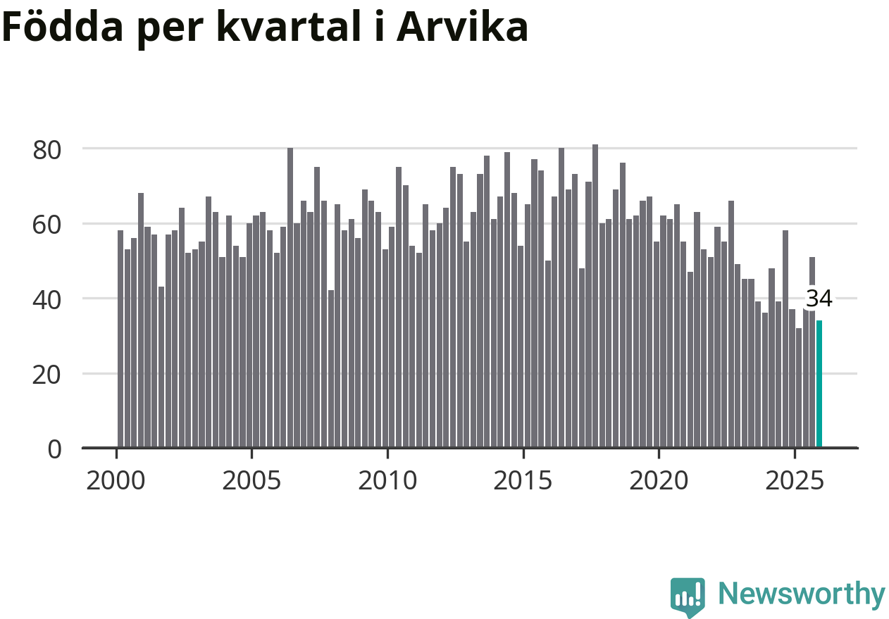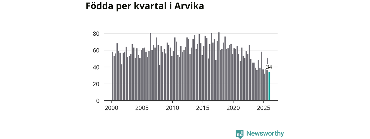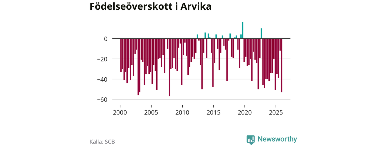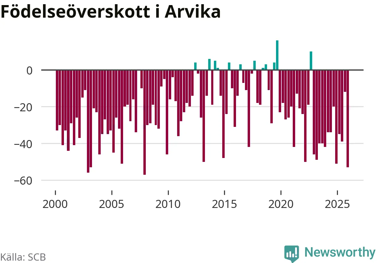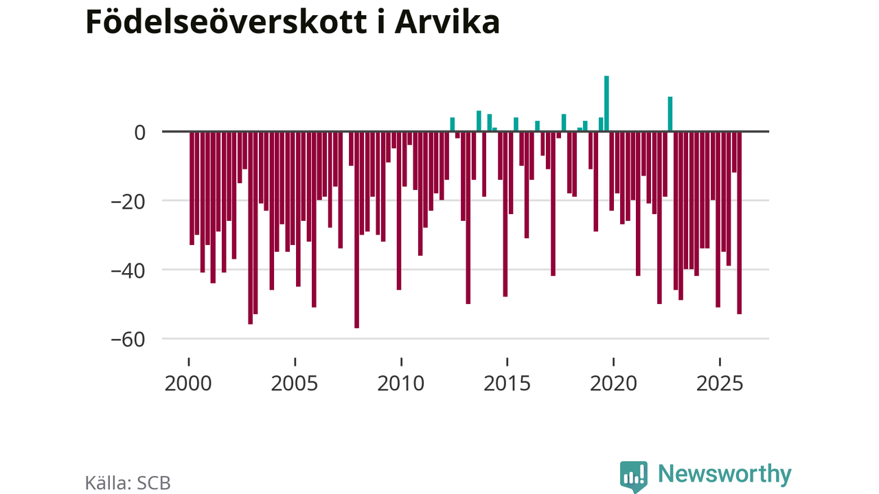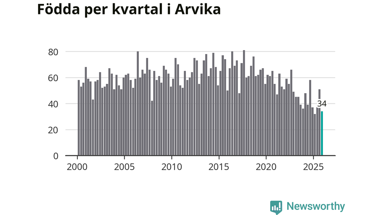 Enligt SCB:s siffror föddes 34 barn i Arvika under det senaste kvartalet. Samtidigt avled 87 personer. Arvika hade alltså ett negativt födelsenetto, vilket kommunen historiskt sett nästan alltid har haft.