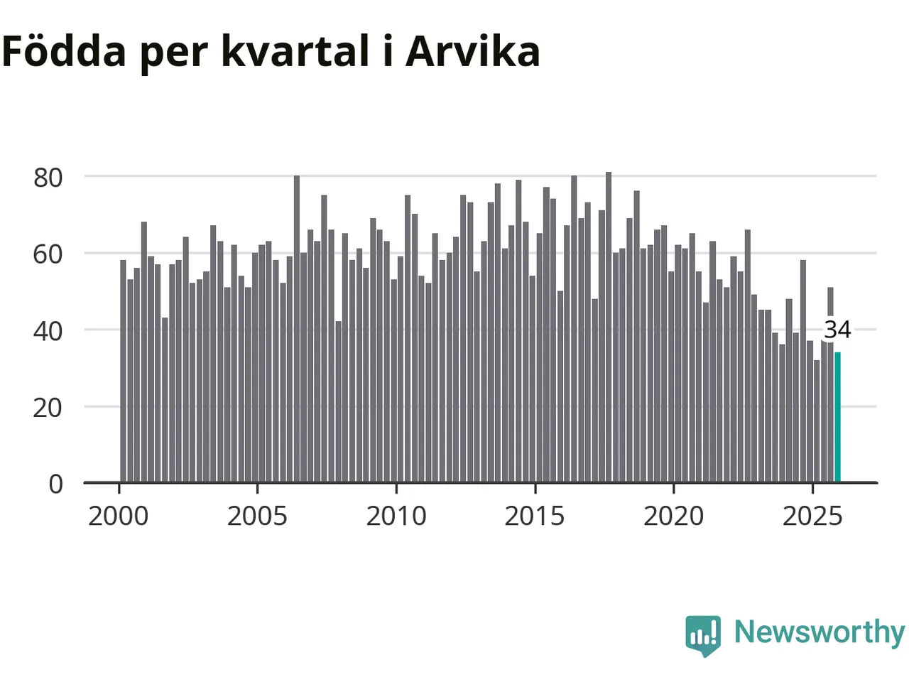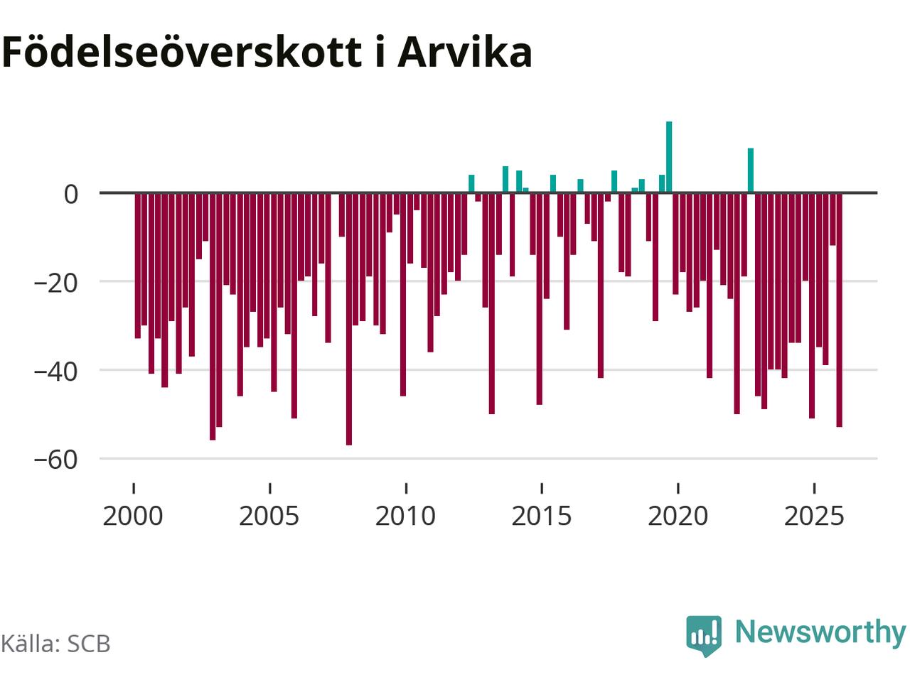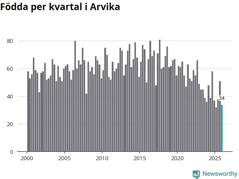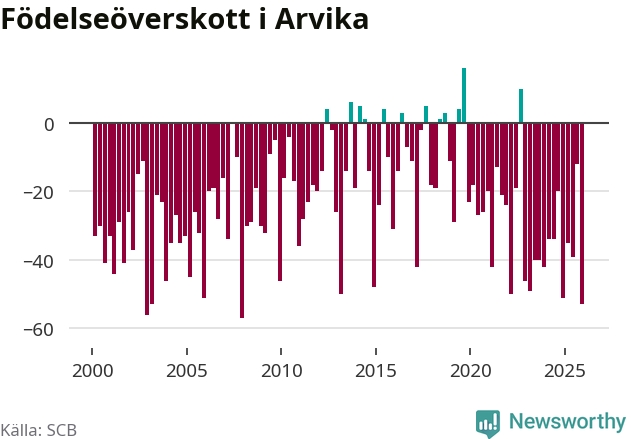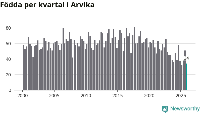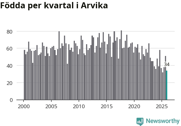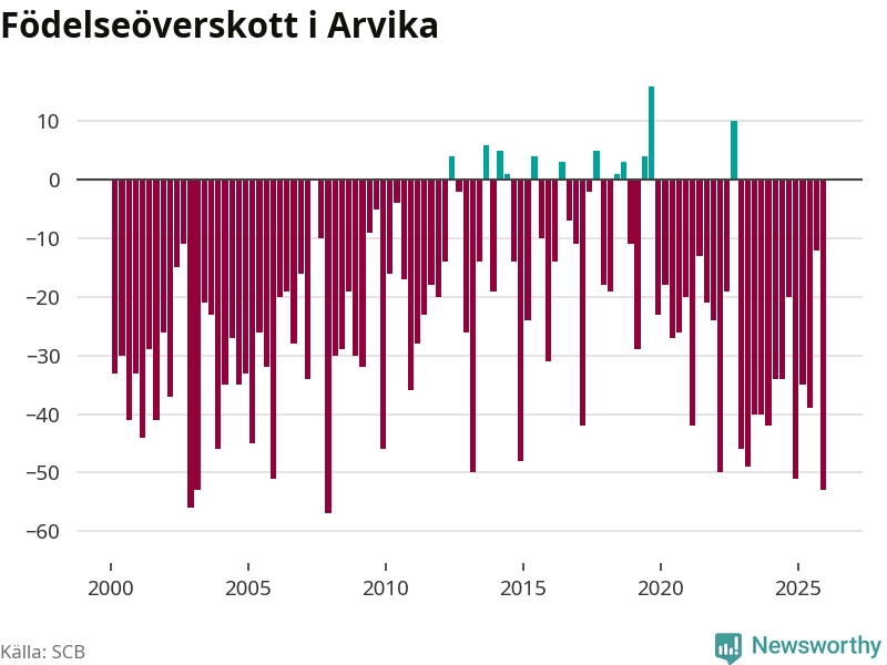 Enligt SCB:s siffror föddes 34 barn i Arvika under det senaste kvartalet. Samtidigt avled 87 personer. Arvika hade alltså ett negativt födelsenetto, vilket kommunen historiskt sett nästan alltid har haft.