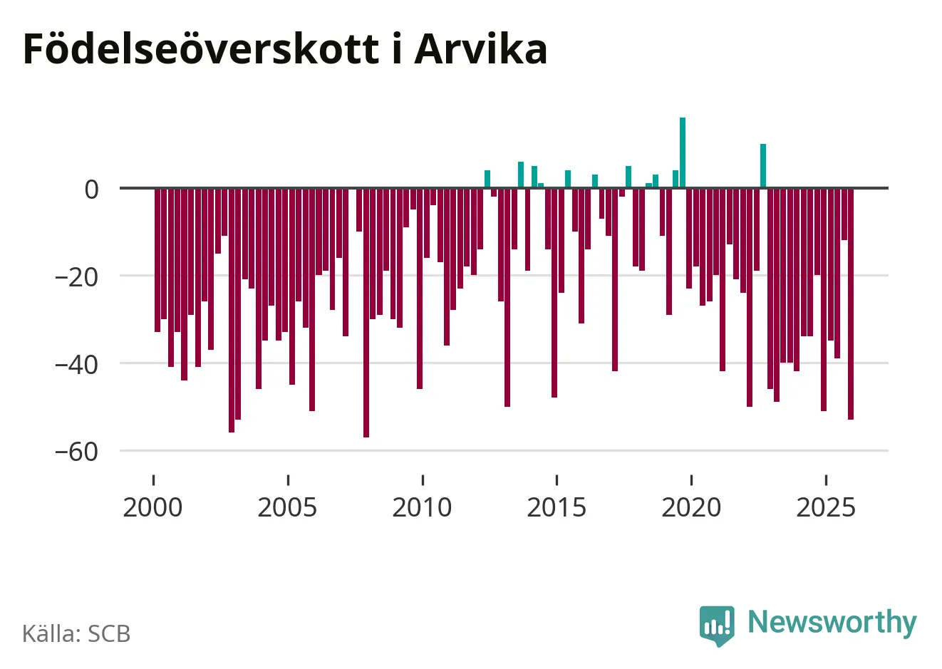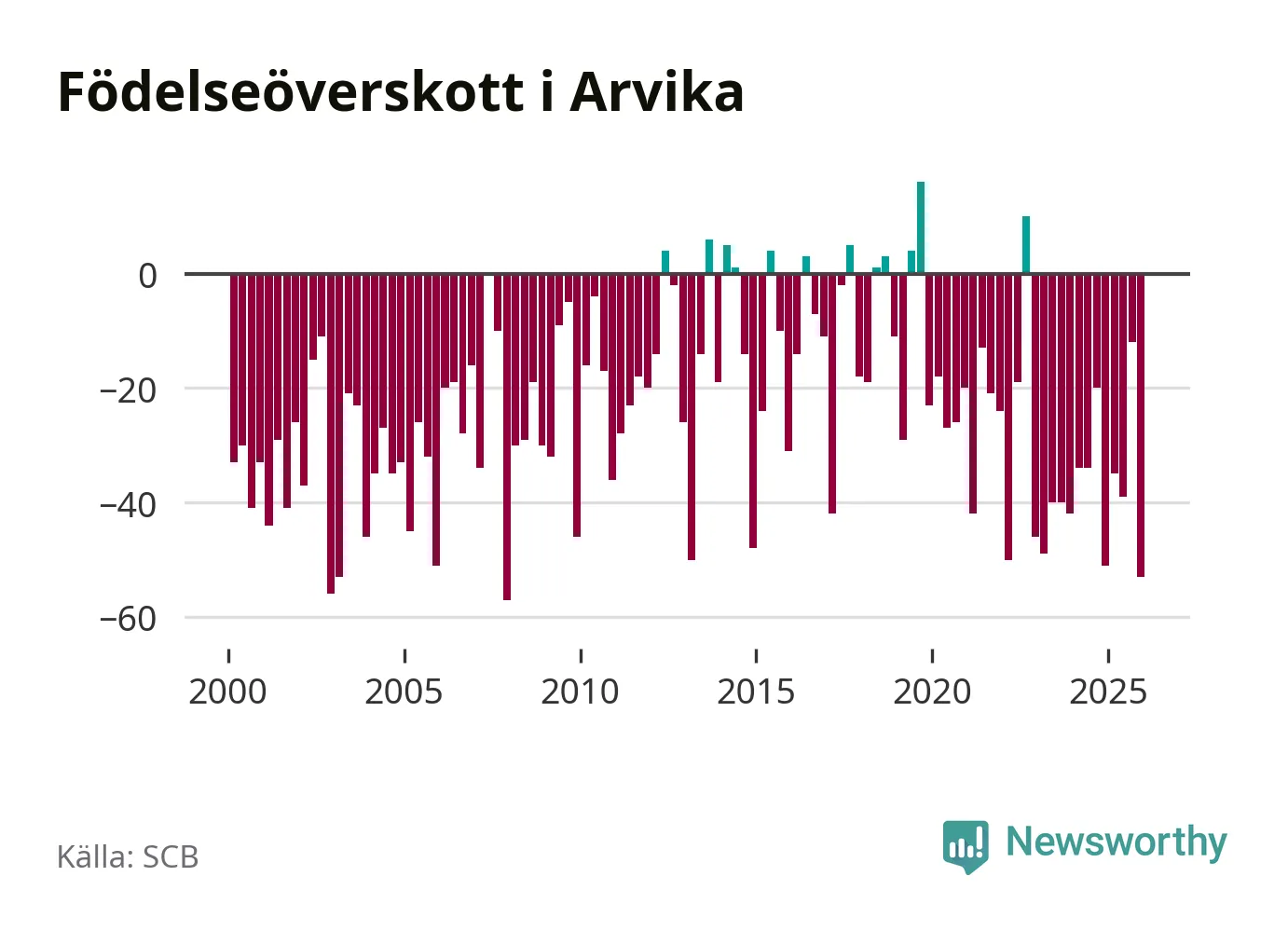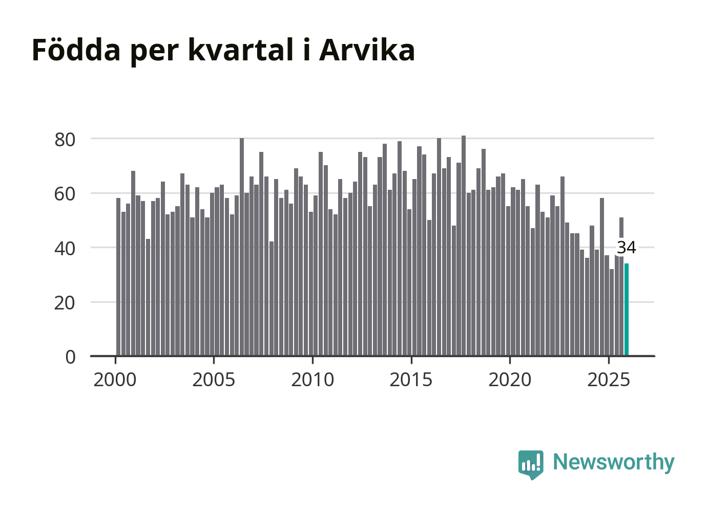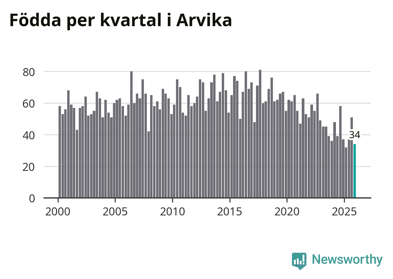 Enligt SCB:s siffror föddes 34 barn i Arvika under det senaste kvartalet. Samtidigt avled 87 personer. Arvika hade alltså ett negativt födelsenetto, vilket kommunen historiskt sett nästan alltid har haft.