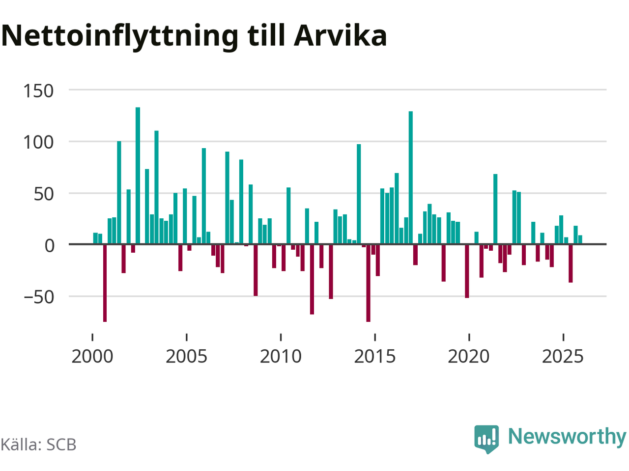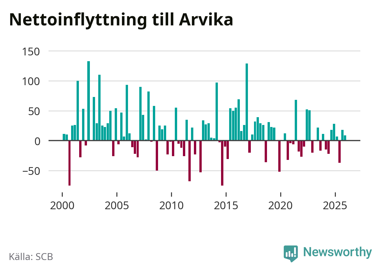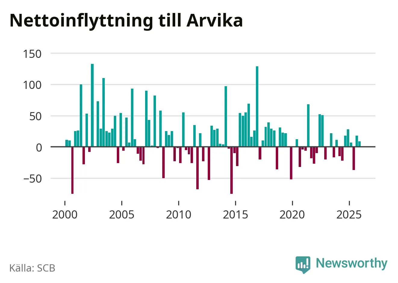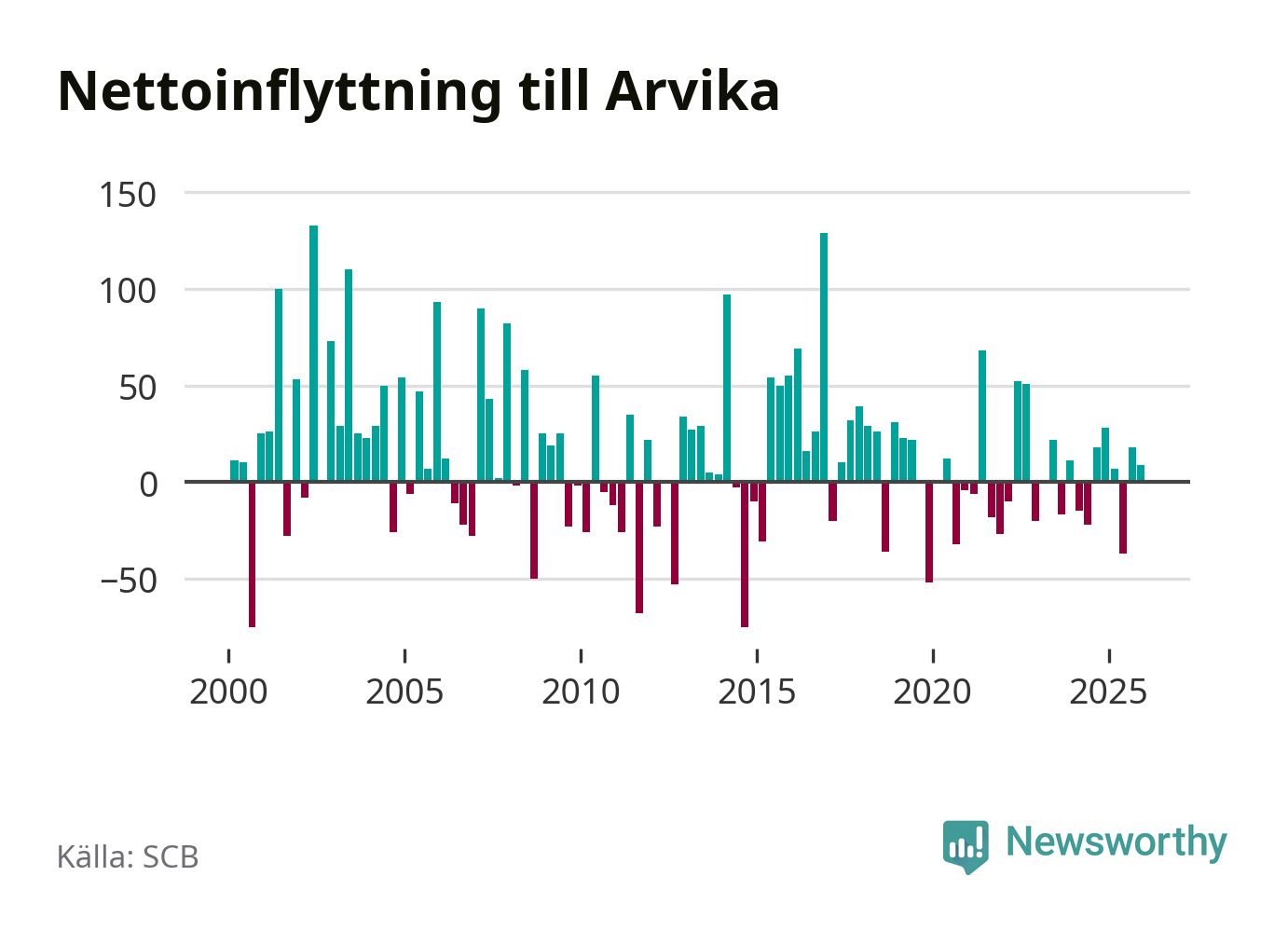 Enligt SCB:s siffror föddes 34 barn i Arvika under det senaste kvartalet. Samtidigt avled 87 personer. Arvika hade alltså ett negativt födelsenetto, vilket kommunen historiskt sett nästan alltid har haft.