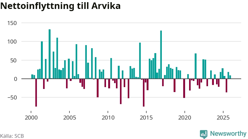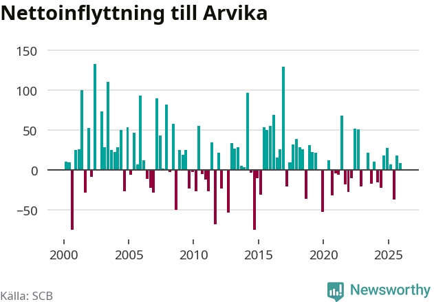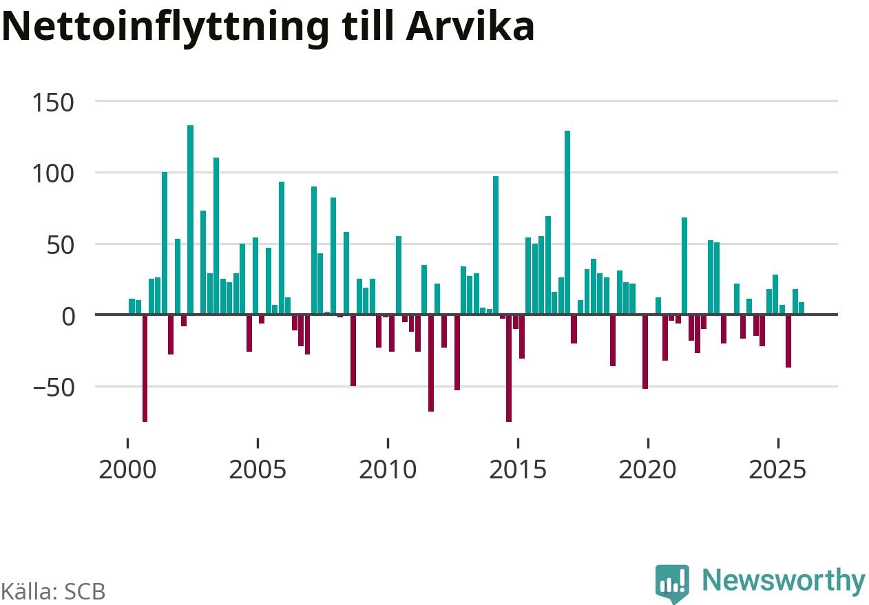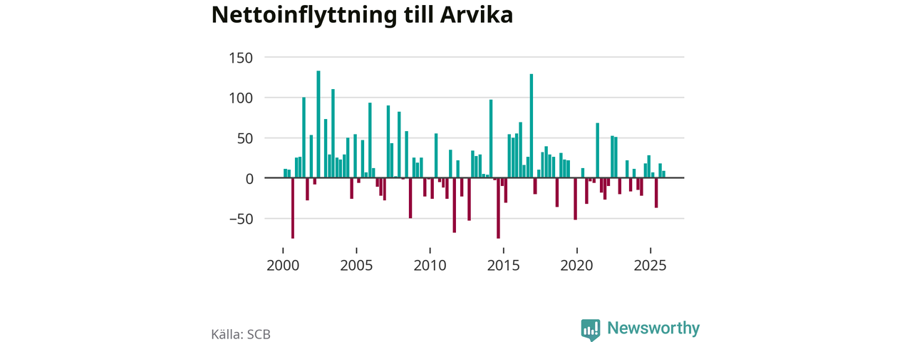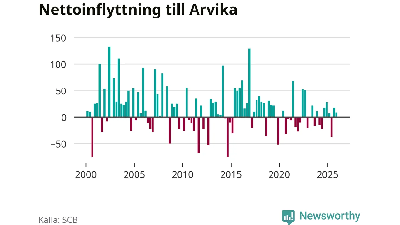 Under fjärde kvartalet 2025 flyttade 182 personer till kommunen medan 173 personer flyttade därifrån. Sedan seklets början har Arvika oftast haft ett positivt flyttnetto, inklusive det senaste kvartalet.