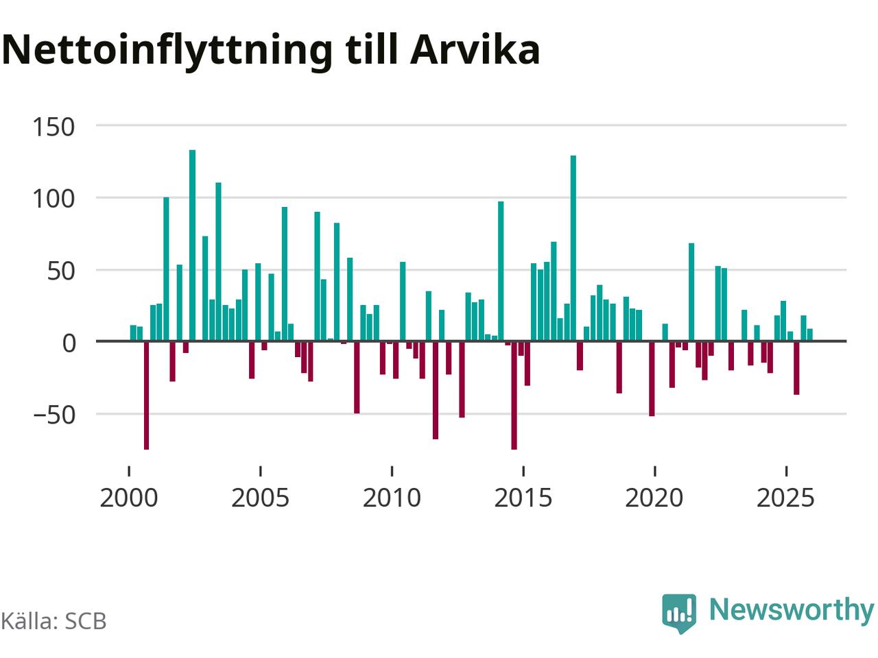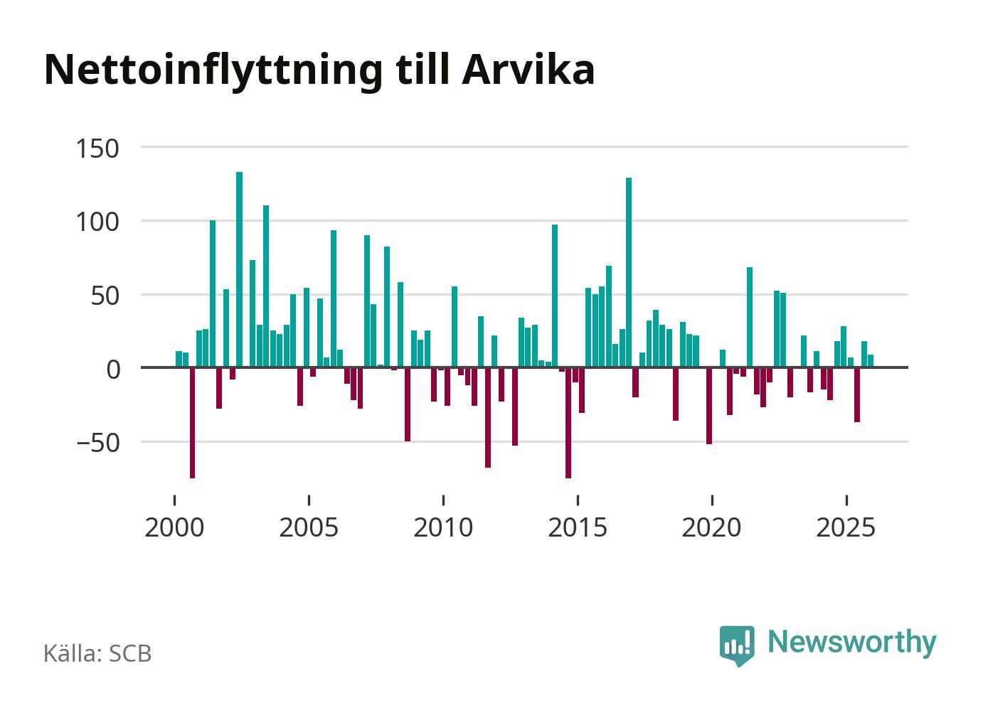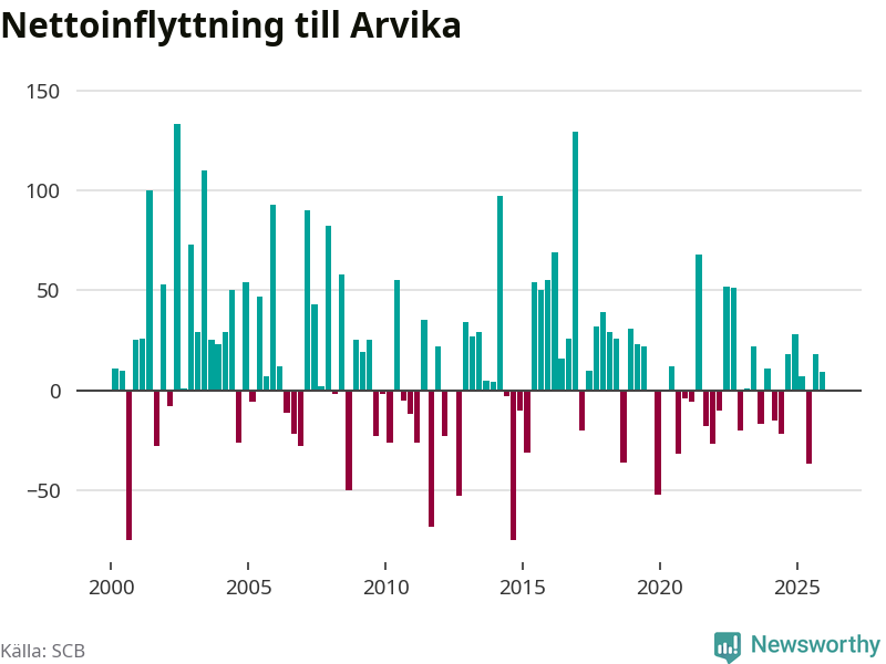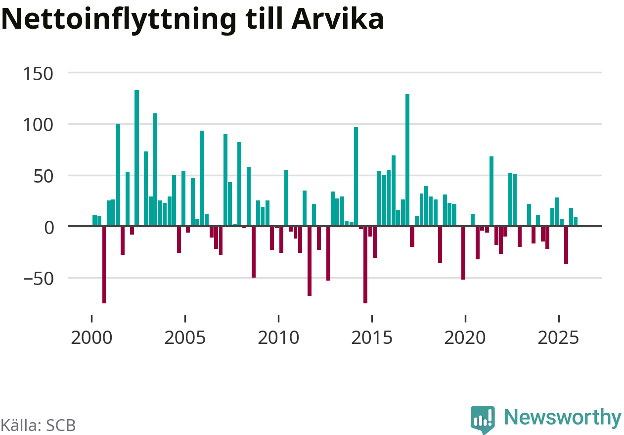 Under fjärde kvartalet 2025 flyttade 182 personer till kommunen medan 173 personer flyttade därifrån. Sedan seklets början har Arvika oftast haft ett positivt flyttnetto, inklusive det senaste kvartalet.