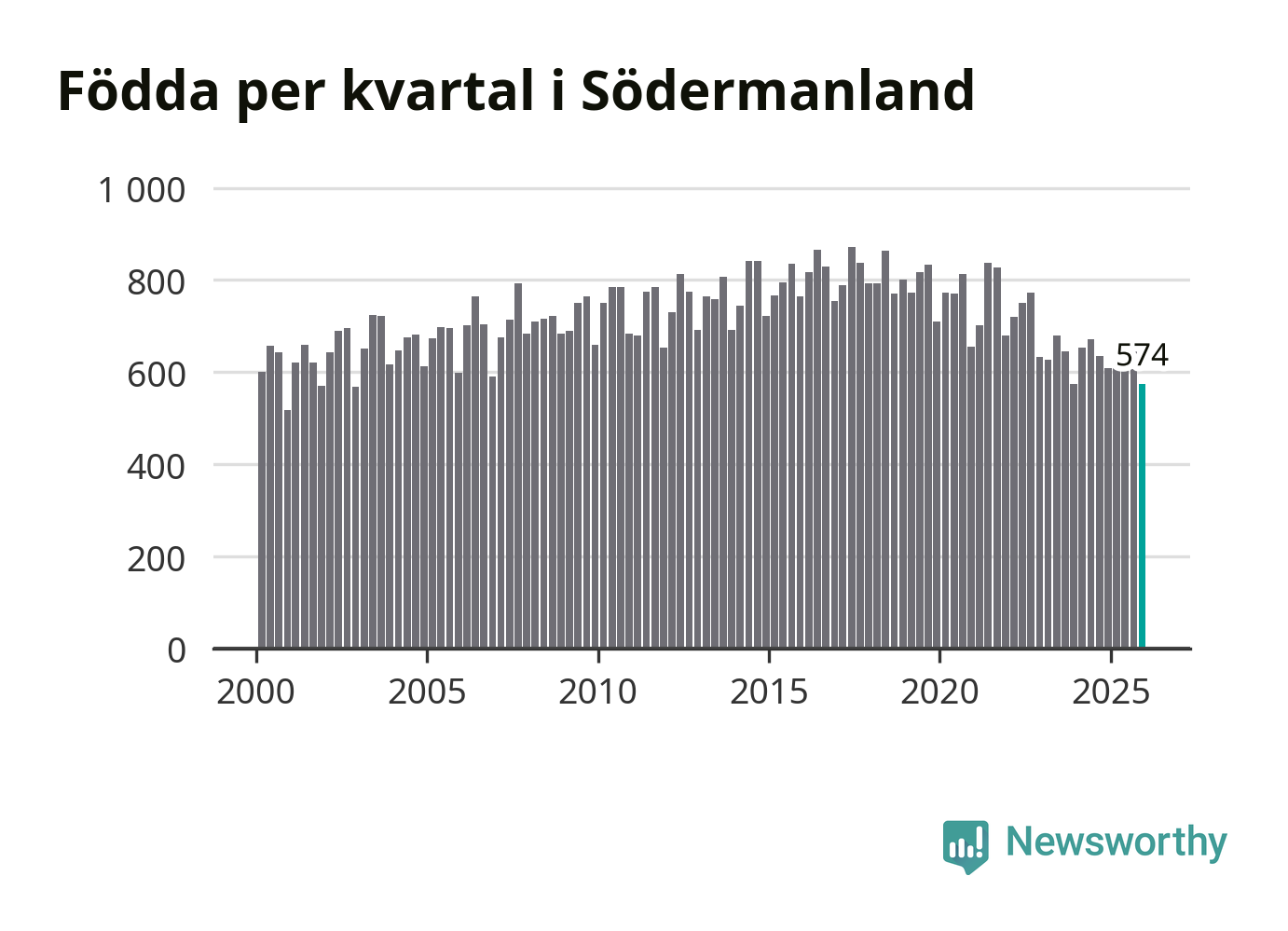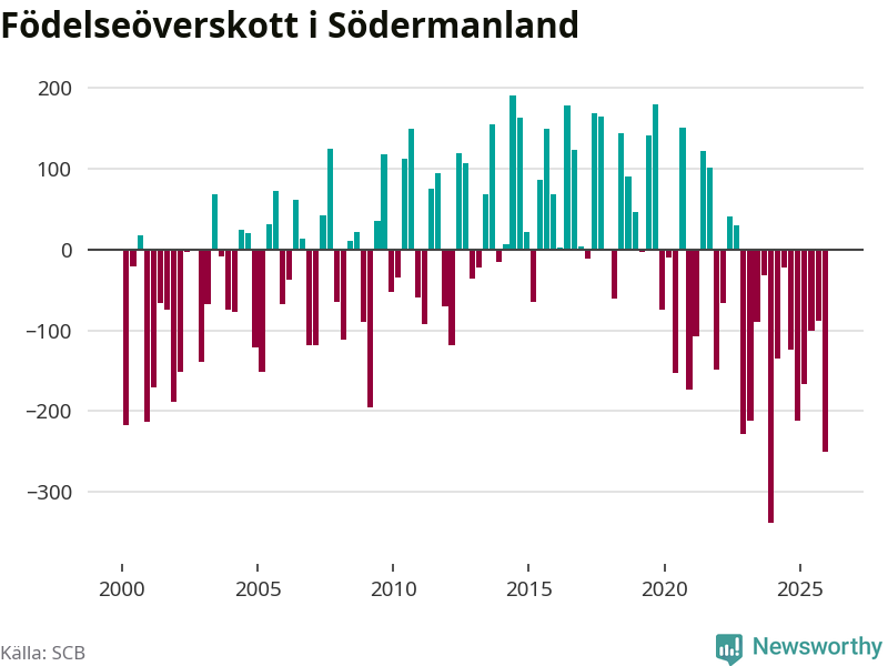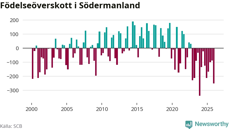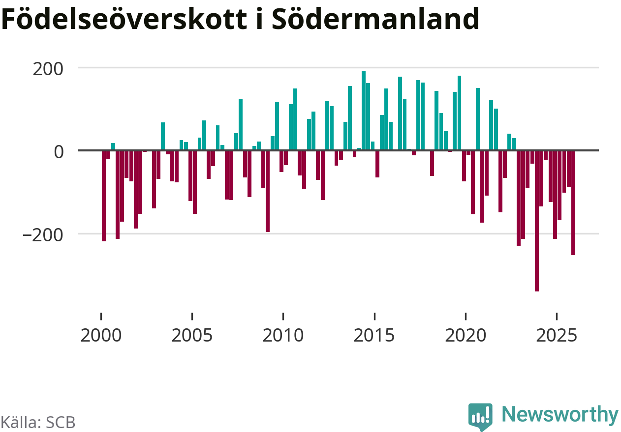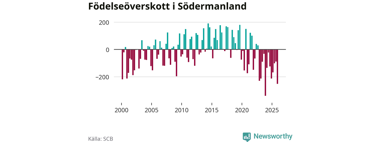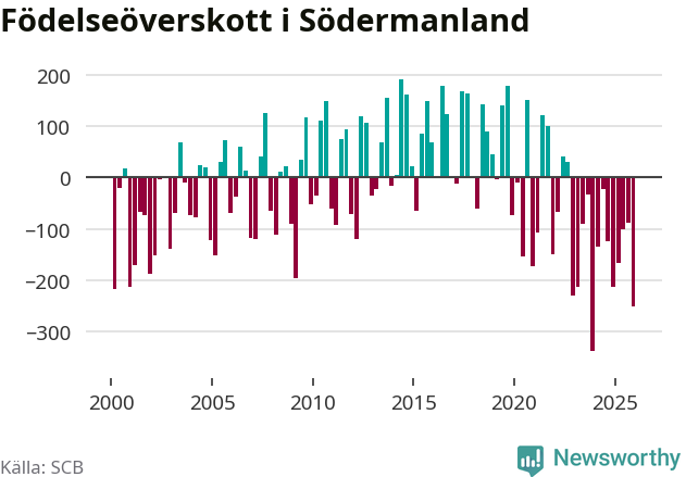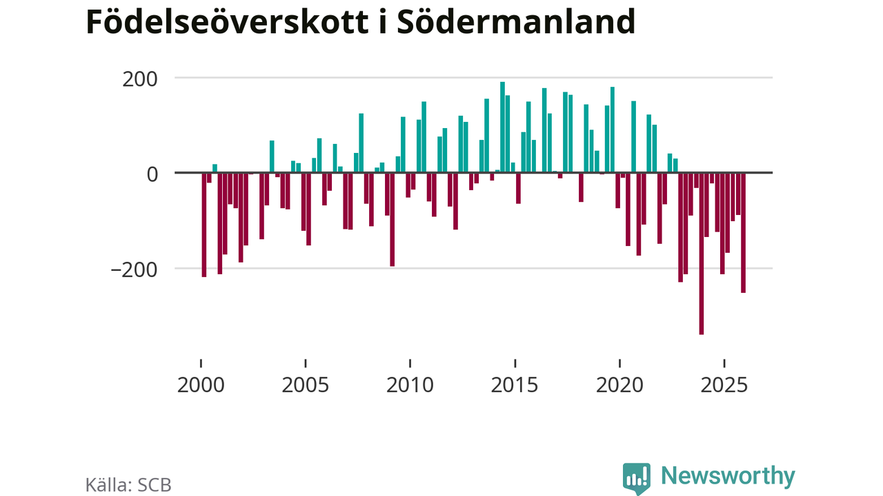 Enligt SCB:s siffror föddes 574 barn i Södermanland under det senaste kvartalet. Samtidigt avled 825 personer. Södermanland hade alltså ett negativt födelsenetto, vilket länet historiskt sett oftast har haft.