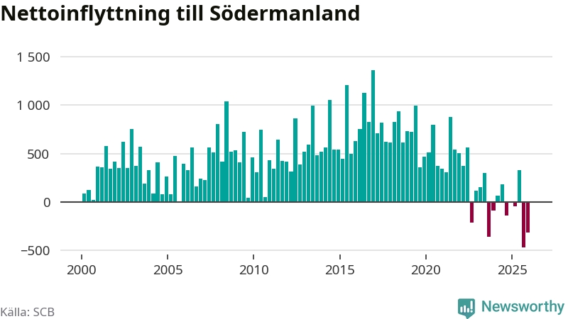 Under fjärde kvartalet 2025 flyttade 2 262 personer till länet medan 2 579 personer flyttade därifrån. Sedan seklets början har Södermanland haft ett positivt flyttnetto under nästan alla kvartal.