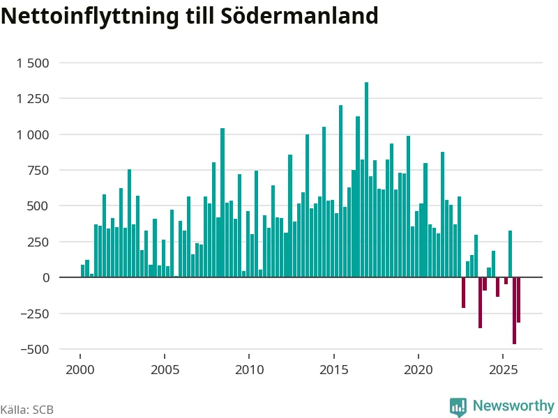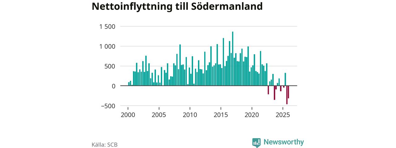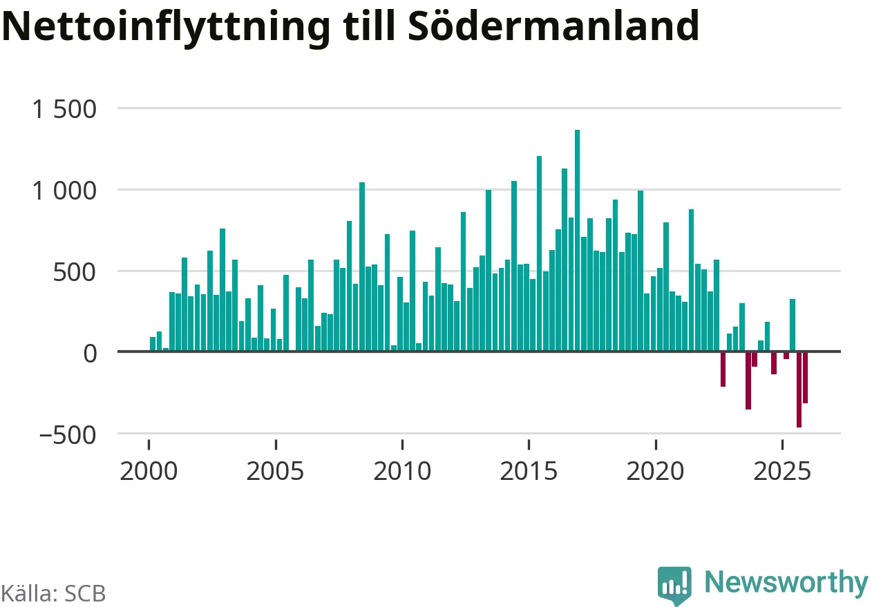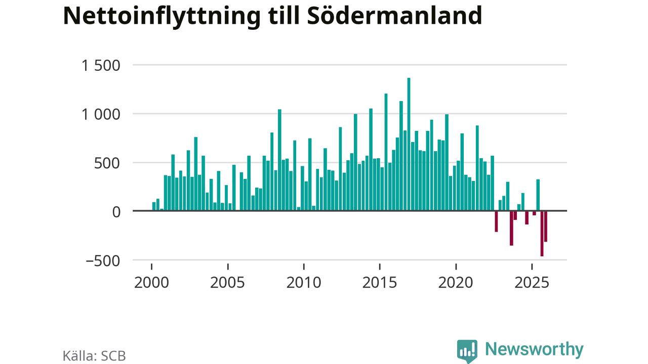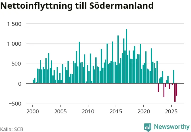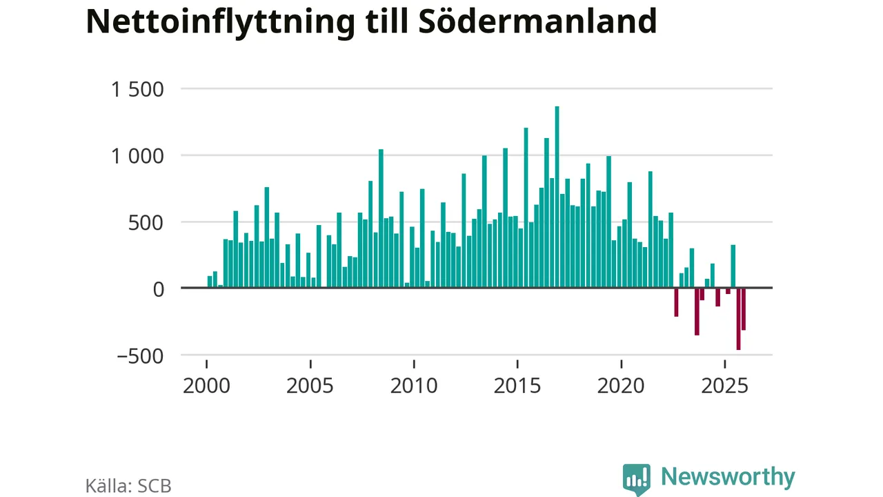 Under det fjärde kvartalet 2025 minskade befolkningen med i Södermanlands län 550 personer, visar nya siffror från SCB. Det är den största minskningen under ett enskilt kvartal sedan åtminstone sekelskiftet.