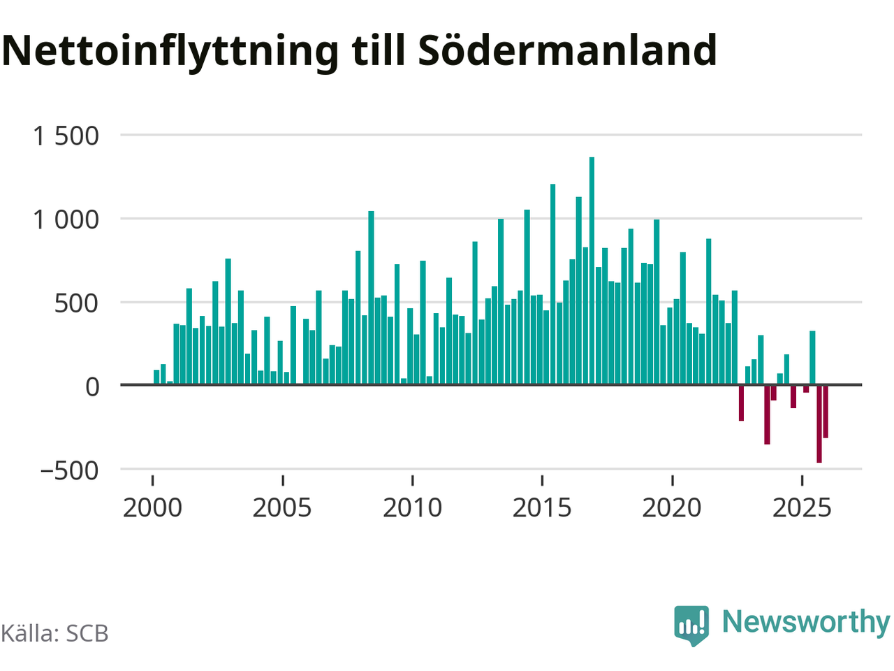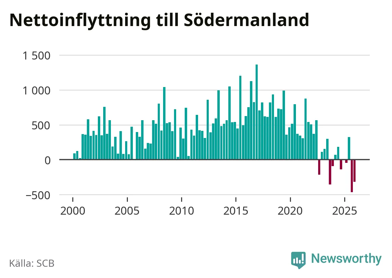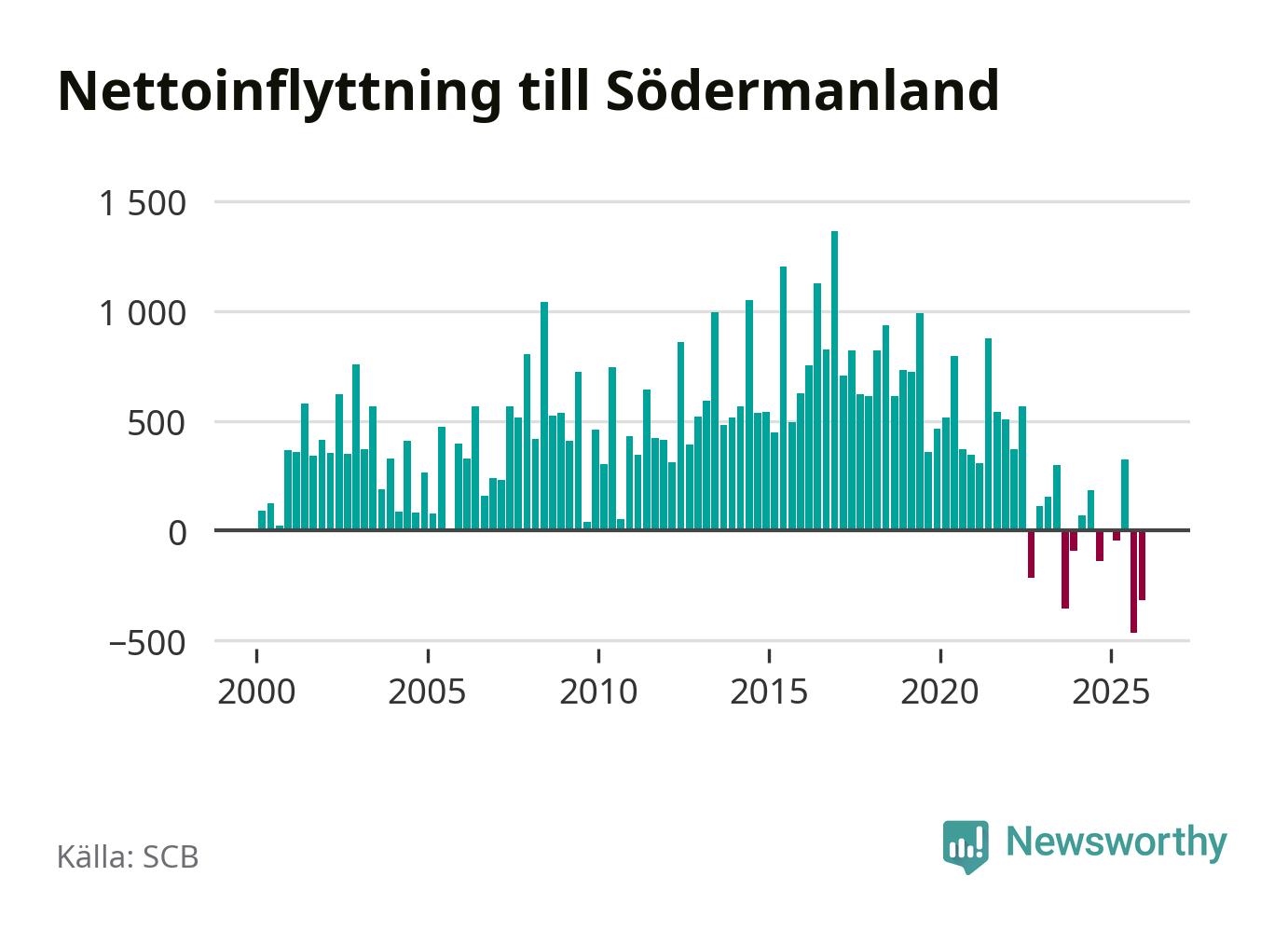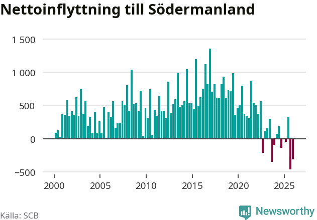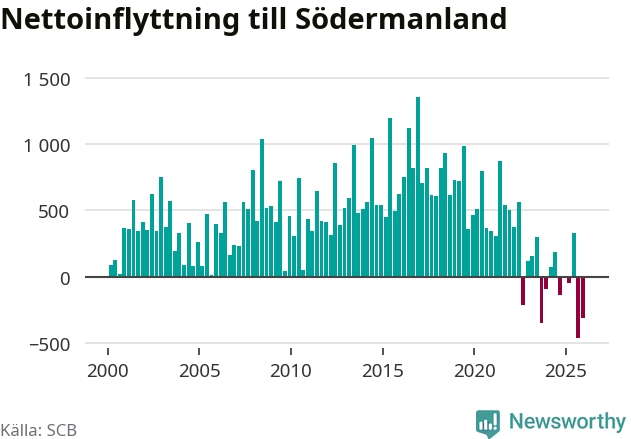 Under det fjärde kvartalet 2025 minskade befolkningen med i Södermanlands län 550 personer, visar nya siffror från SCB. Det är den största minskningen under ett enskilt kvartal sedan åtminstone sekelskiftet.